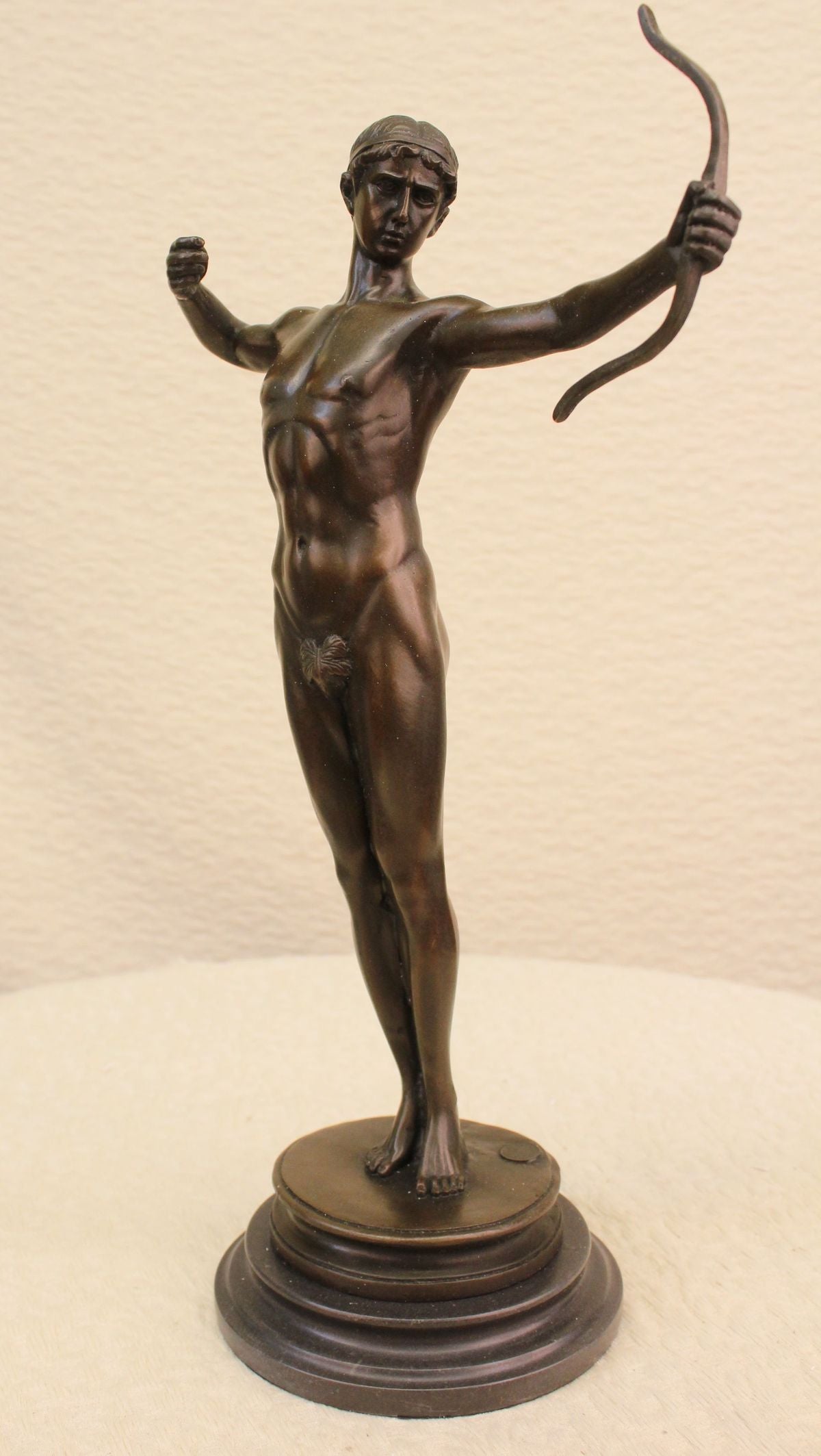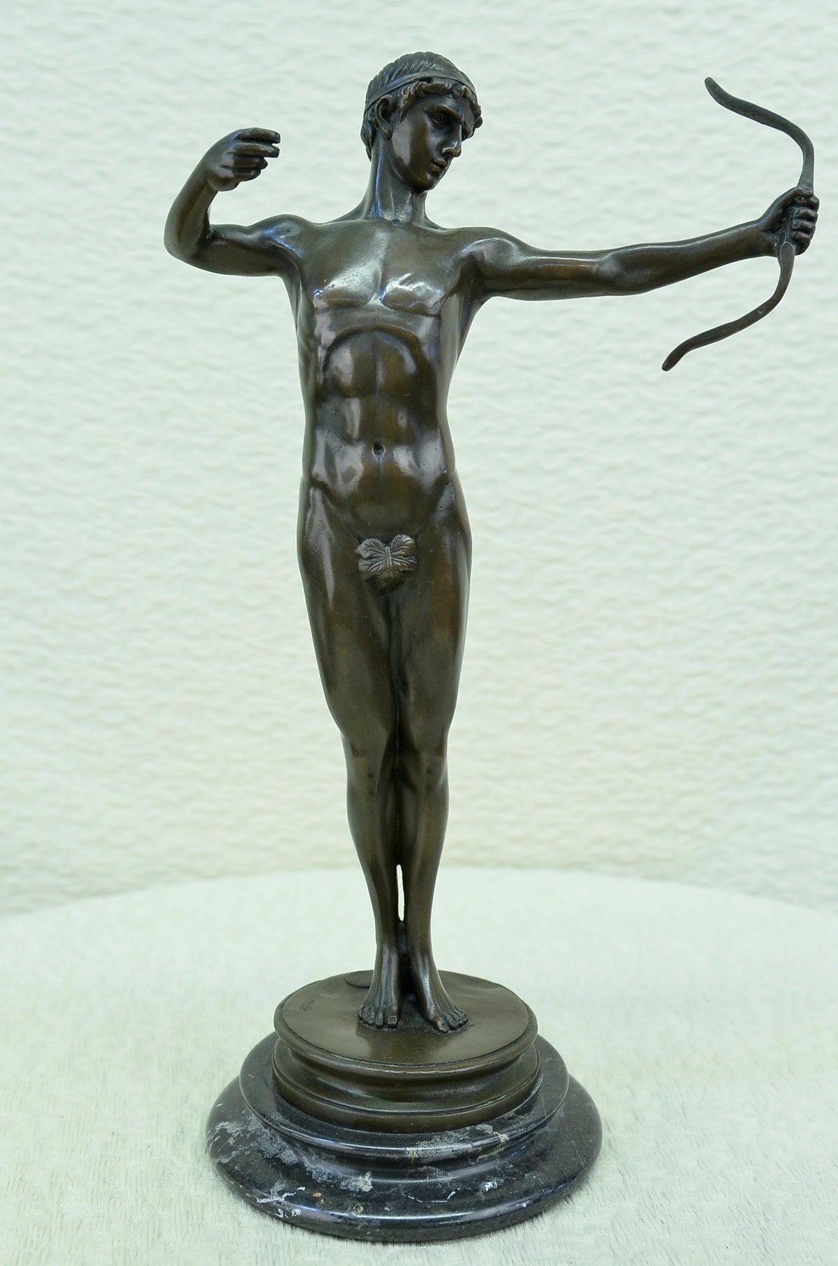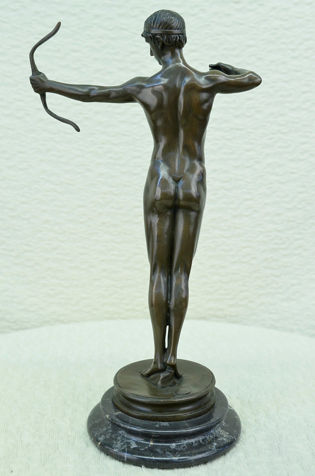 Here A Man Pulls His Bow Tight And Releases Letting His Arrow Fly Through The Windy Air With Might. A Fig Leaf Covers His Privates As He Executes Perfection In His Shot And Perfect Posture. His Hair Is Curly And Is Held In Place By A Head Baden That Wraps Around His Head. He Has A Finely Proportioned Body And Nicely Chiseled Abs. His Face Is Angelic Yet Still Very Manly. This Bronze Sculpture Is A Perfect Sculpture To Place On Any Shelf, Table Or Mantle. It Is Sure To Liven Up Any Living Space You Have And Give It That Classical Feel You Are Searching For. This Sculpture Was Cast Using The "Lost Wax Method" And Has A Brown Patina. It Is Mounted On A Marble Base And Is Signed M. Mercie.Original or Reproduction: Reproduction