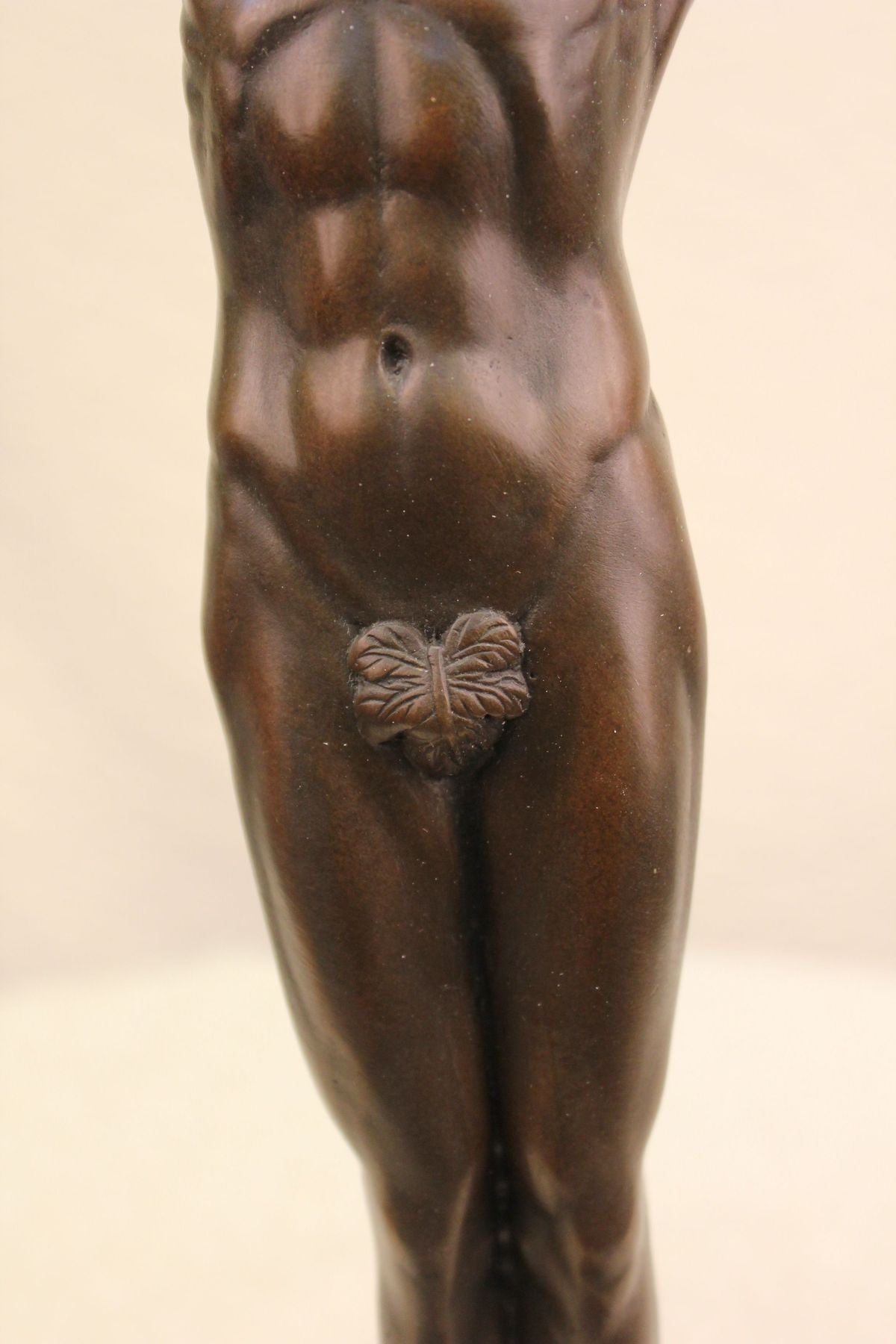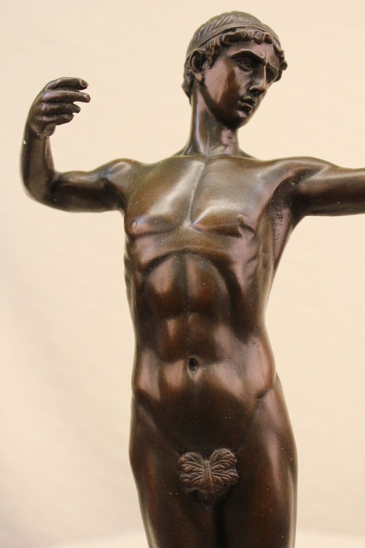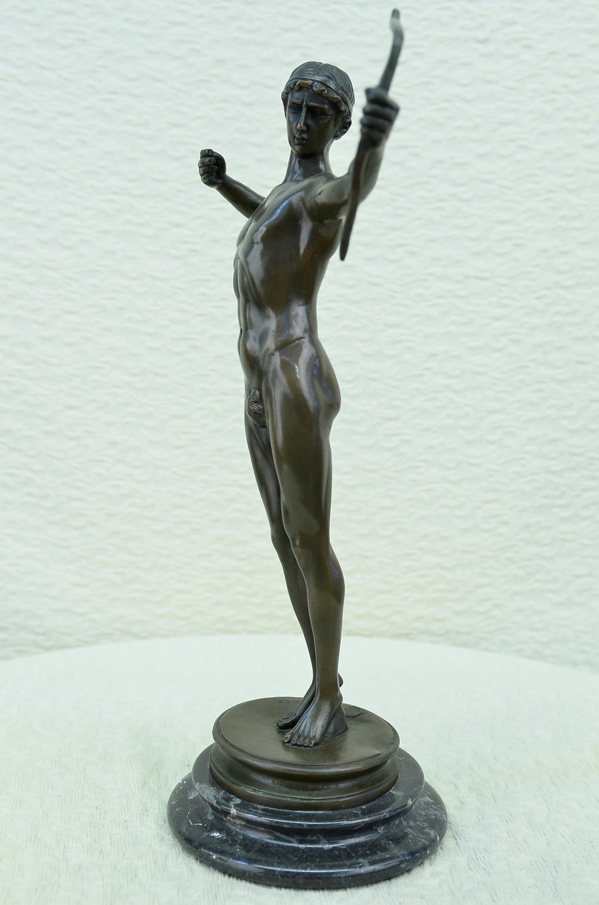 Here A Man Pulls His Bow Tight And Releases Letting His Arrow Fly Through The Windy Air With Might. A Fig Leaf Covers His Privates As He Executes Perfection In His Shot And Perfect Posture. His Hair Is Curly And Is Held In Place By A Head Baden That Wraps Around His Head. He Has A Finely Proportioned Body And Nicely Chiseled Abs. His Face Is Angelic Yet Still Very Manly. This Bronze Sculpture Is A Perfect Sculpture To Place On Any Shelf, Table Or Mantle. It Is Sure To Liven Up Any Living Space You Have And Give It That Classical Feel You Are Searching For. This Sculpture Was Cast Using The "Lost Wax Method" And Has A Brown Patina. It Is Mounted On A Marble Base And Is Signed M. Mercie.Original or Reproduction: Reproduction