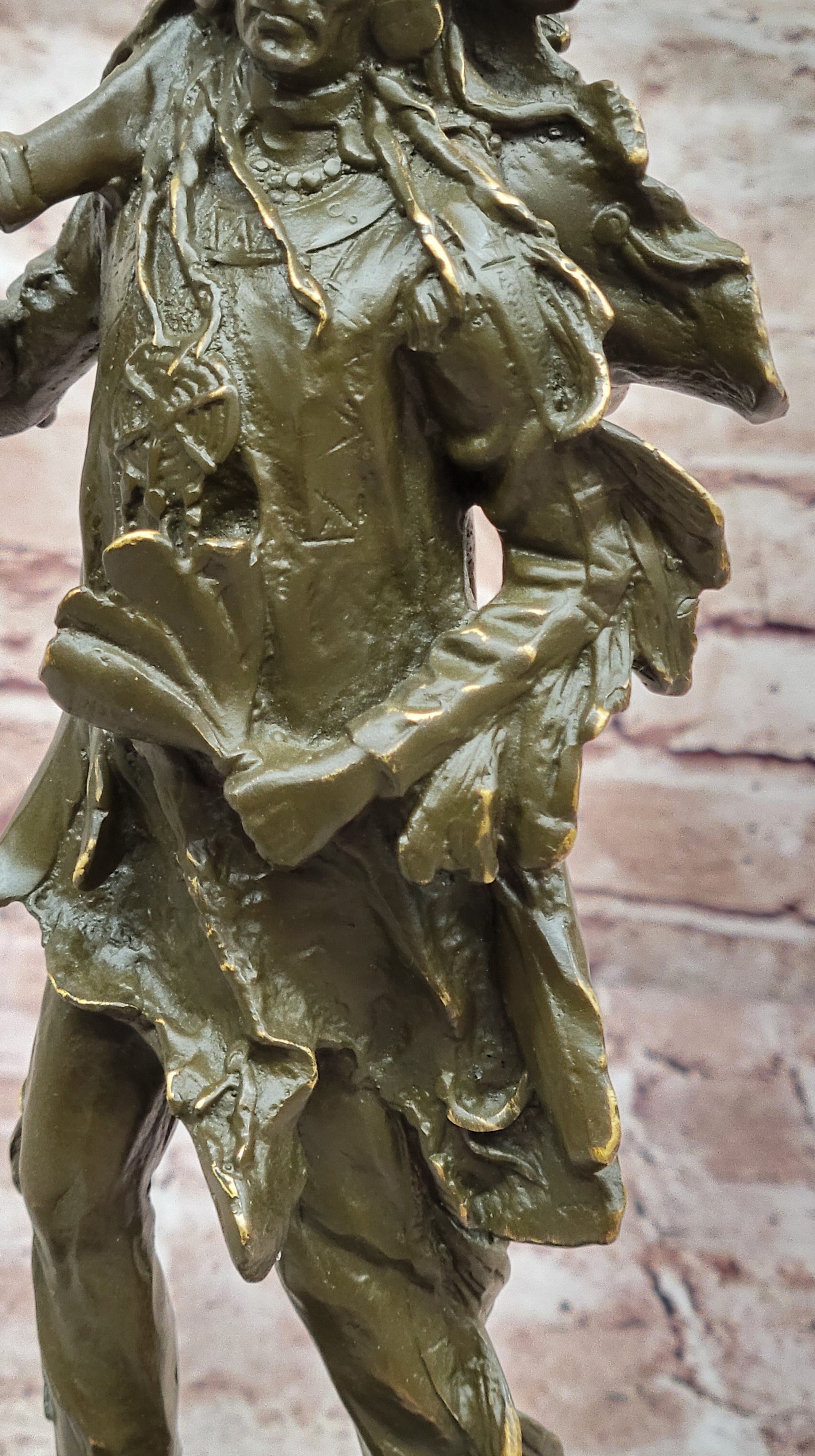 Handcrafted using the lost wax method, this solid bronze figure showcases exceptional texture and definition, from the flowing feathers of the headdress to the folds in the figure's garment. The rich brown patina enhances the depth and adds a warm, aged quality, complementing the piece’s historical essence.