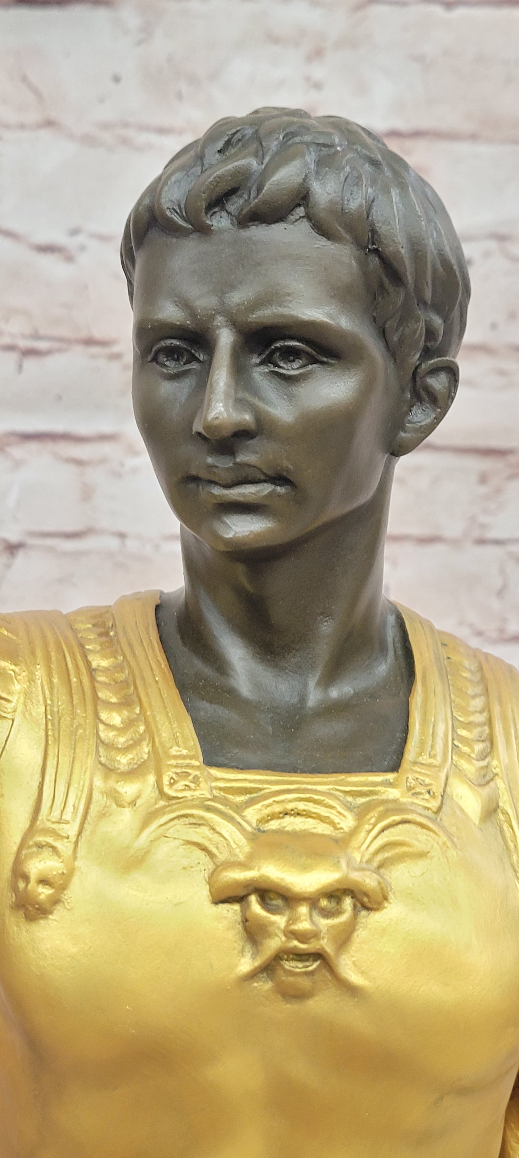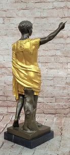 This impressive bronze sculpture of Roman Emperor Caesar Augustus captures the dignity, authority, and timeless power of one of history’s greatest leaders. Sculpted in a classical style, the figure reflects Roman imperial elegance, enhanced by a warm brown patina and gold accents on the emperor’s garments, creating a striking visual contrast.