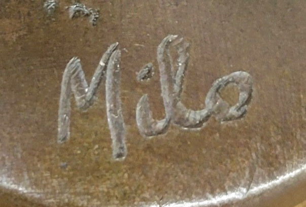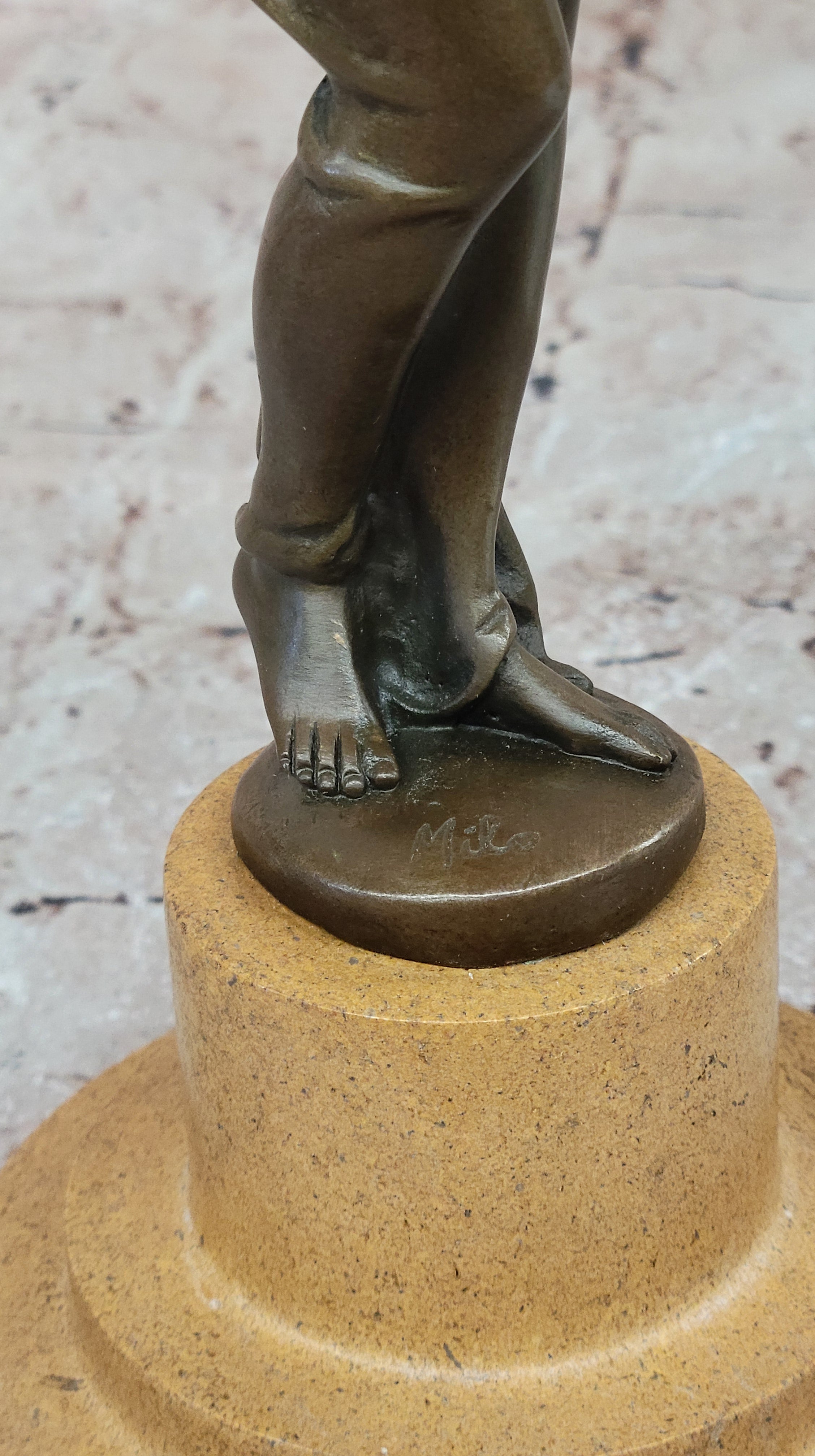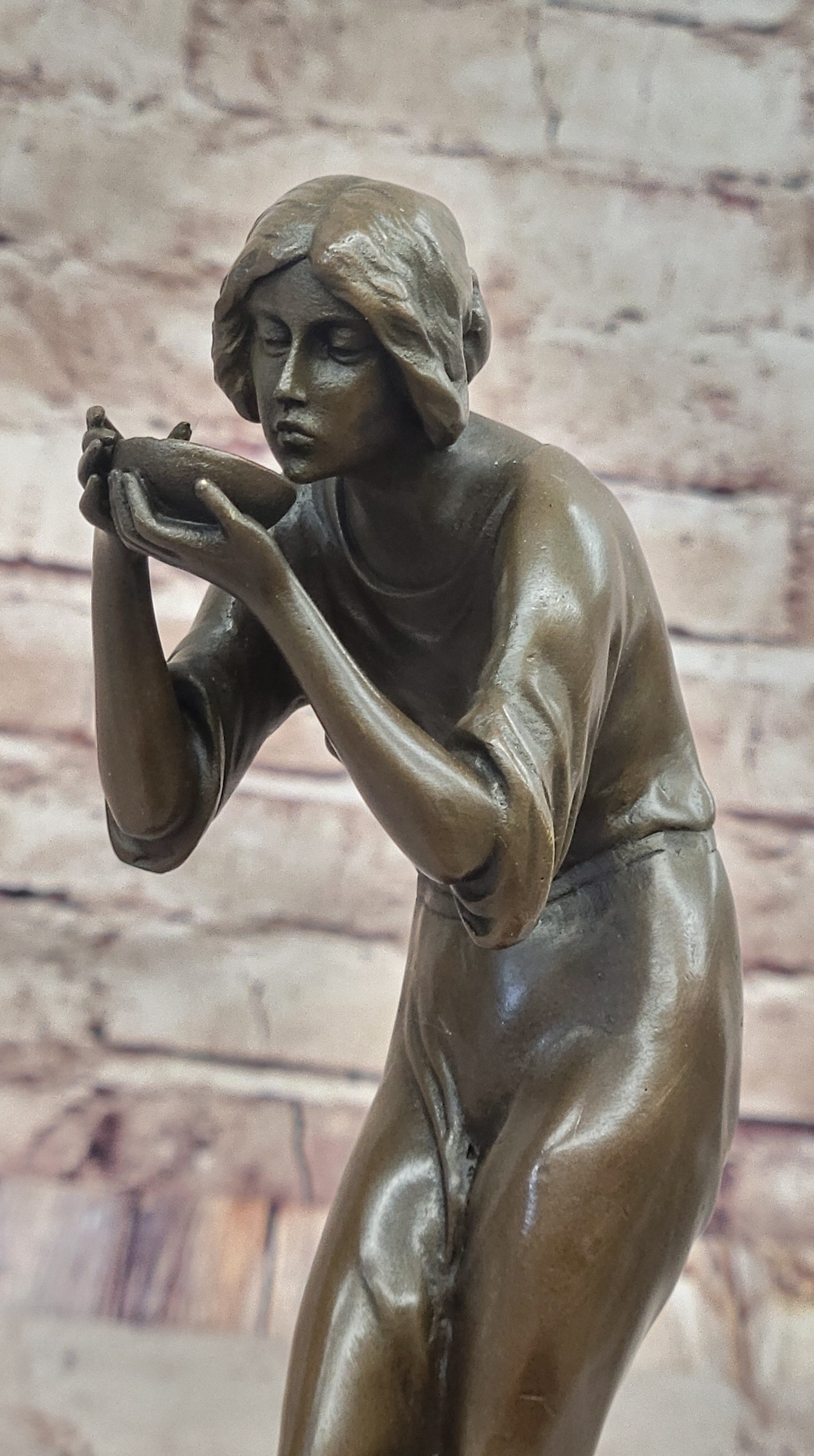 This captivating bronze figurine portrays a woman in a hunched position, deeply engrossed in the act of drinking from a bowl. Her elegant gown drapes and contours to her body, seamlessly merging with the base as her bare feet delicately touch the surface. With her hair pulled back, her face becomes the focal point, revealing intricate details that capture her expression. Her downcast eyes reflect her concentration on the task at hand, ensuring that the precious contents of the bowl remain steady. She appears famished, her other hand bracing the bowl to prevent any spillage. The artist has crafted this piece with meticulous attention to detail, capturing the authenticity of the scene. The artisan's signature graces the base, further enhancing its value and authenticity. Cast using the time-honored technique of the lost wax method, this bronze figurine exhibits exceptional quality and craftsmanship. It stands proudly on a peach marble base, adding a touch of sophistication to its overall presentation. This striking sculpture will undoubtedly be a fabulous addition to any space, exuding a sense of grace, beauty, and a captivating narrative. As a timeless treasure, it is bound to be cherished and admired for years to come, becoming a centerpiece of admiration and conversation.