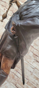 This exquisite bronze sculpture pays homage to an ancient Prussian Prince, a figure poised for battle and radiating regal splendor. Dressed in formidable royal armor, every meticulous detail of his attire has been artfully captured, from the intricate clasps and bolts adorning his chest and leg armor to the majestic trimming that befits royalty. His thick clasp-link belt holds the sheath for his sword, an emblem of his readiness for combat.