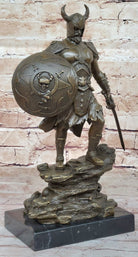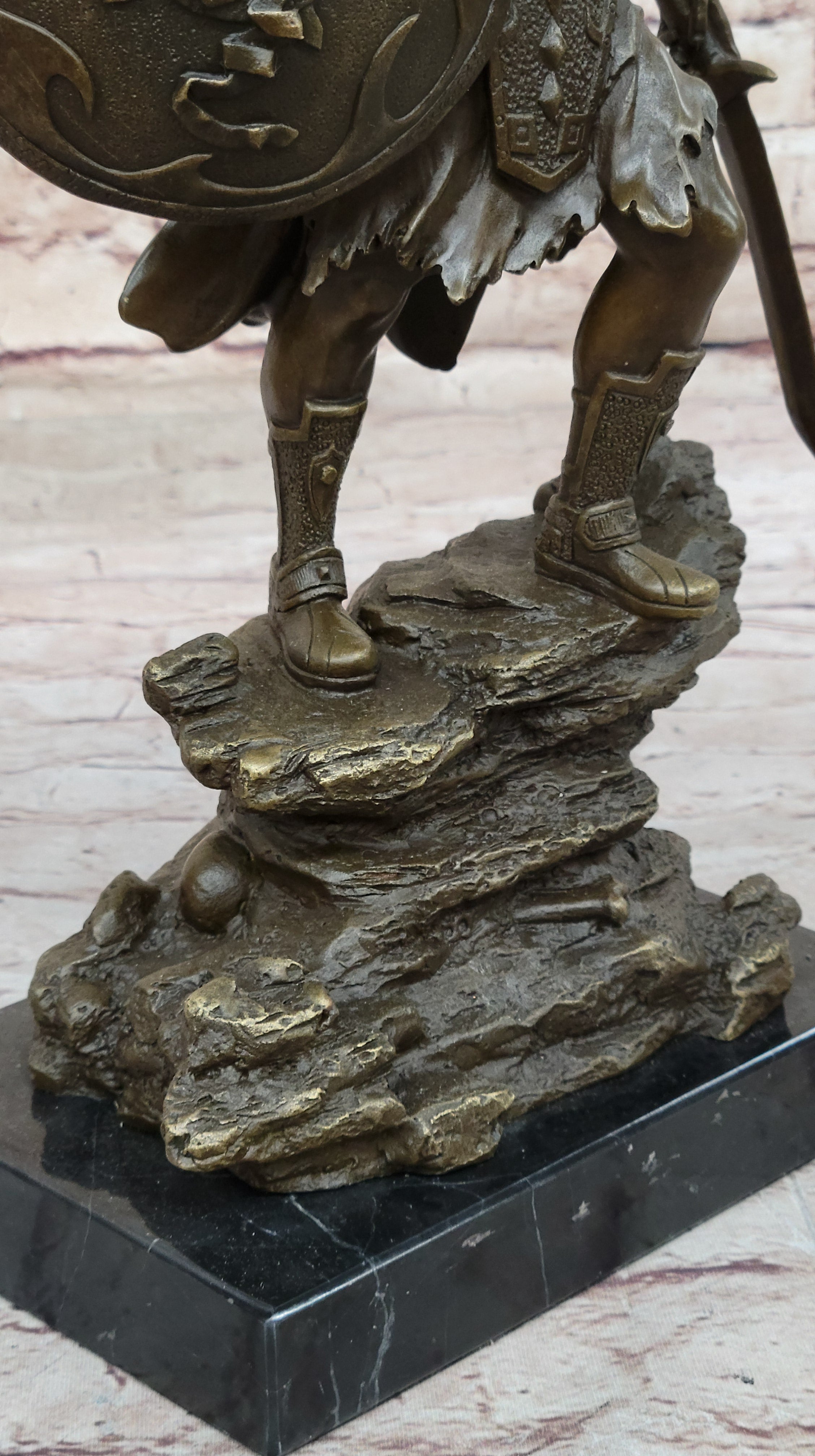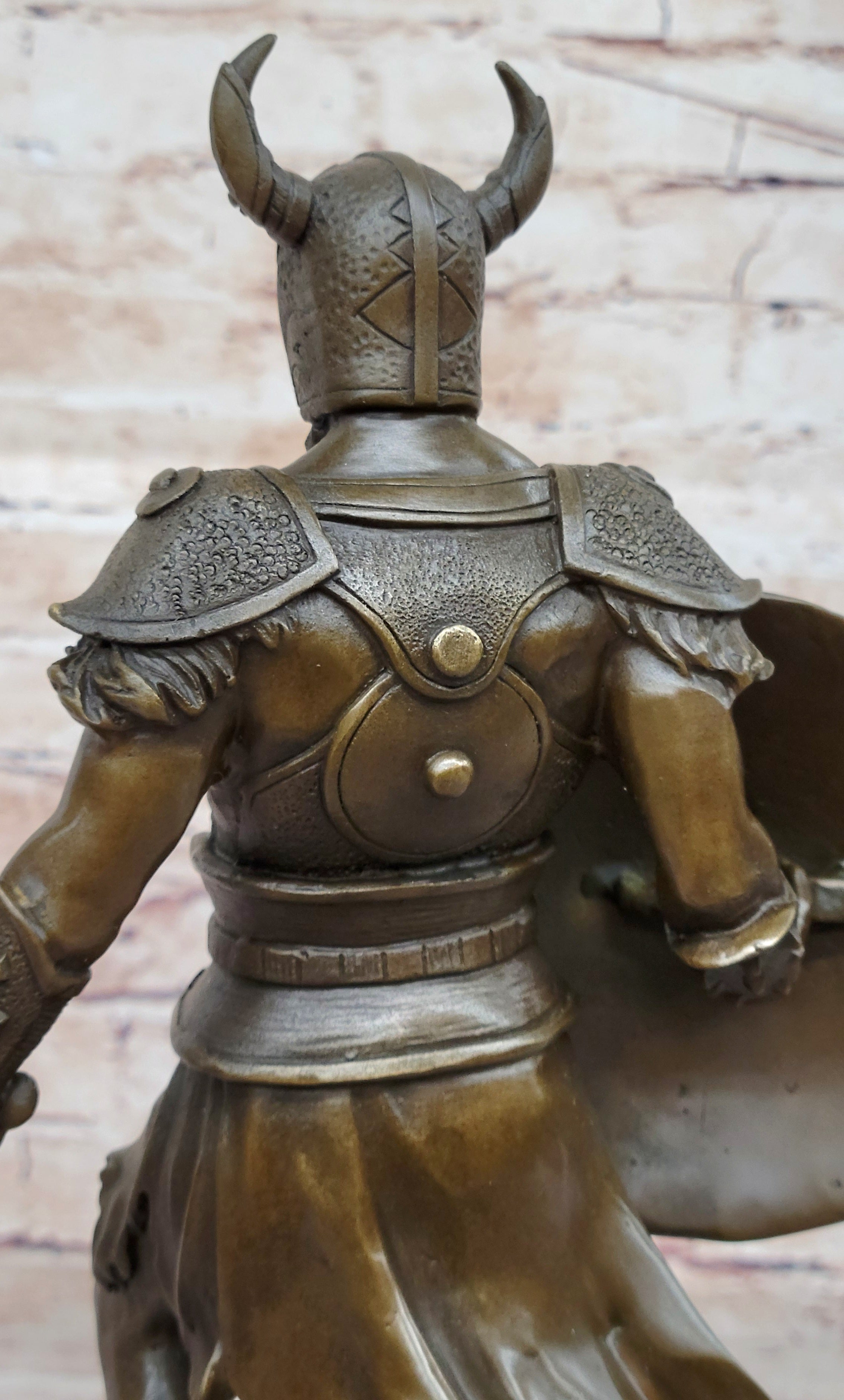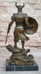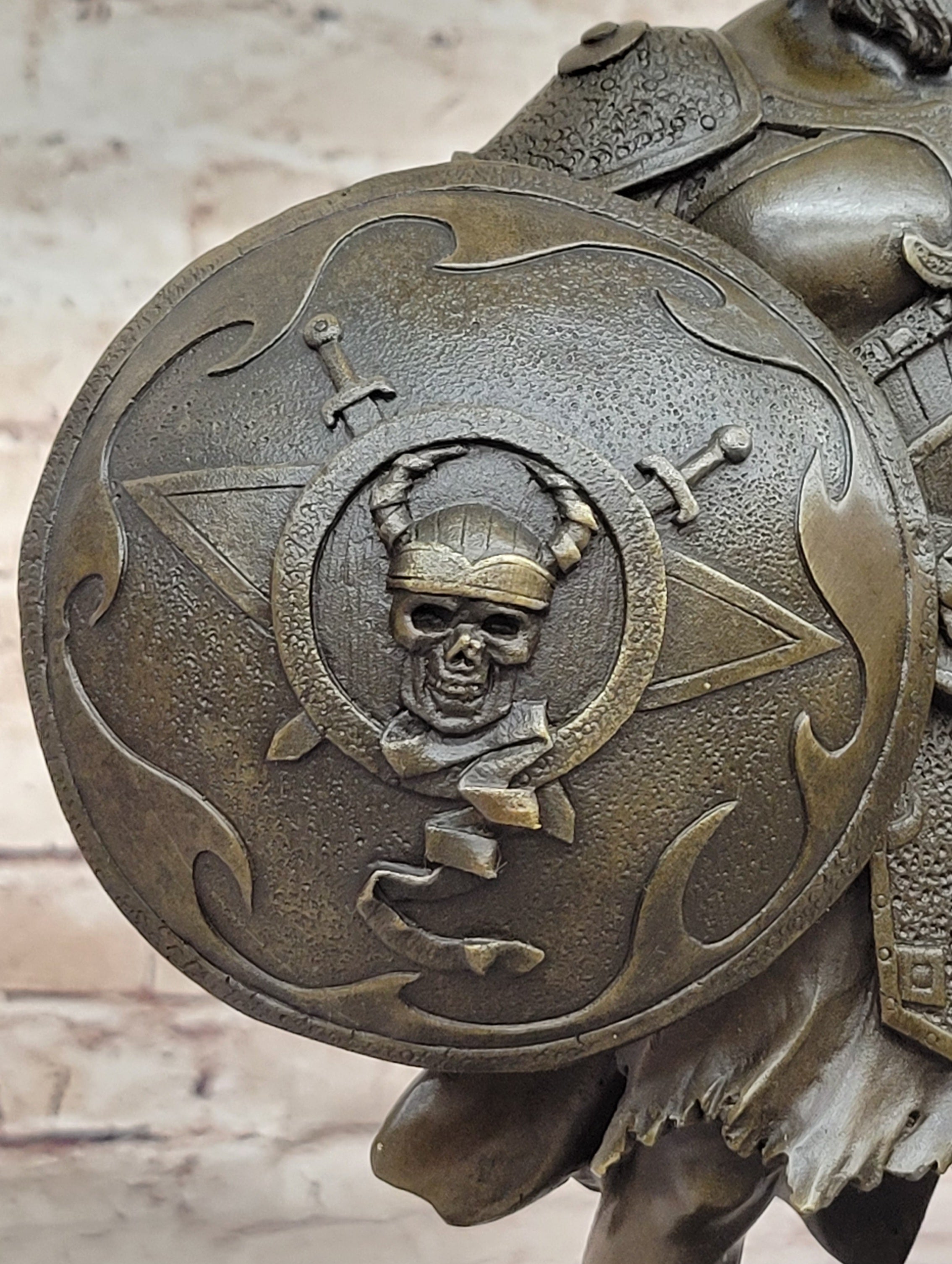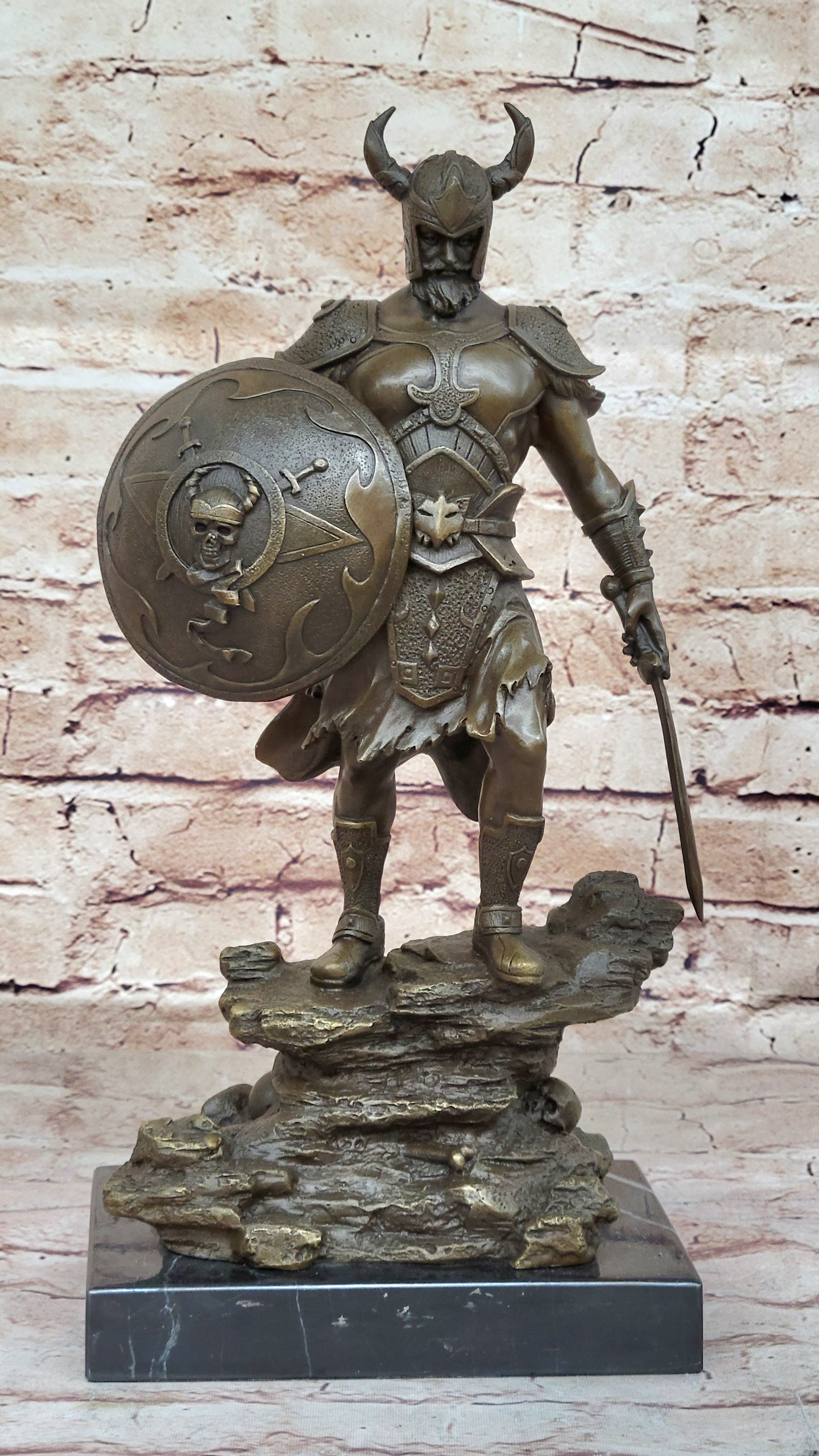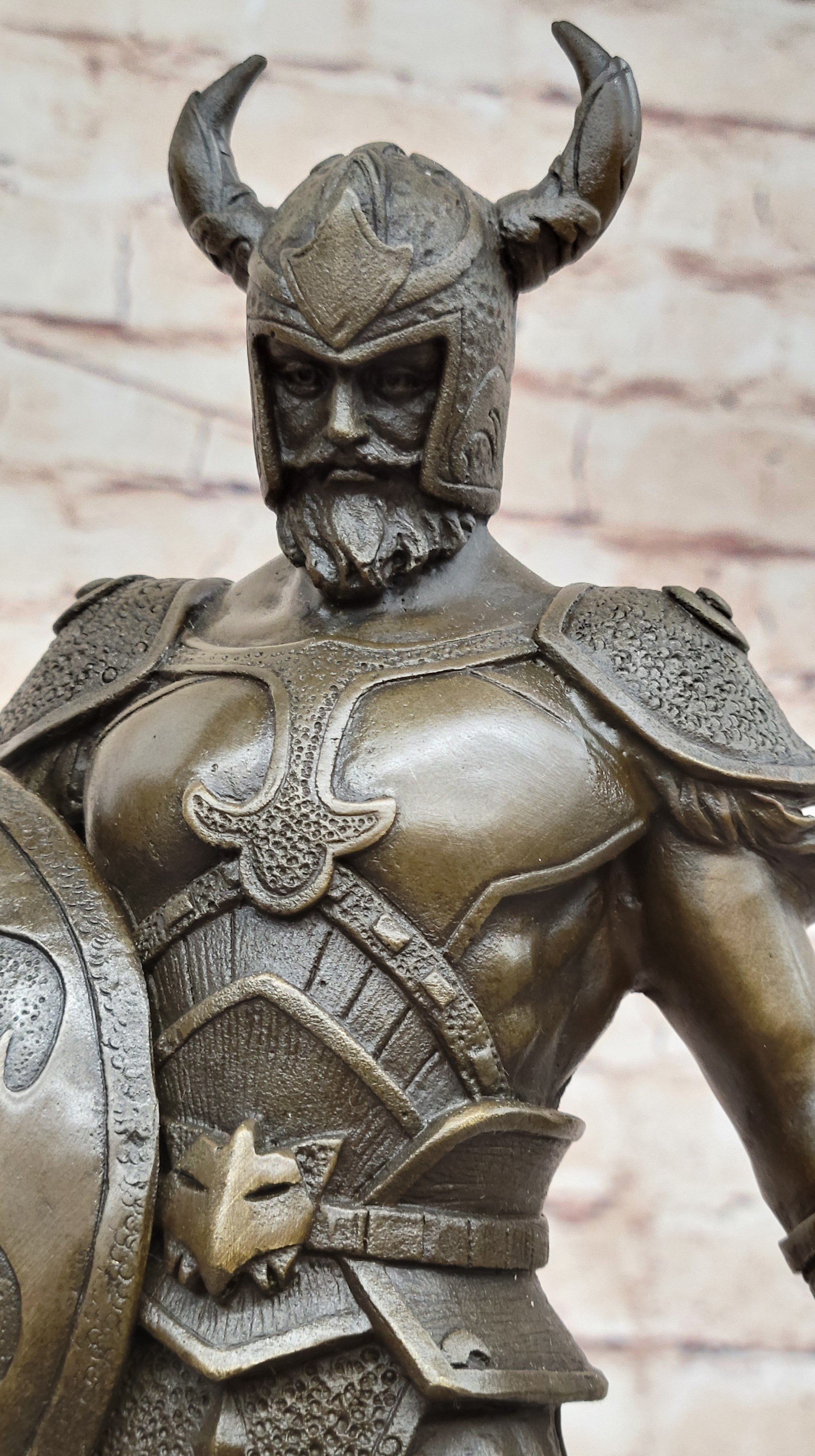 This striking bronze sculpture portrays a fearless Viking warrior in a dynamic fighting stance, ready to defend against any challenger. Every detail of this artwork speaks to the warrior's power and resilience, from his intricately designed armor and knee cap shields to the masterfully crafted helmet and weaponry. His confident expression exudes strength and determination, making this piece a captivating representation of Viking valor.