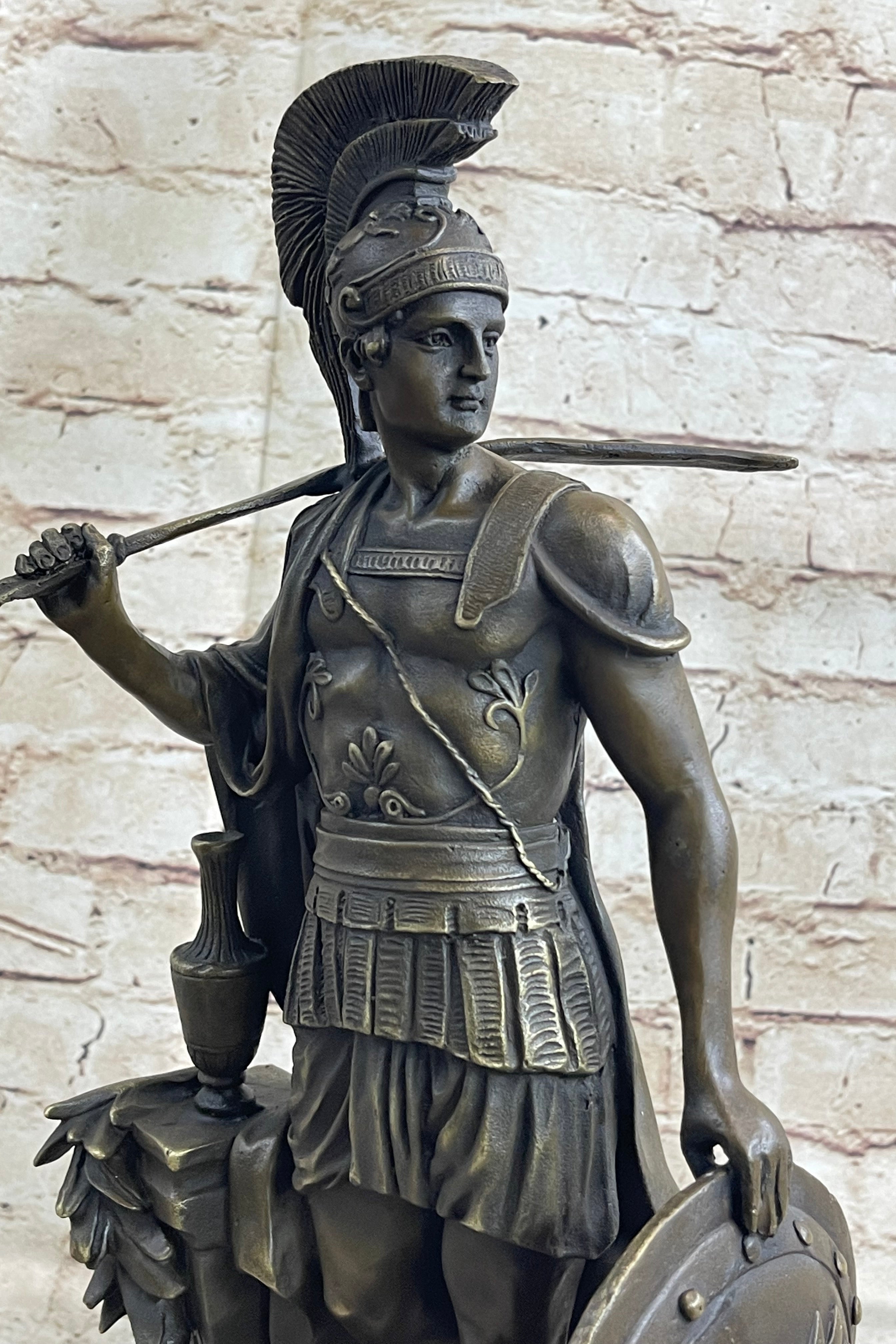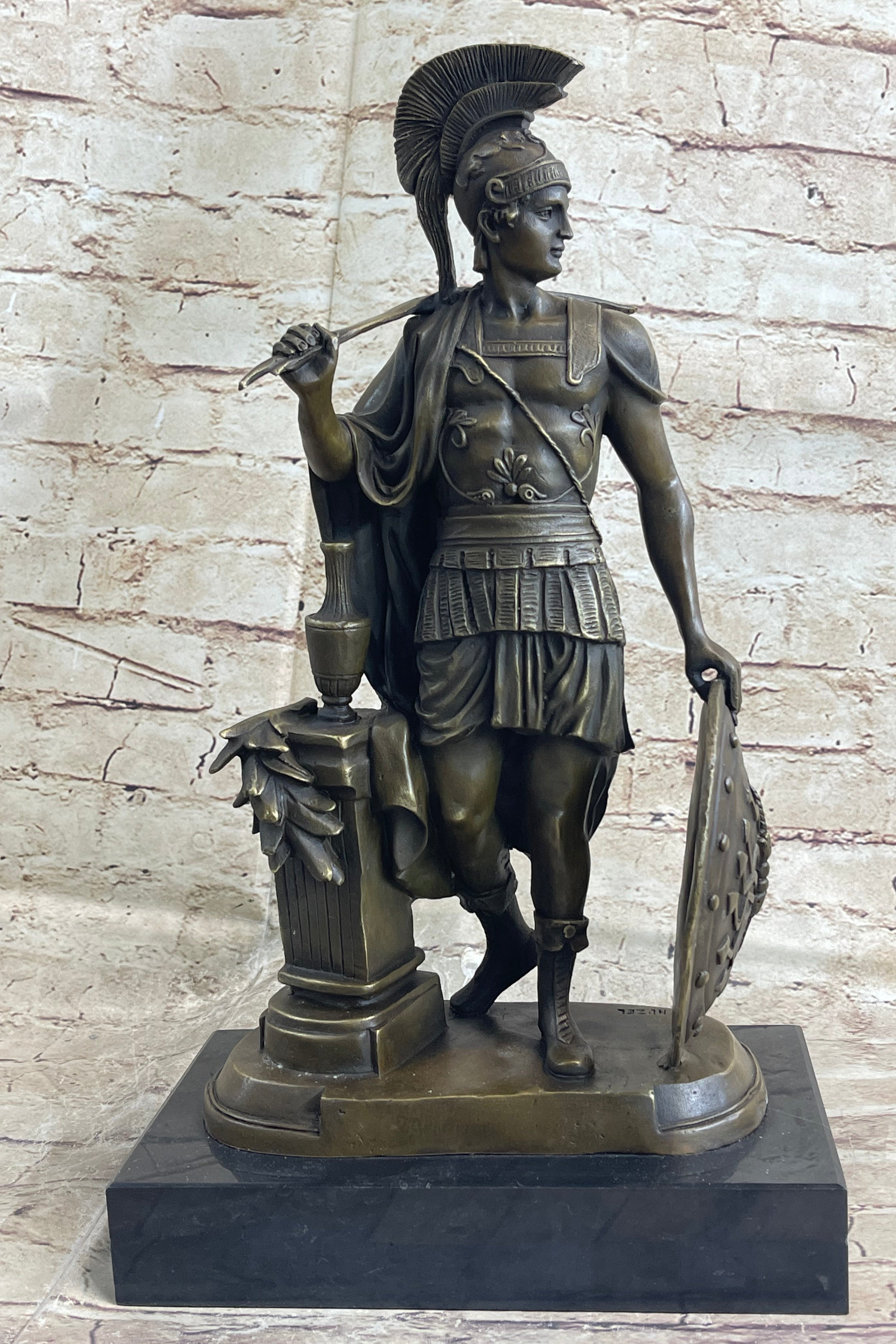 Embrace the spirit of ancient Rome with this stunning Roman legion soldier bronze sculpture. Whether displayed as a centerpiece in your home or as part of your art collection, it is sure to command attention and evoke a sense of awe. Immerse yourself in the legacy of the Roman empire and appreciate the enduring significance of this captivating artwork.Bronze Dimensions with Marble Base: Height 16" X Width 9.5"