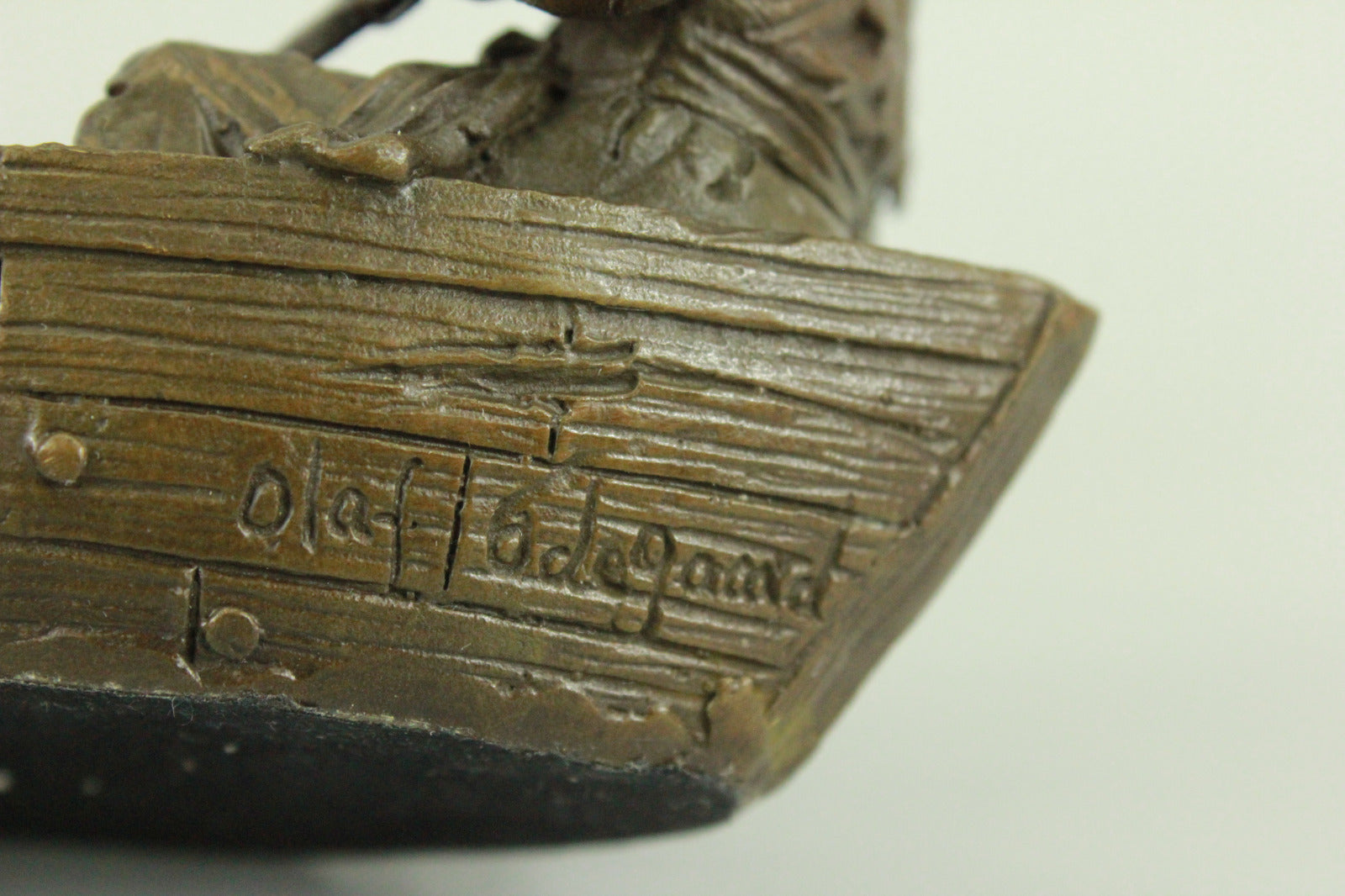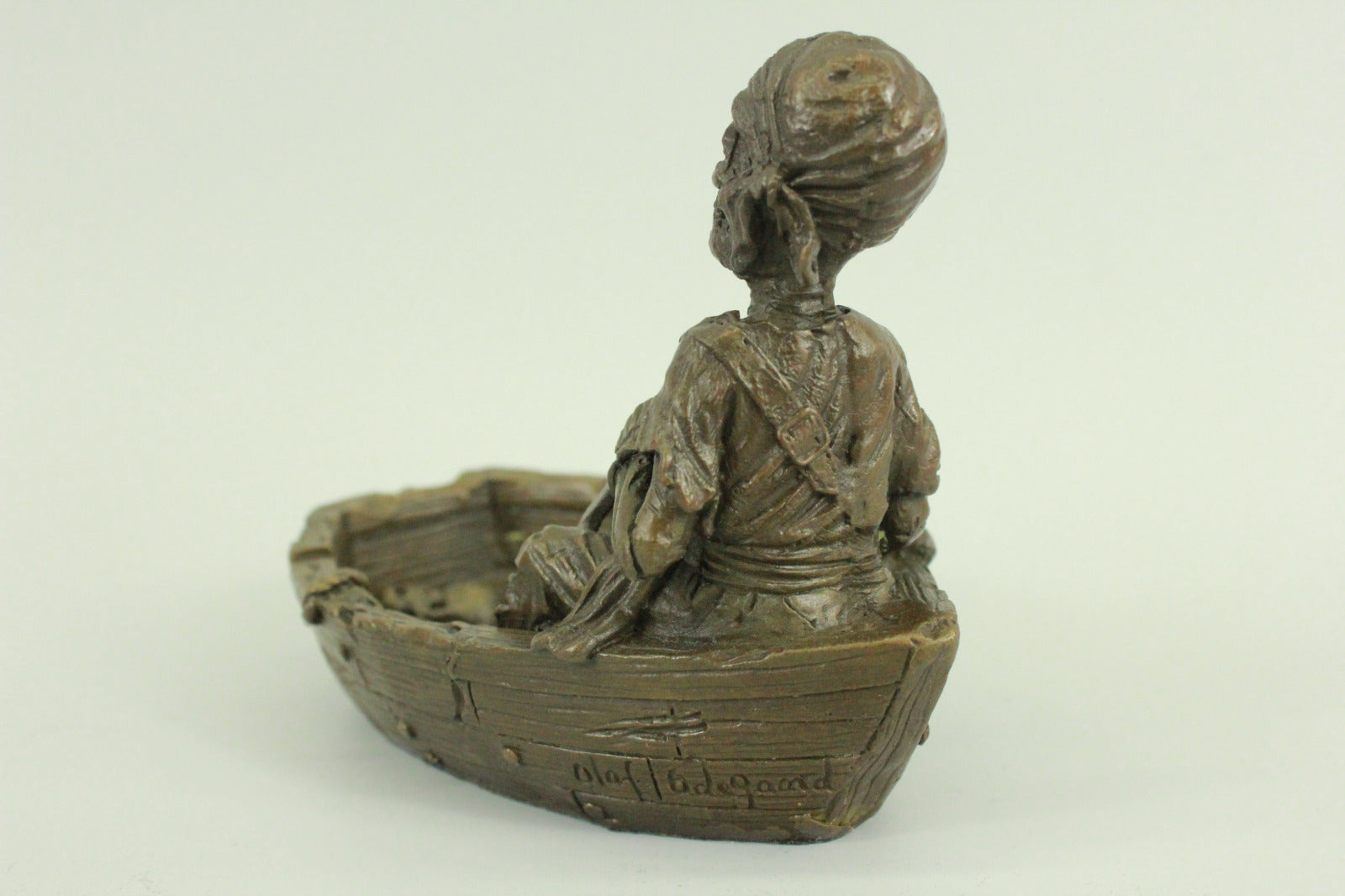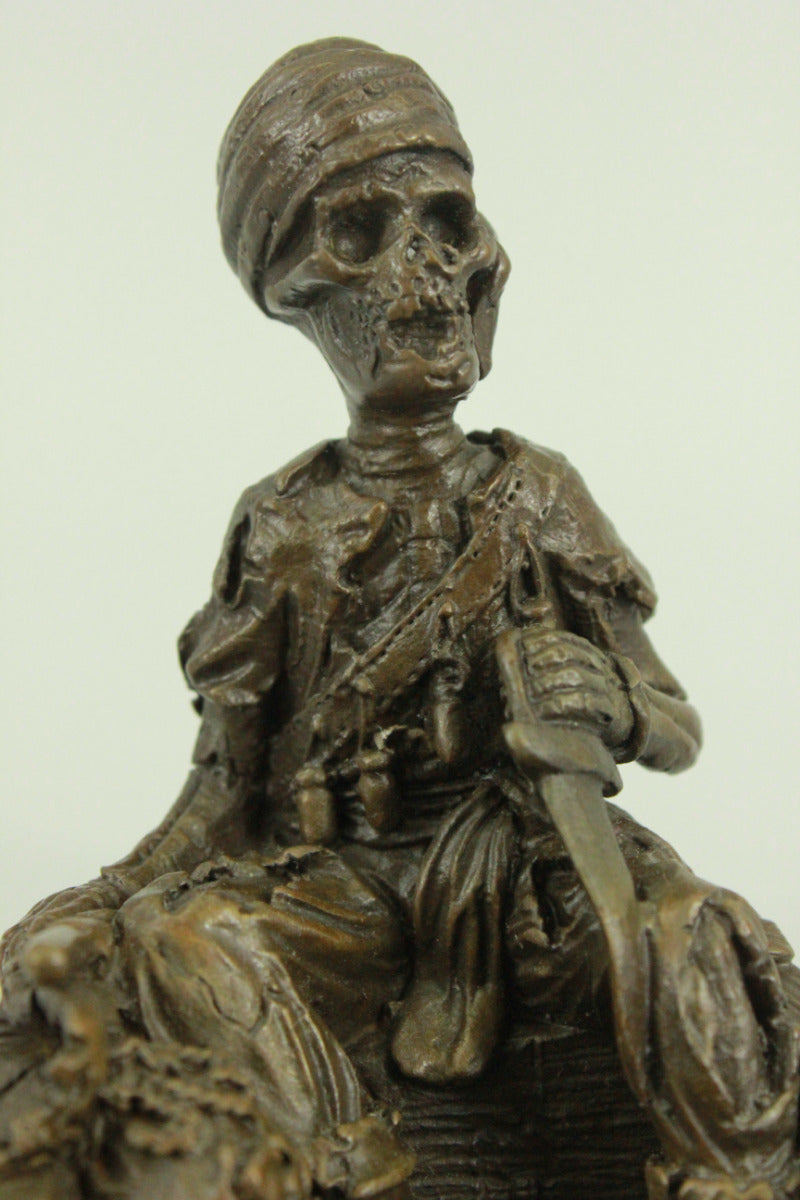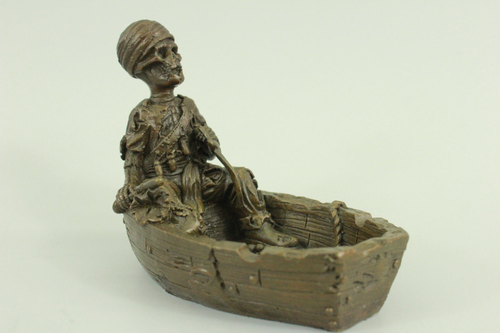 We made this handcrafted Skeleton pirate sculpture from real bronze in the boat. This would make a great Halloween decoration or for the lover of skeletons, skulls and dark things it would be a great gift anytime. 100% bronze, handmade and fully detailed, this brown patina sculpture was cast using the "Lost Wax Method". It is signed by the artist Olaf Odegaard.Bronze Dimensions :Height 4" x Width 6"
