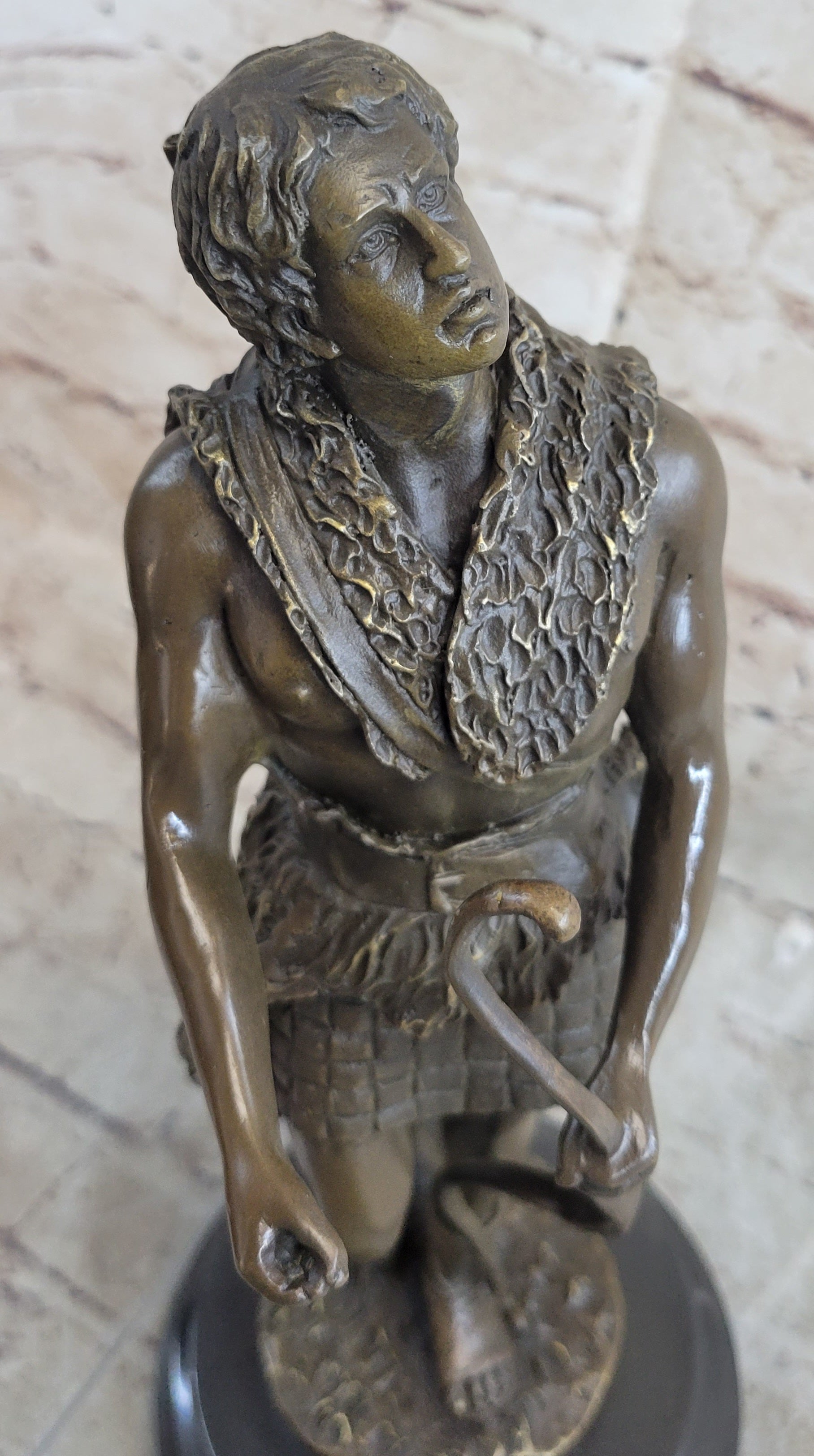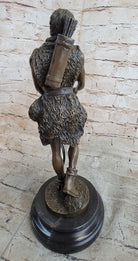 In this compelling bronze statue, a nude male figure emerges as a powerful guardian, holding a bow and arrow in a posture that exudes both strength and grace. The artist skillfully captures the essence of a protective authority, someone entrusted with the important task of safeguarding his village. Despite the formidable nature of his role, there's a nuanced portrayal of gentleness and love in his demeanor, adding depth and complexity to the character.
