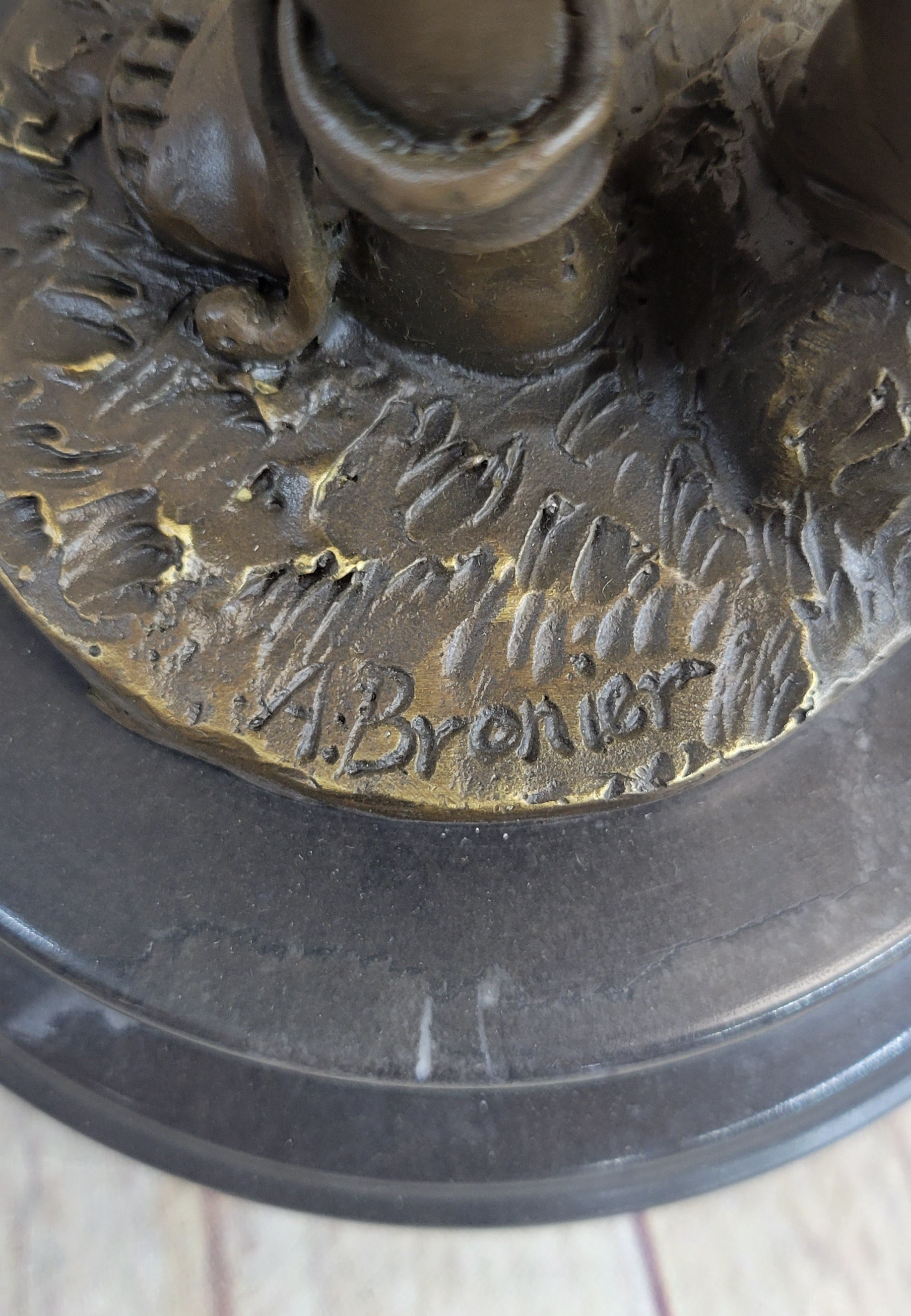 This exquisite work of art is signed by the artist A. Bronier, a mark of quality and recognition of the skilled hands that brought this statue to fruition. As a symbol of protection, strength, and love, this sculpture becomes more than a mere representation of a figure; it becomes a narrative that invites viewers to contemplate the harmonious balance between power and compassion embodied in the guardian of the village.Bronze Dimensions with Marble Base: Height 14.5" X Width 5.5"