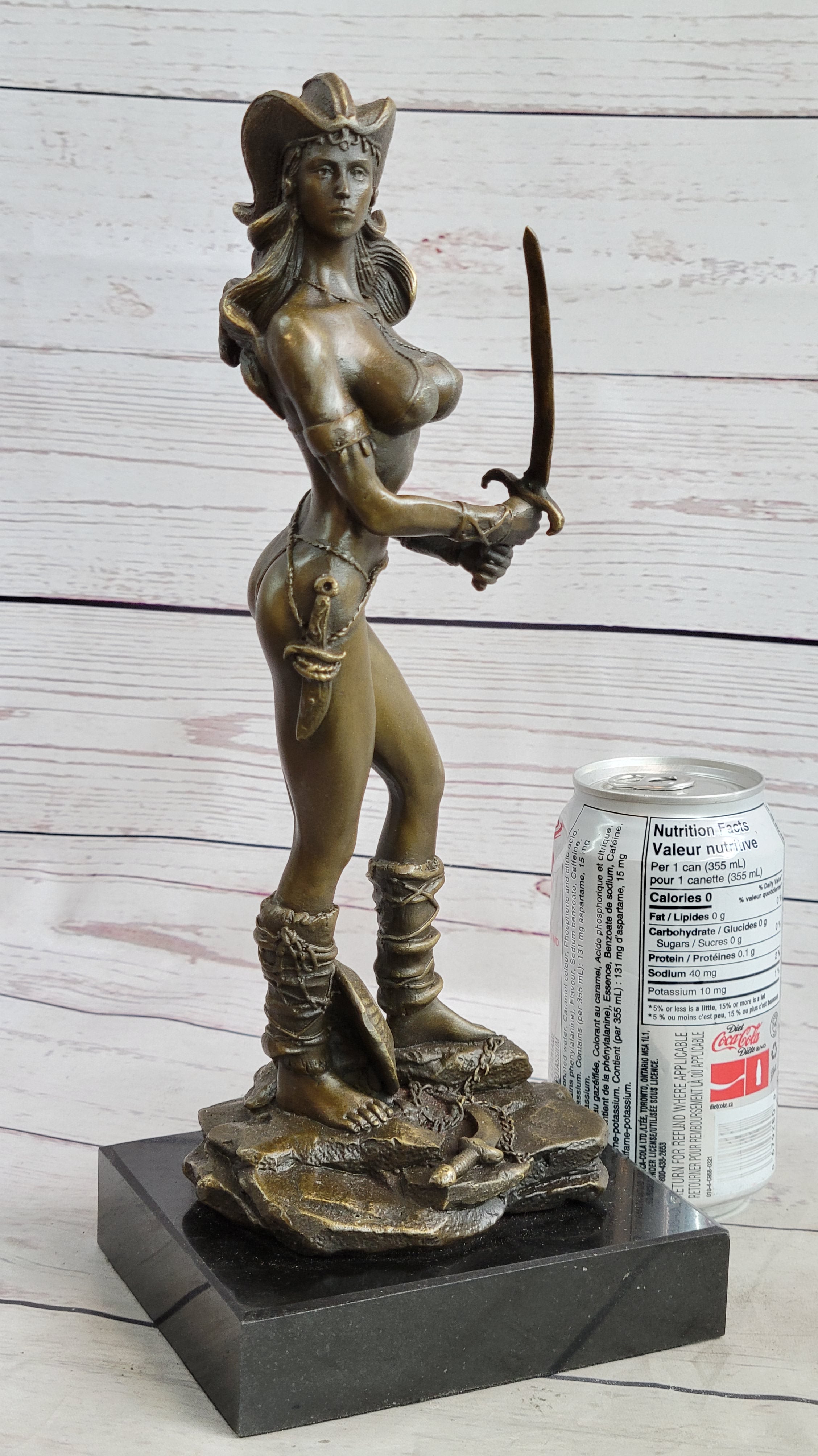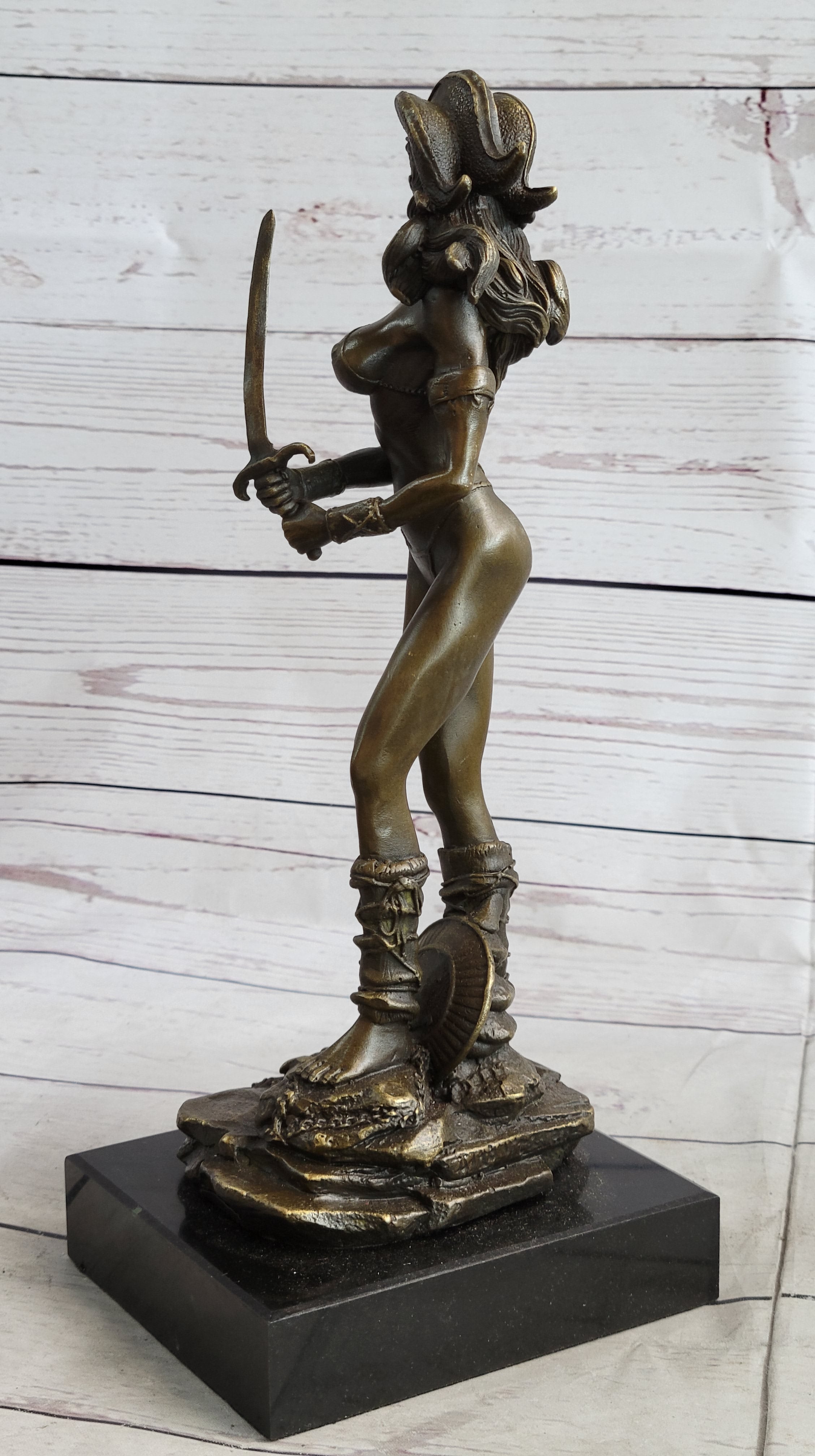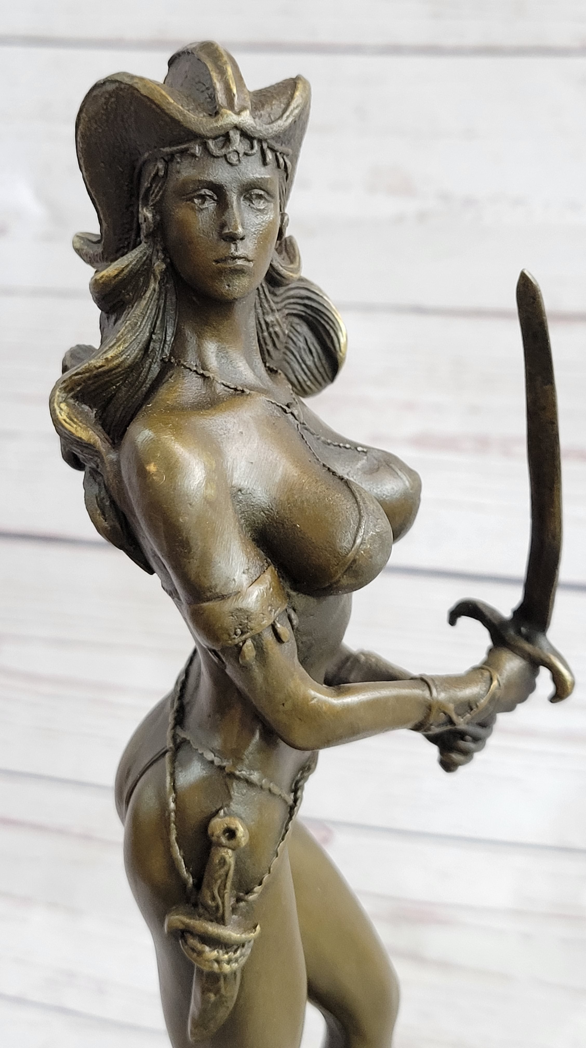 Embrace the power and allure of our striking Amazonian warrior bronze sculpture. Strong, skilled, and undeniably sexy, she exudes a fierce presence, ready to face any opponent with her sword in hand. Standing tall and fit, her womanly curvaceous figure adds a touch of femininity to her formidable stance. With an intriguing helmet headpiece adorning her head, her minimalistic yet captivating outfit emphasizes her confidence and strength.