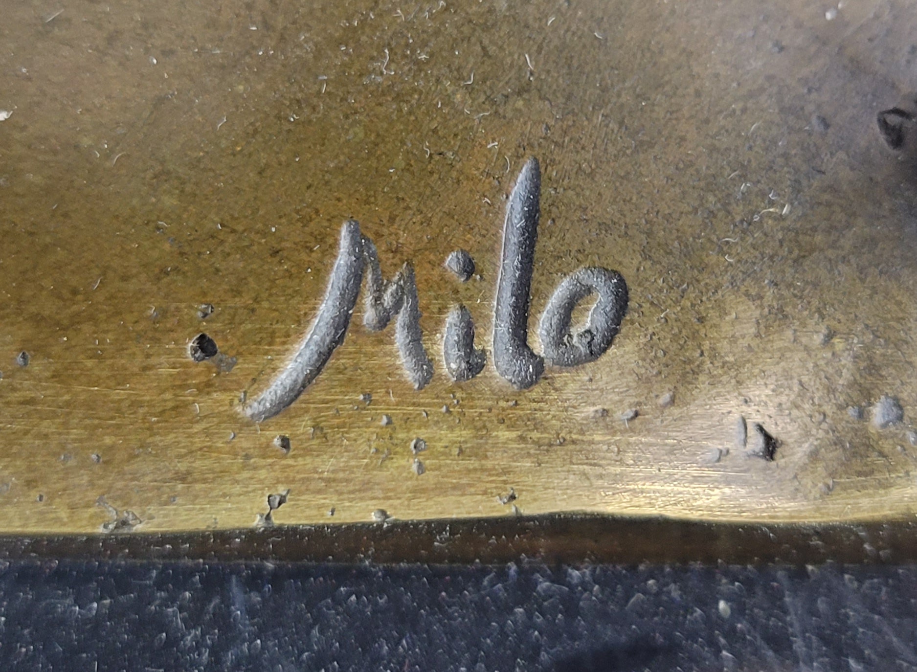 This remarkable piece stands proudly upon a sleek black marble base, providing a striking contrast and further elevating its visual impact. The sculpture bears the signature of the talented artist Milo, guaranteeing its authenticity and artistic value. With its expressive portrayal and profound symbolism, this bronze masterpiece invites viewers to embrace the freedom of letting go and embarking on a journey of self-discovery and renewal.Bronze Dimensions with Marble Base: Height 10" X Width 9"