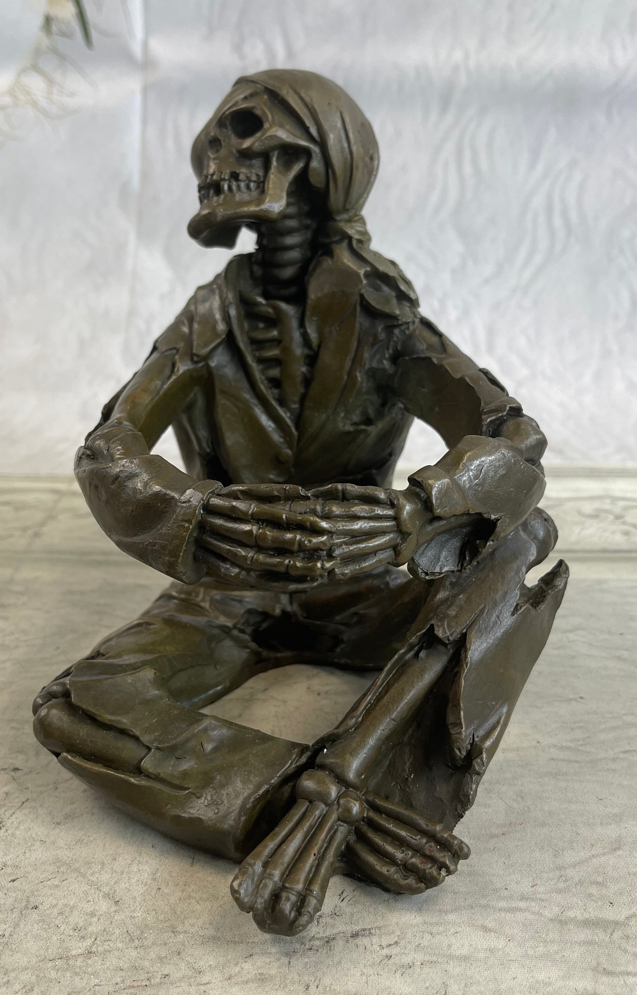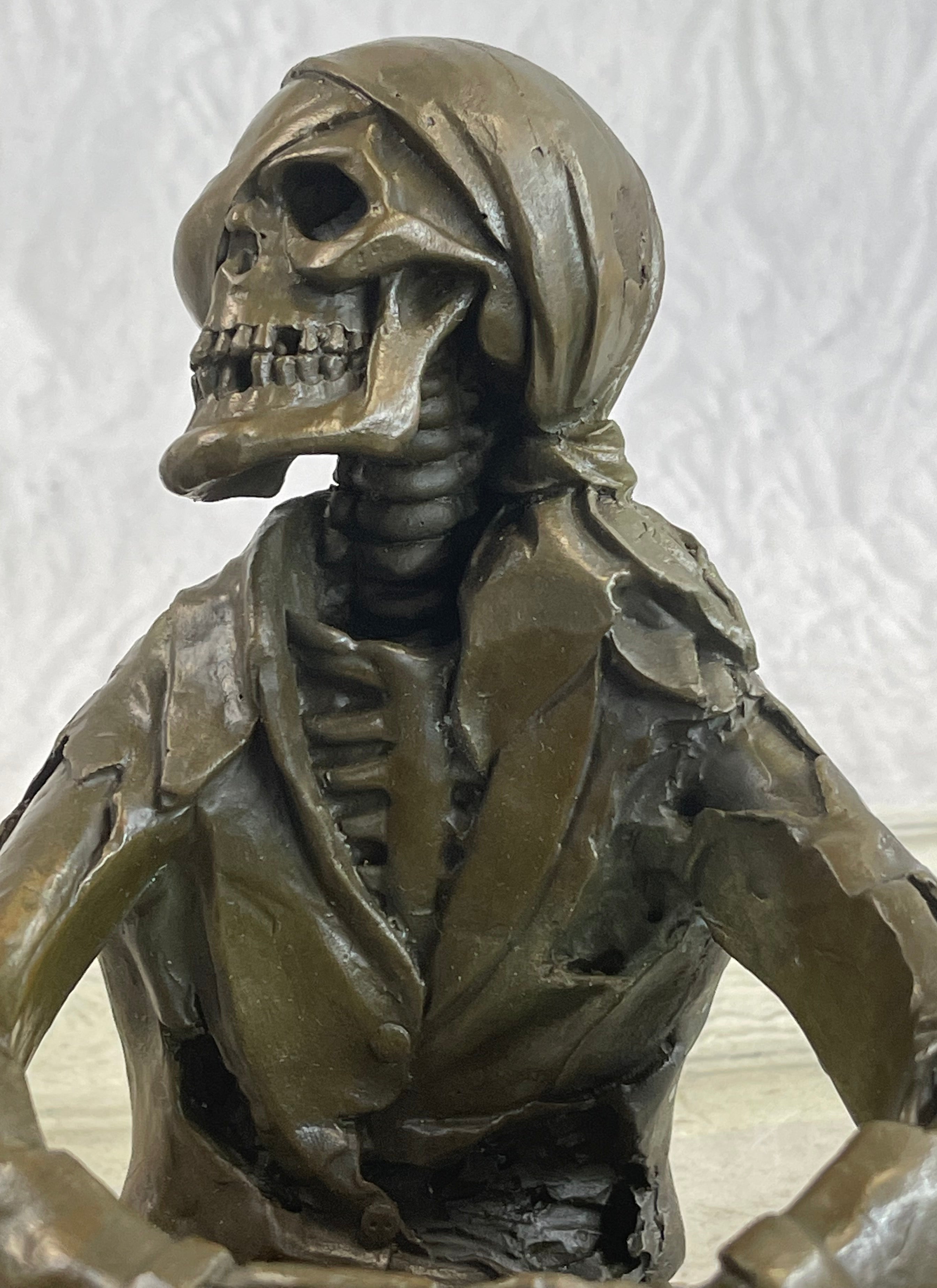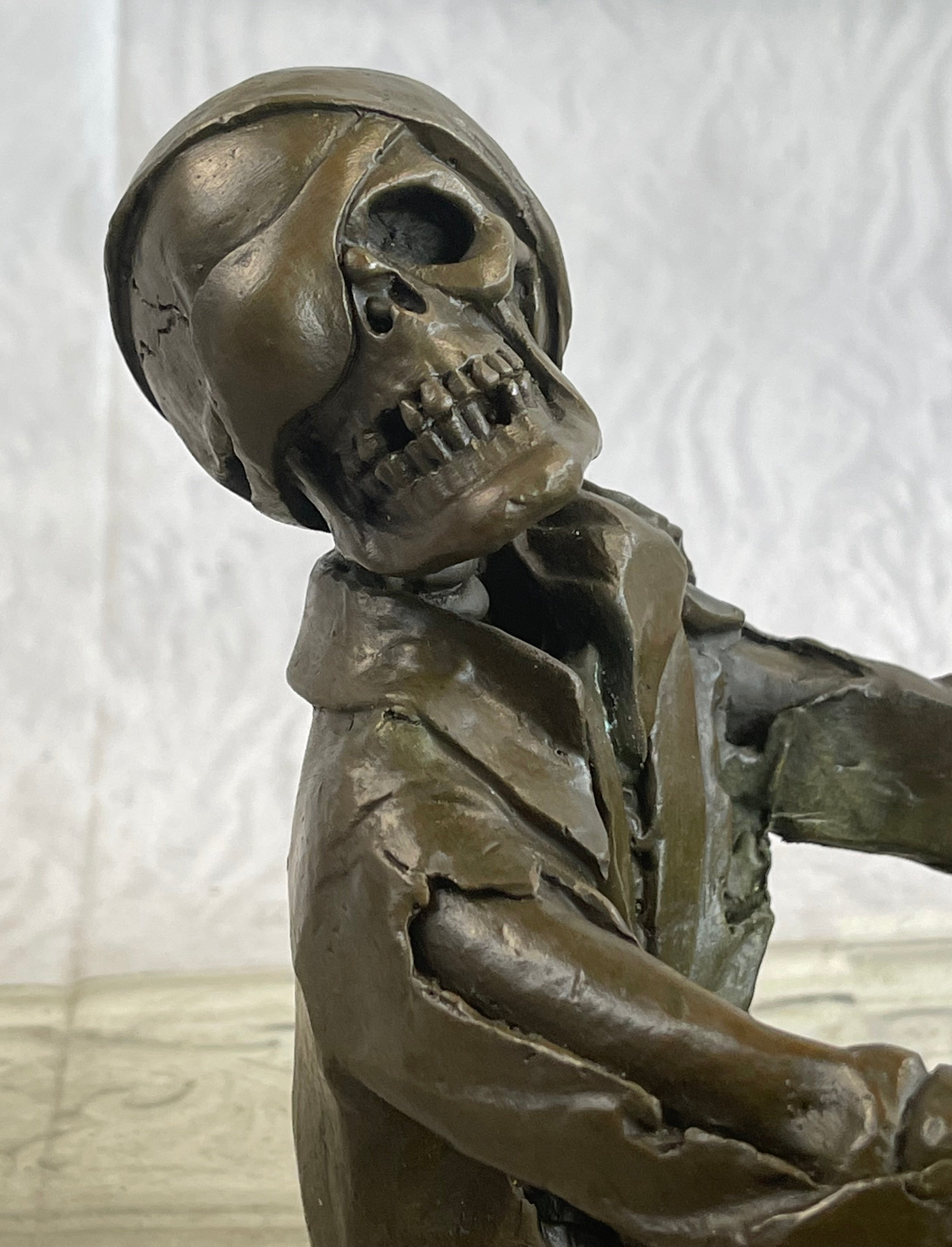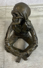 This ghastly, grinning human skeleton bottle holder is great for holding wine bottles, liquor bottles, or for holding olive oil as part of your kitchen decor. Made of real bronze, the holder stands 6 inches tall, 7 inches wide, and 6 inches deep. It makes a great gift for any skull lover, but you`ll have to provide the bottle of spirits. This Bronze Sculpture was casted using the “Lost Wax Method” and has a two tone brown patina. This sculpture is 100% bronze and is handmade. This sculpture is signed By artist Milo.Bronze Dimensions :Height 6" x Width 9"