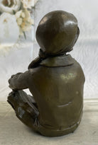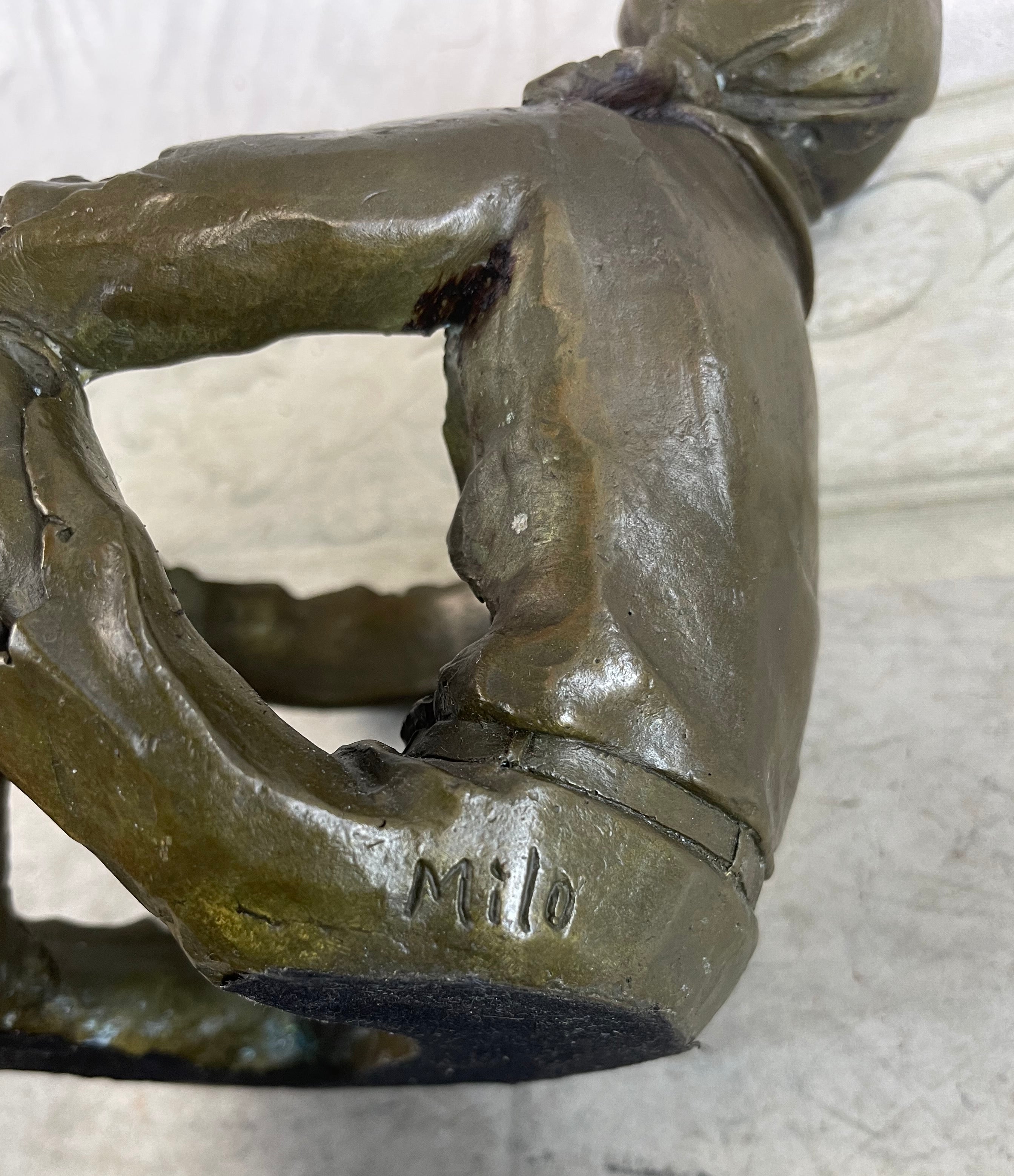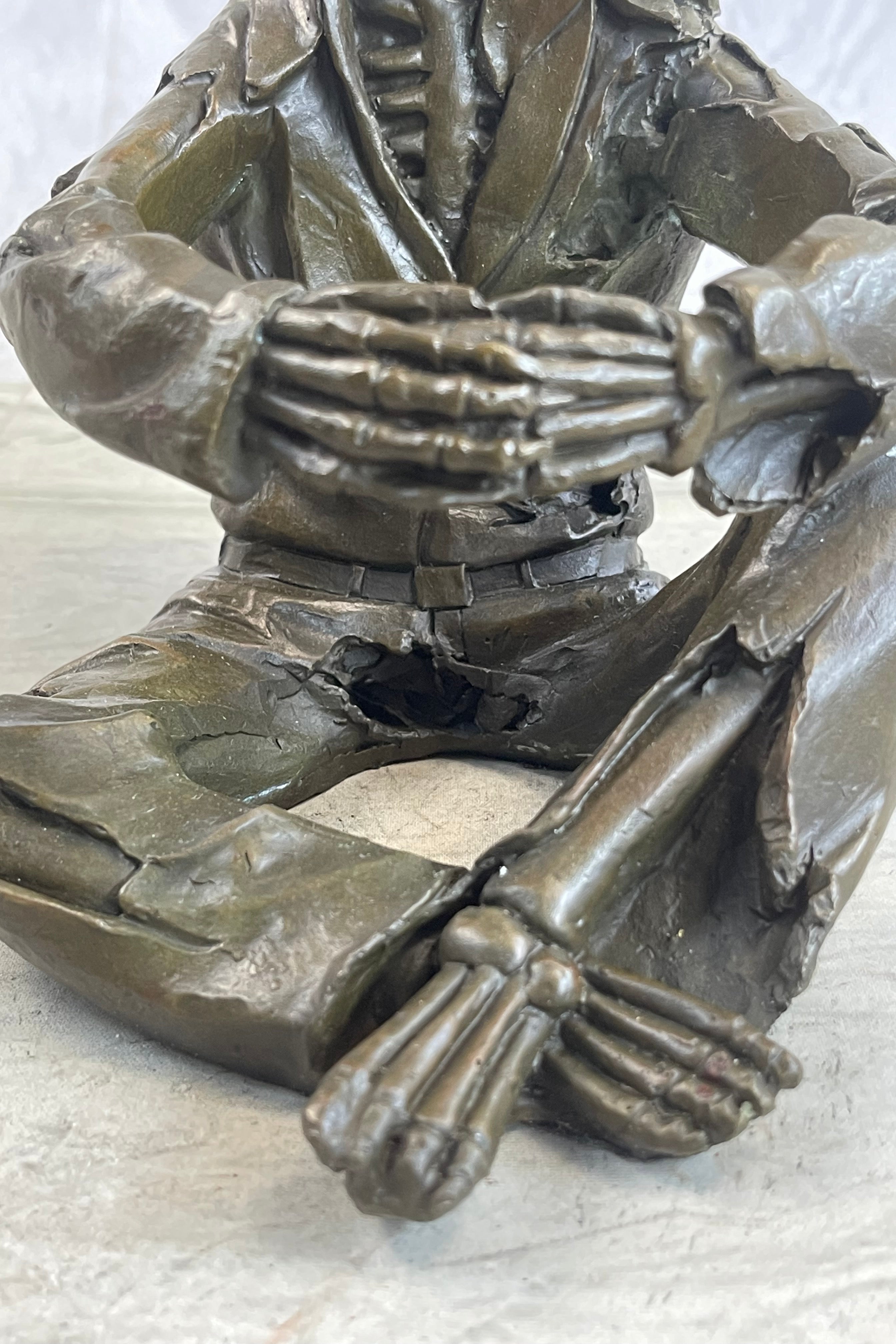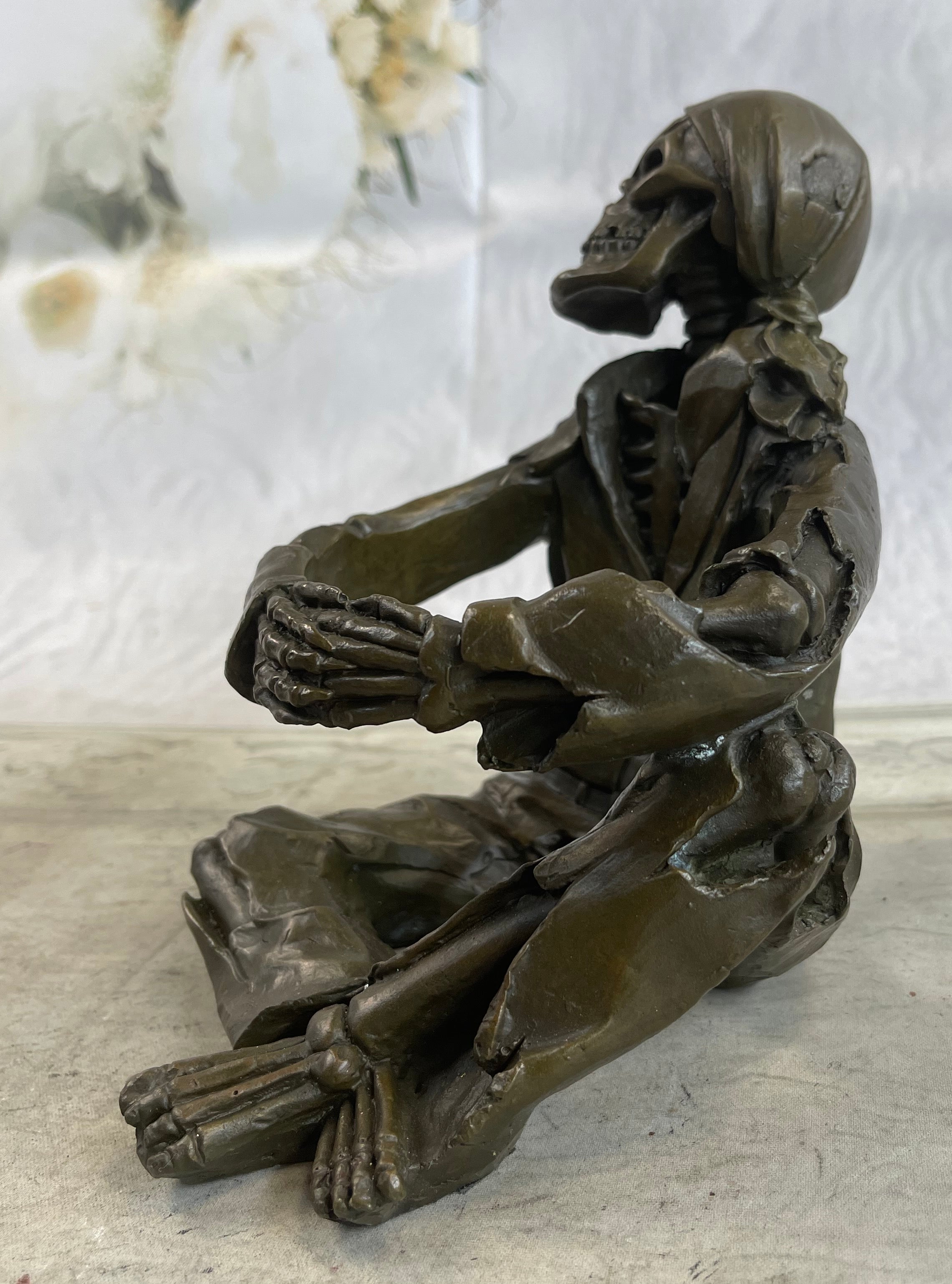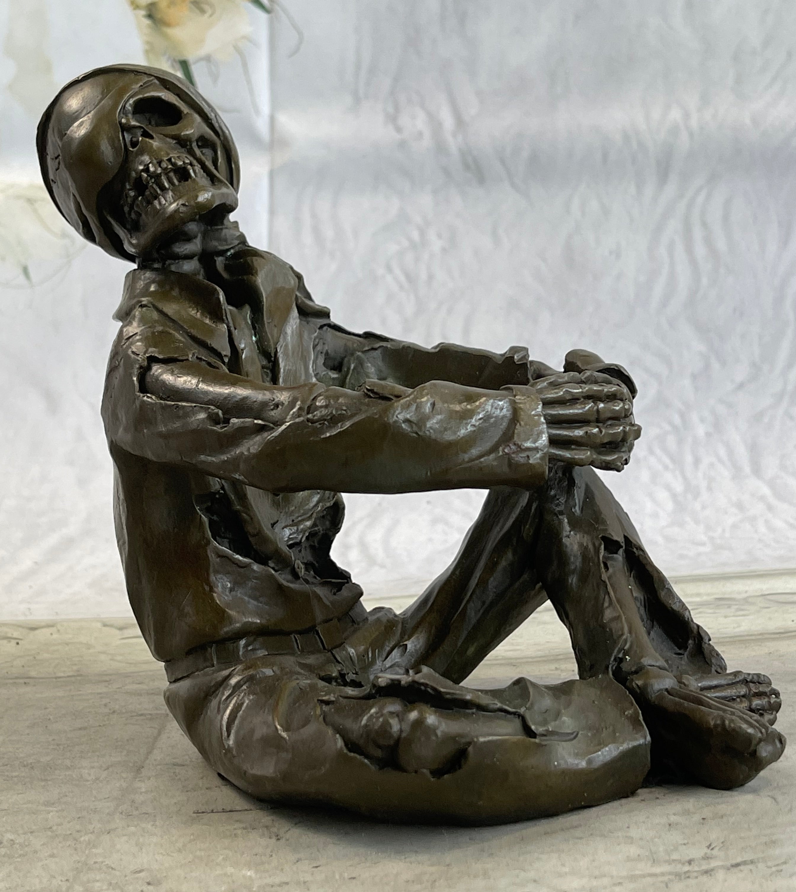 This ghastly, grinning human skeleton bottle holder is great for holding wine bottles, liquor bottles, or for holding olive oil as part of your kitchen decor. Made of real bronze, the holder stands 6 inches tall, 7 inches wide, and 6 inches deep. It makes a great gift for any skull lover, but you`ll have to provide the bottle of spirits. This Bronze Sculpture was casted using the “Lost Wax Method” and has a two tone brown patina. This sculpture is 100% bronze and is handmade. This sculpture is signed By artist Milo.Bronze Dimensions :Height 6" x Width 9"