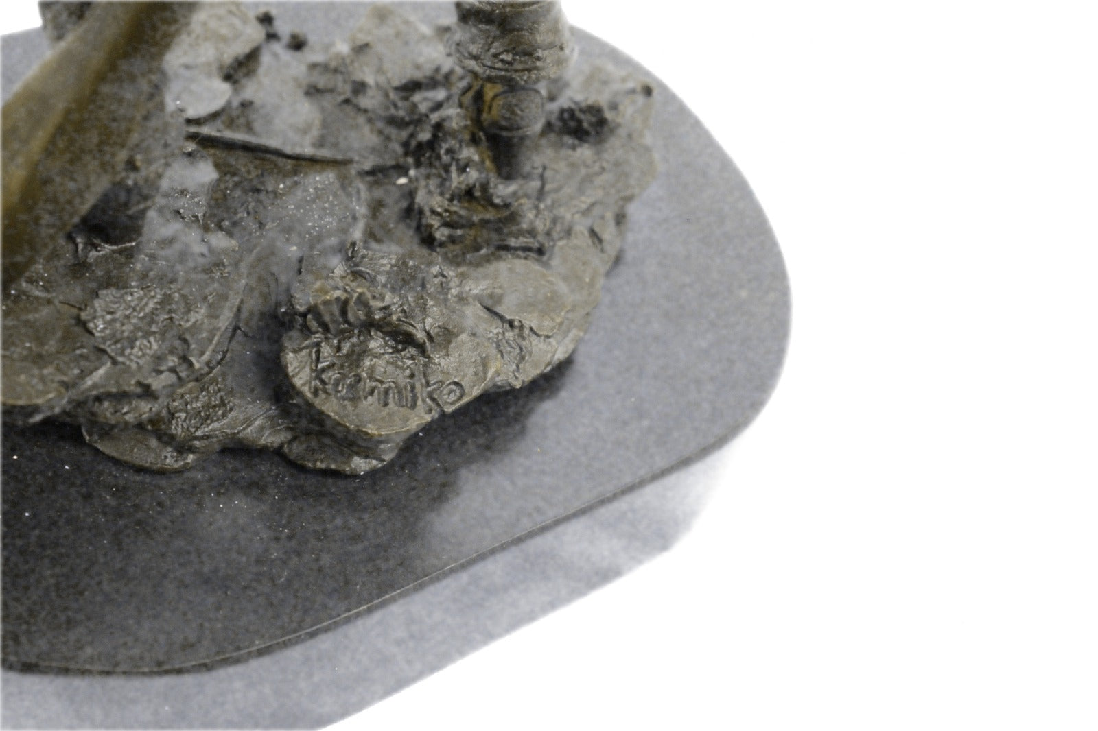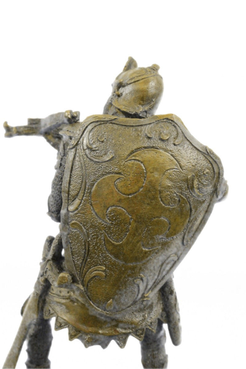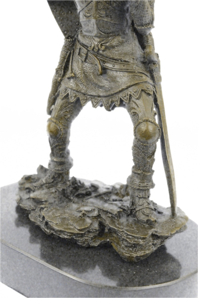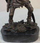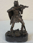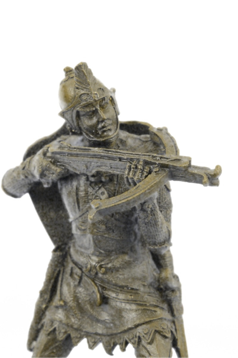 This ancient warrior creeps up the muddy hill, stalking his enemy. Though he wears boots, his moves are stealth. He holds up a crossbow and lines his target. His brow furrows intensely with killer focus. He is all out of arrows, so this is his last shot. An empty sack hangs from his hip. His sword is slung at his side and a shield covers his back. He is covered in armor and wears a helmet that claps under his chin. Mud pushes out around his feet and a arrow, meant for his heart, lays beneath him. 100% bronze and handmade, this brown patina sculpture was cast using the "Lost Wax Method" and mounted on a black marble base. It is signed by the artist Kamiko.Bronze Dimensions with Marble Base:Height 10" x Width 6"