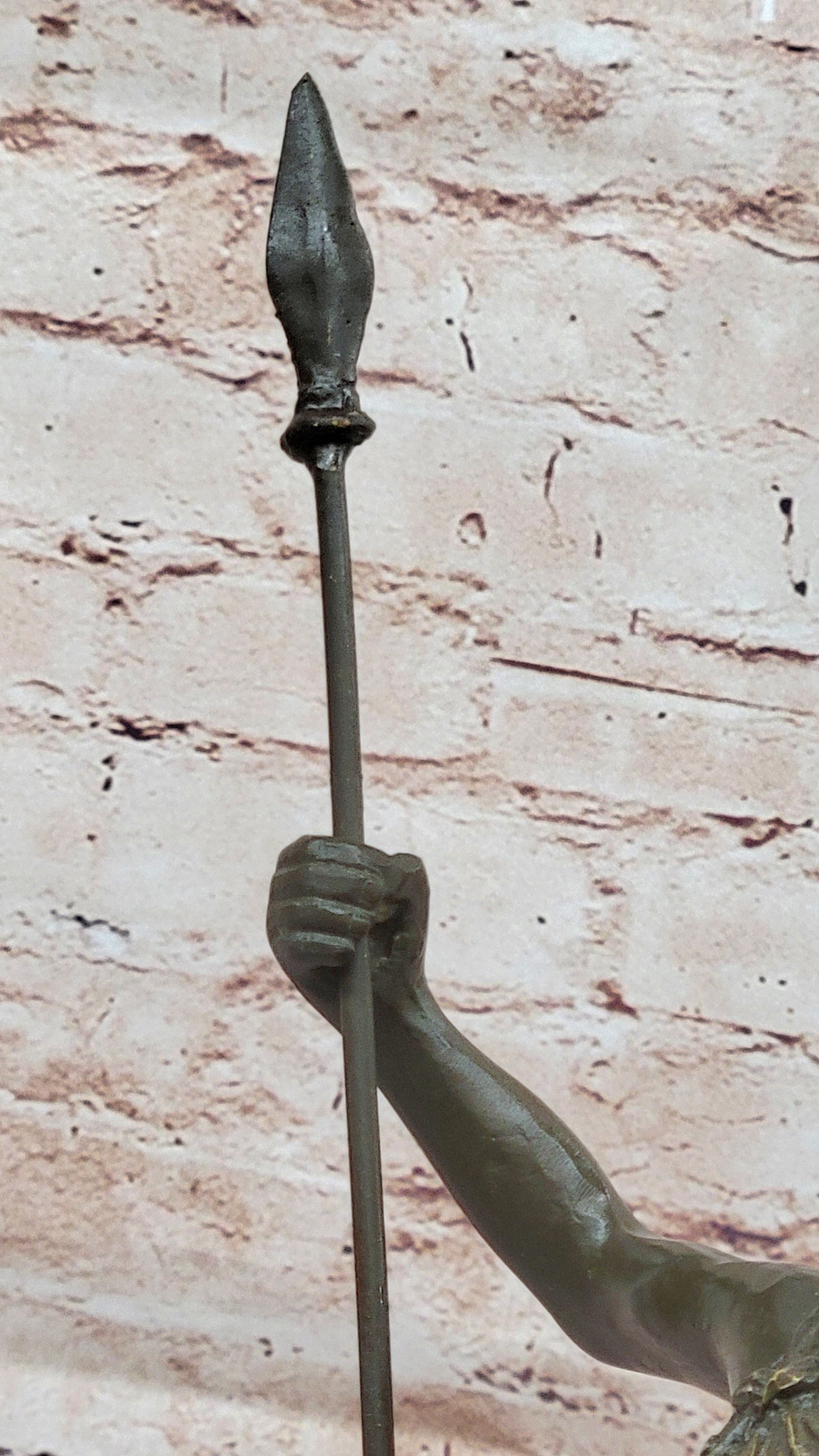 Handmade using the lost wax method, the sculpture showcases the soldier's attention to detail and dynamic pose. The rich brown patina on the figure highlights the craftsmanship, bringing out the textures of the armor and the muscular physique of the soldier.