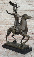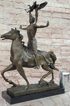 This stunning bronze sculpture depicts a horseman riding into town with an air of grandeur, flanked by two miniature angels perched on his shoulders. These celestial beings, one male and one female, blow their trumpets in unison, announcing his arrival with a divine melody. The horseman, gazing steadily forward, extends his arms to his sides in a commanding pose, while his horse trots slowly along a rugged, rocky path beneath him. The angelic wings, almost touching like hands, symbolize their unity as they lean gracefully to perform their heraldic duties.