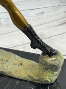 The craftsmanship of this sculpture is exceptional, with every detail carefully considered. The Archer’s skin, cast in a deep, dark brown patina, contrasts strikingly with the vibrant patinas of his clothing and gear. The ground beneath him, rendered in a blend of greens, yellows, and grays, simulates the rugged terrain of solid rock, grounding the scene in realism. The use of patina not only enhances the visual appeal of the sculpture but also adds depth and character, creating a vivid portrayal of this ancient warrior.