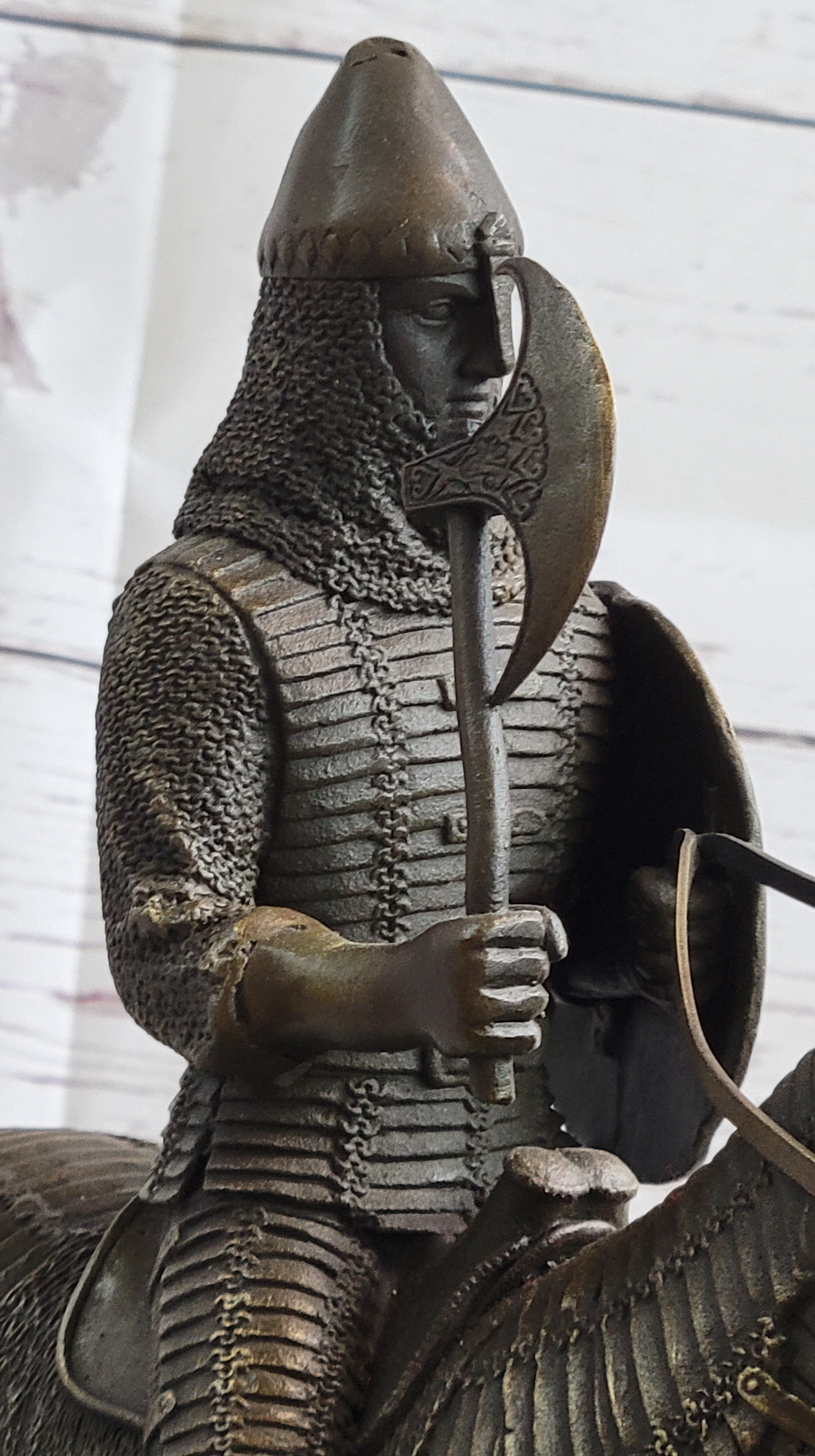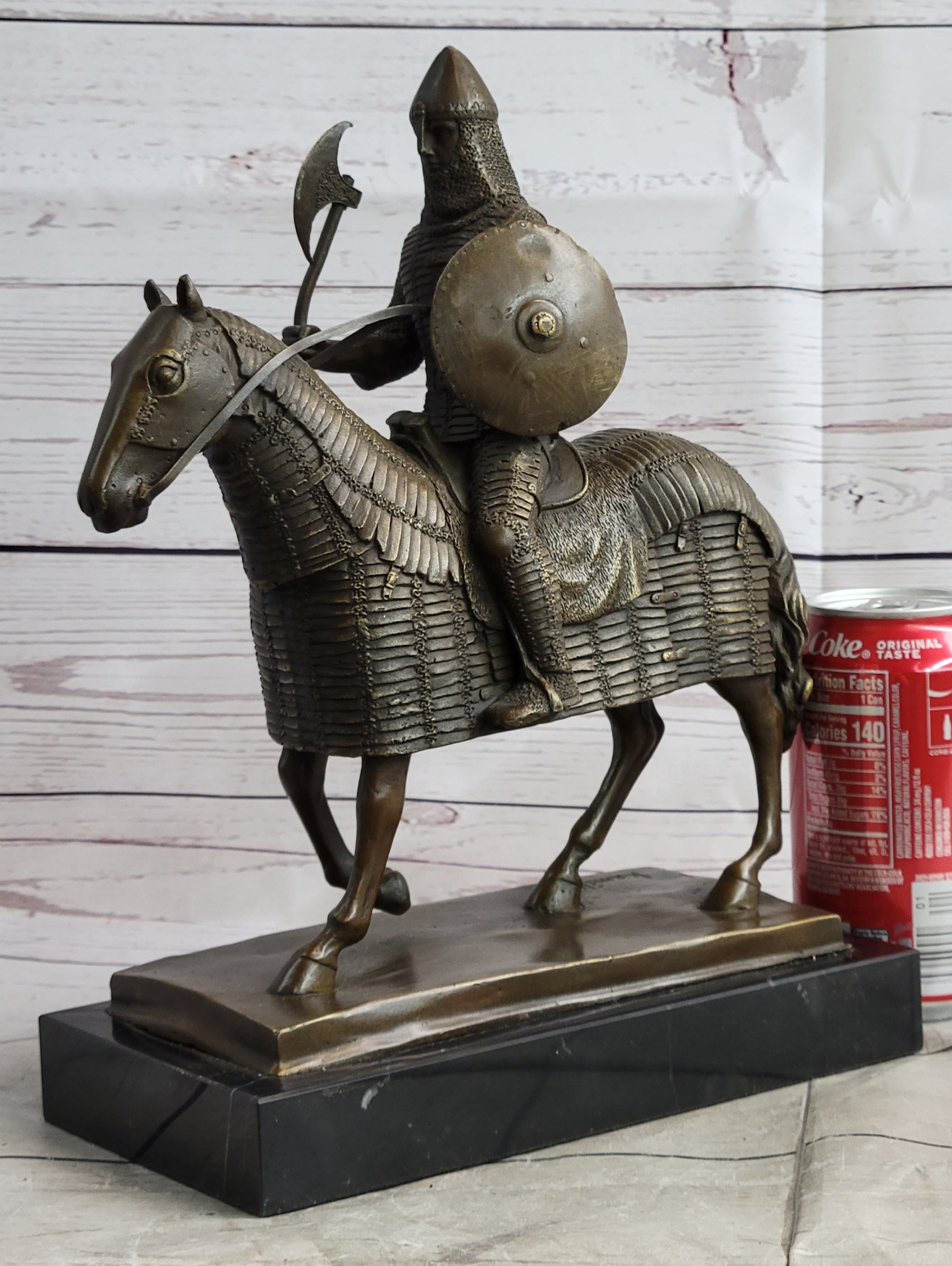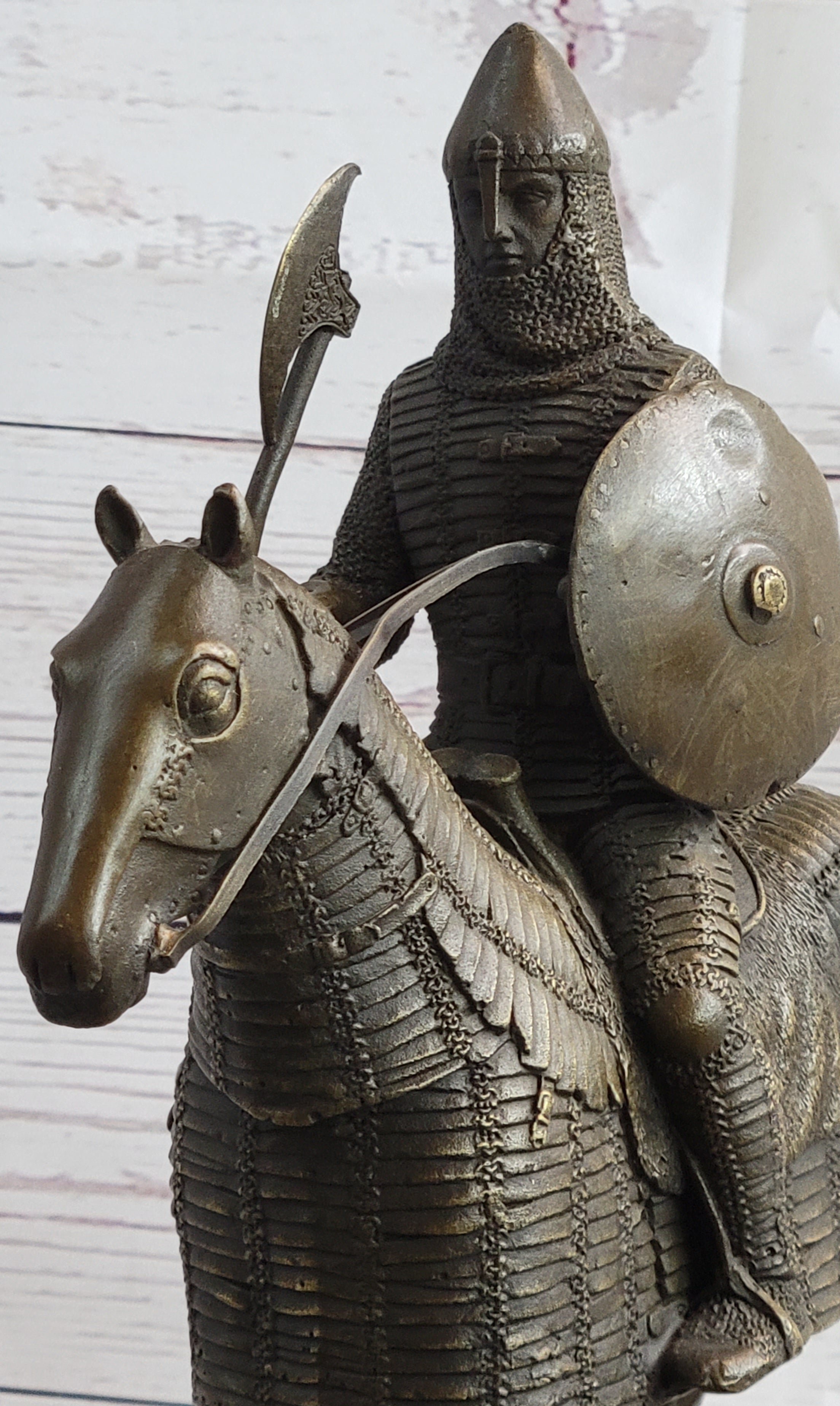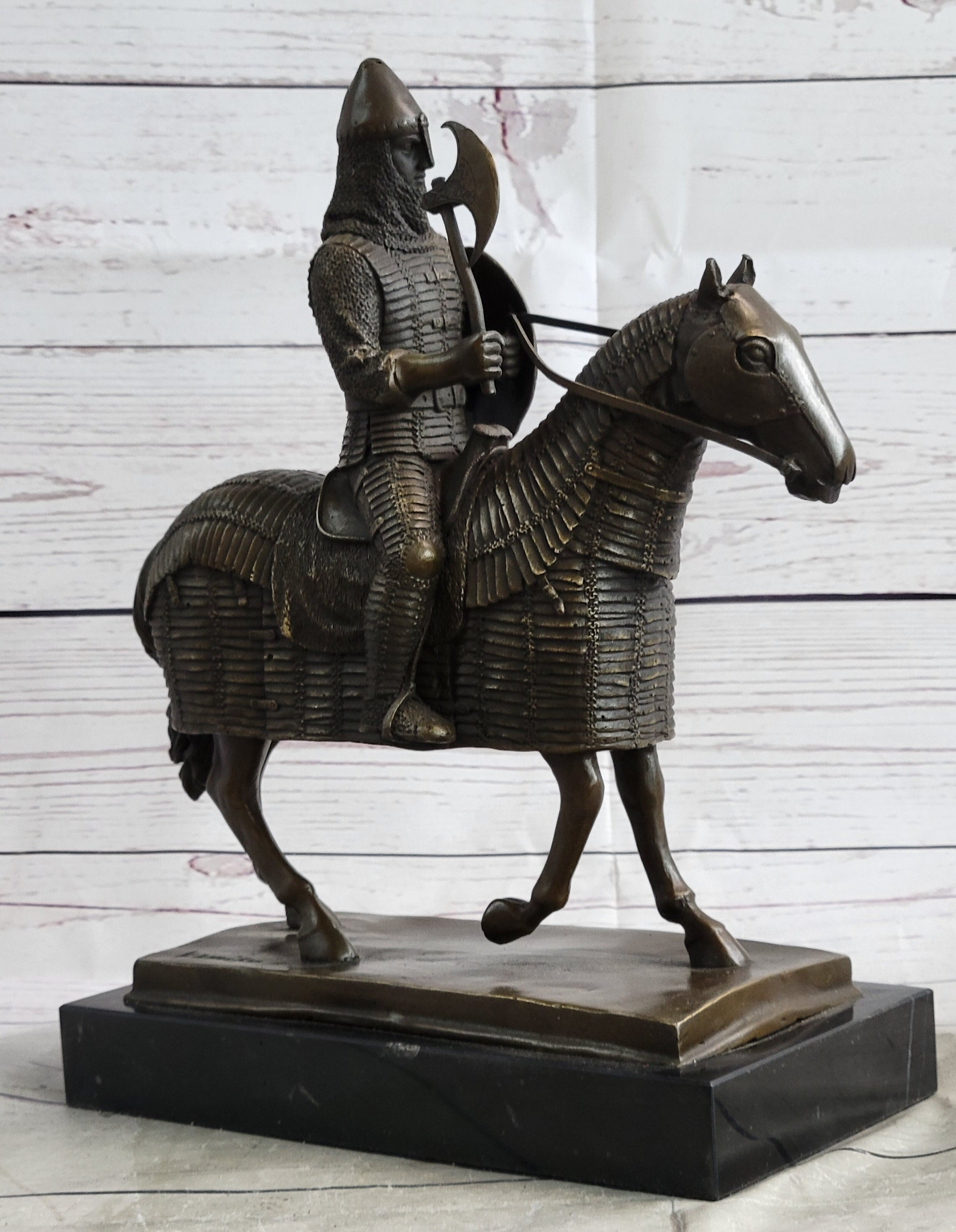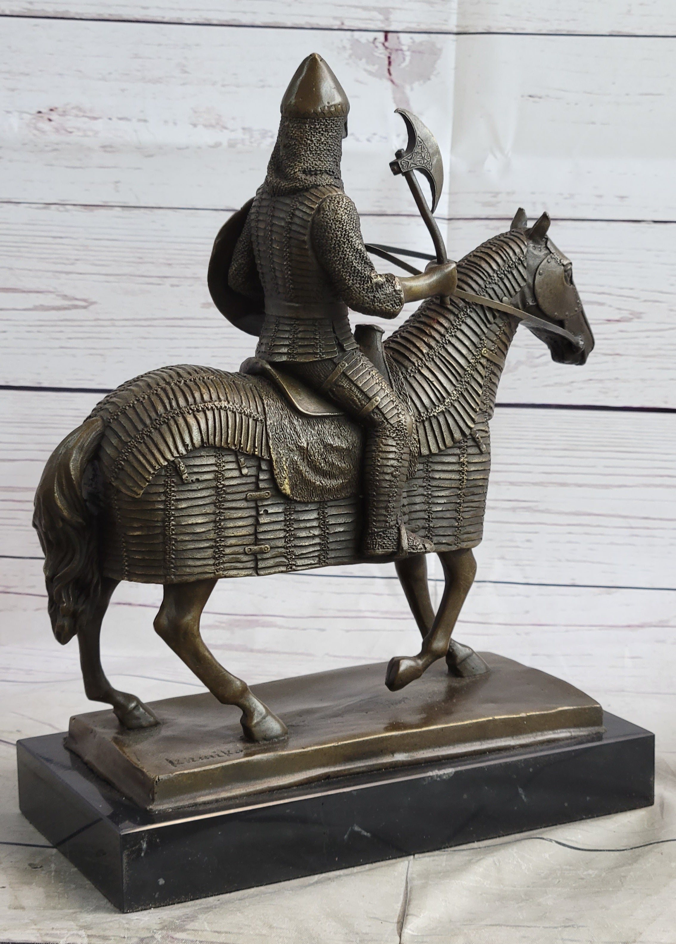 This sculpture presents a meticulously accurate portrayal of a courageous medieval knight, capturing the essence of his unwavering bravery. With a shield slung across one arm and a formidable ax in the other, the knight's gaze reflects determination and stoicism, embodying the resilience required in the face of medieval battles. The attention to detail extends to the knight's steed, adorned in full armor, with the sculpted armor draping in pleats over its body. Notably, the legs of the horse remain exposed, emphasizing the strategic balance between protection and agility.