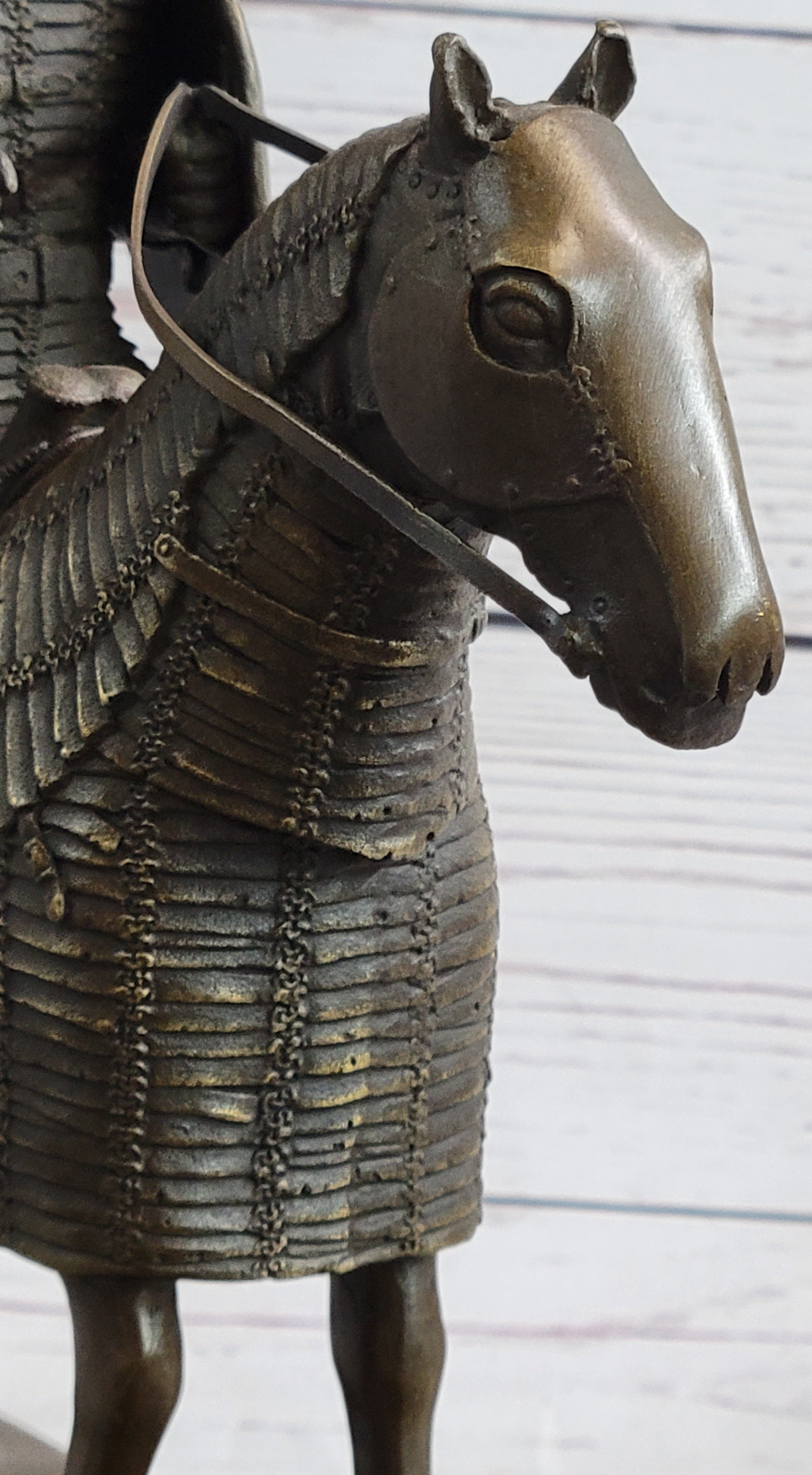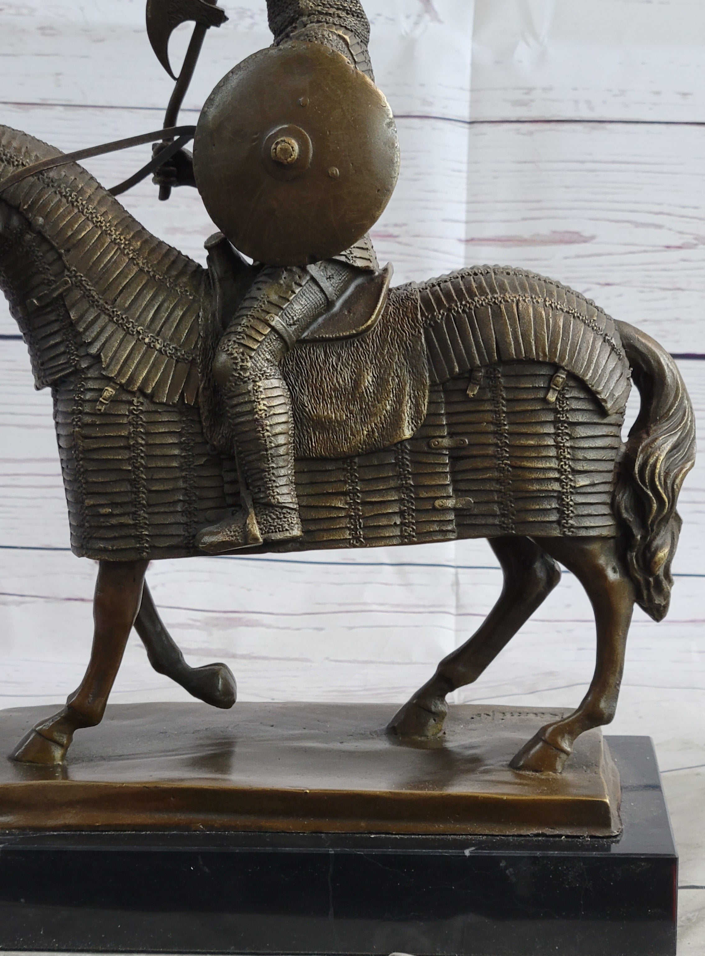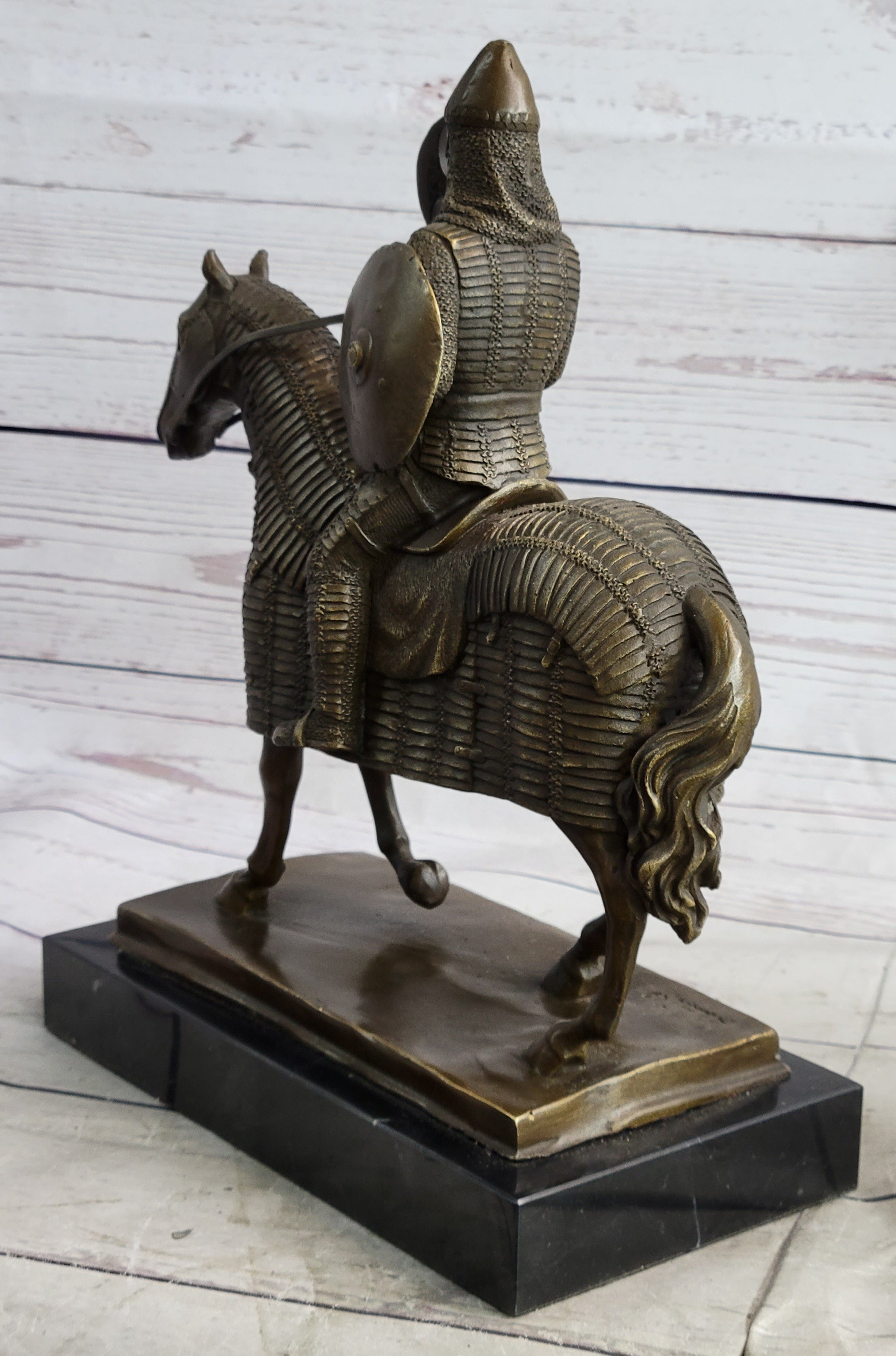 This sculpture transcends mere artistic expression, offering a window into the medieval era and the valor of knights who donned armor to protect and uphold their ideals. As a timeless piece, it invites viewers to appreciate the historical context and the enduring legacy of these brave individuals who embodied the chivalric spirit.Bronze Dimensions with Marble Base: Height 12" X Width 10"