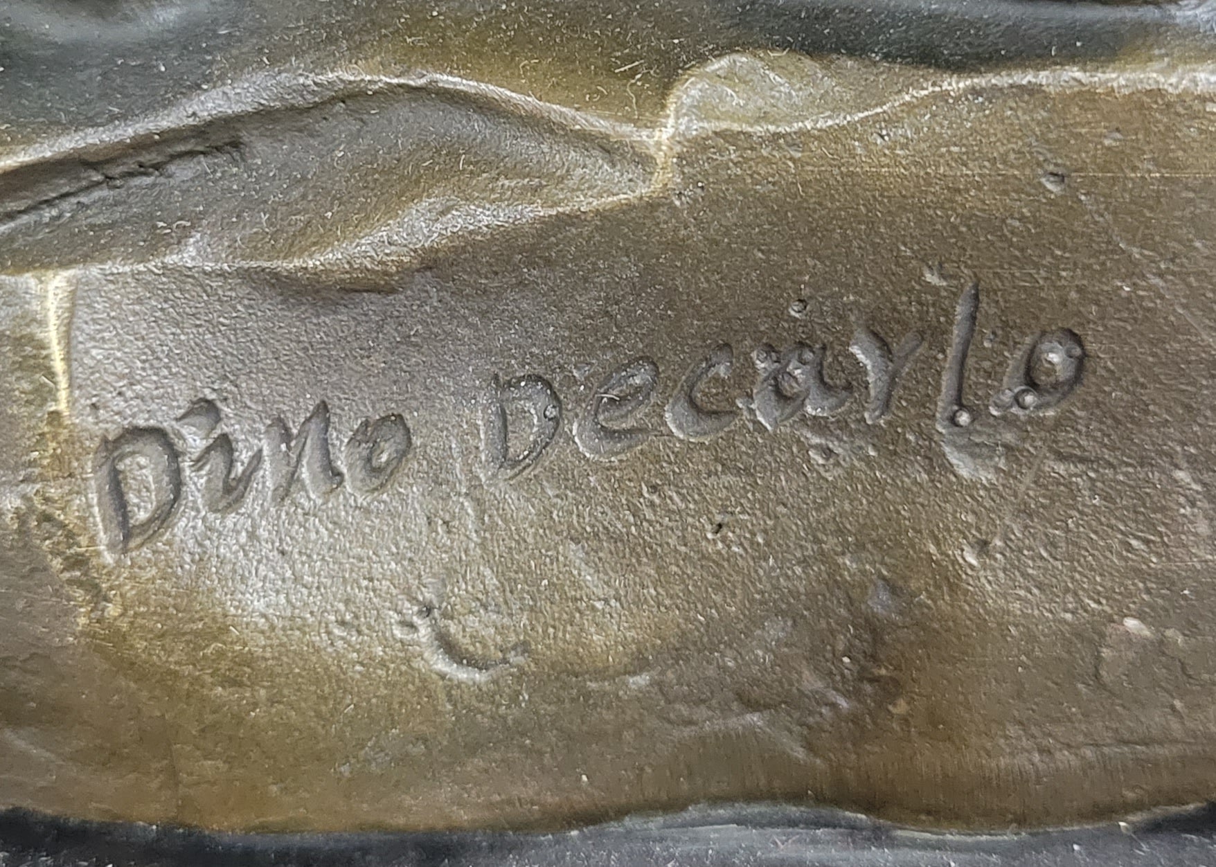 Resting upon a solid black marble base, this sculpture commands attention and reverence. The contrasting colors and textures of the bronze and marble create a visually striking composition, further accentuating the sculpture's powerful presence. Crafted with the utmost skill and precision, the piece was meticulously formed using the lost wax method, ensuring a faithful representation of the artist's vision and attention to detail. The sculpture proudly bears the signature of the acclaimed artist, Dino Decarlo, symbolizing its authenticity and artistic value.