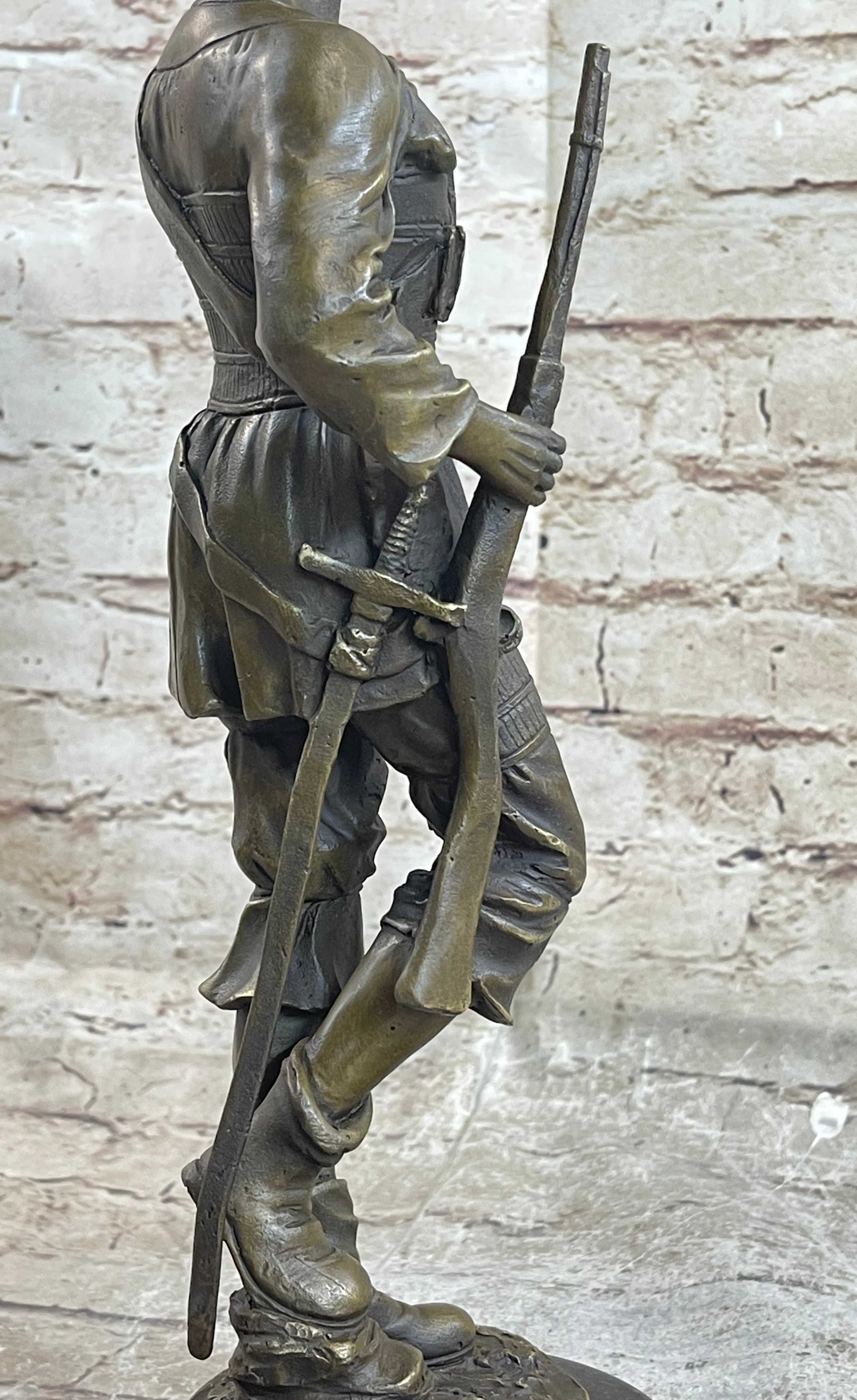 This classic reproduction artwork of a French Cavalry Officer was masterfully sculpted by A. Bronier and captures the elegance and authority of a bygone military era. The officer stands proudly in ornate military regalia, raising his firearm with commanding presence. Every detail—from the folds in his uniform to the determination in his expression—has been skillfully rendered to evoke the spirit of historical grandeur.