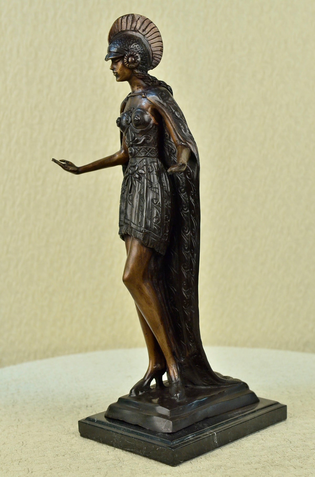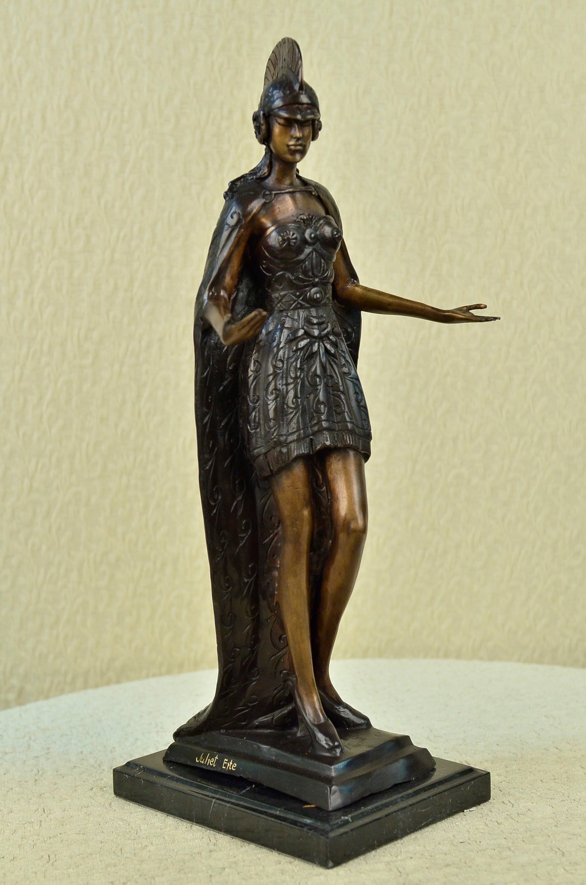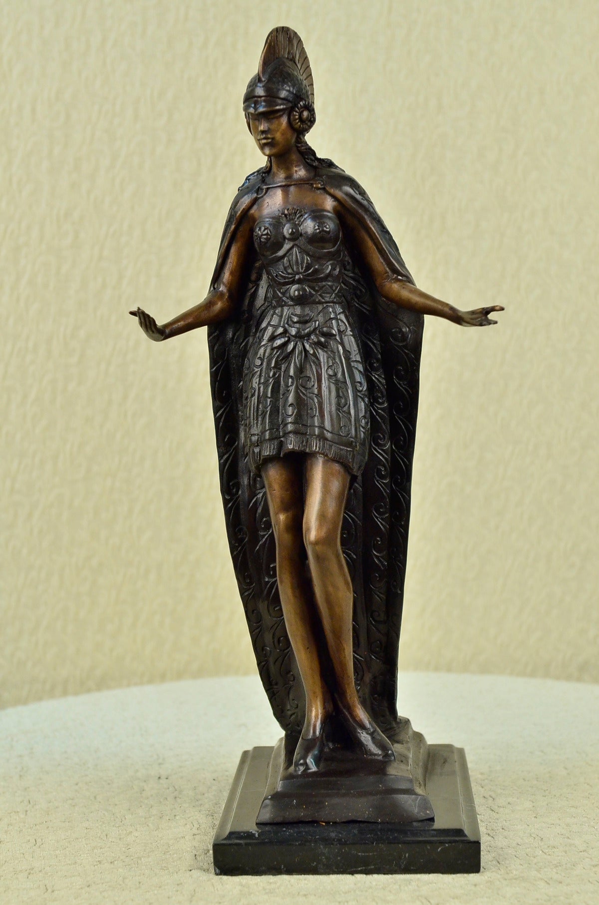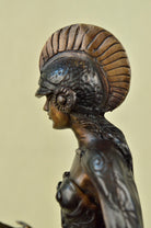 The beholder comes across a gladiatrix, which was the female counterpart to the male gladiator. Though very rare gladiatrices are attested in archaeology and literature. It was only possible for a woman to fight in a gladiatorial game if she was able to access any form of professional training. She is seen nude except for the sandals she is fastening and the bronze galea armoring her head. She seems to have a calm demeanor and grace as she poses to take on man, beast and death. The handmade bronze sculpture was molded using the ancient method of lost-wax casting and stained with a brown color Special patina finish for preservation. It is mounted upon a black marble base and is signed by artist.Bronze Dimensions with Marble Base:Height 19" x Width 9"