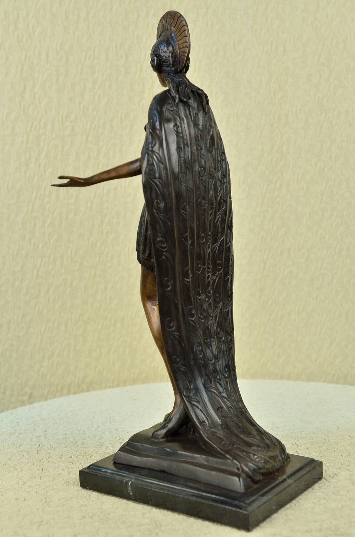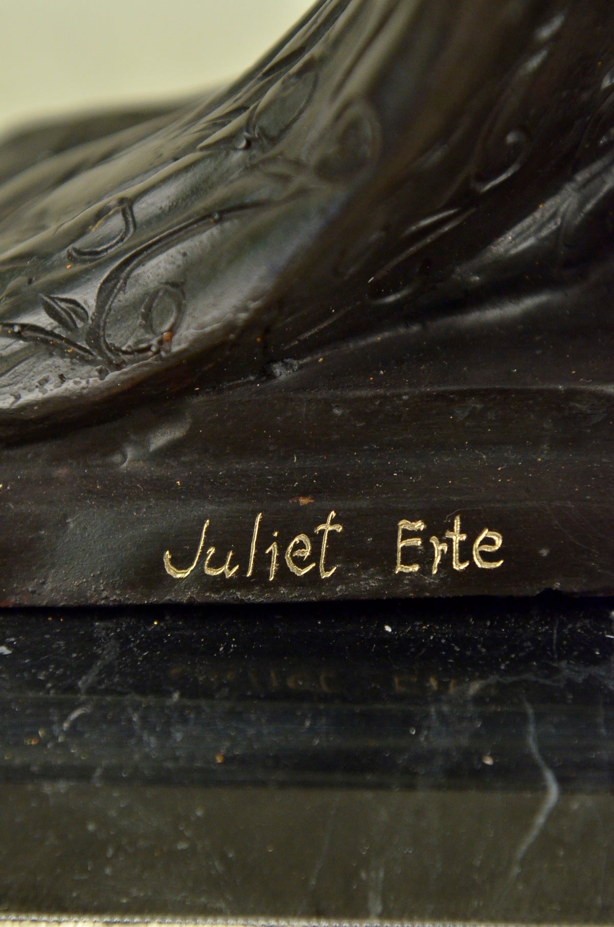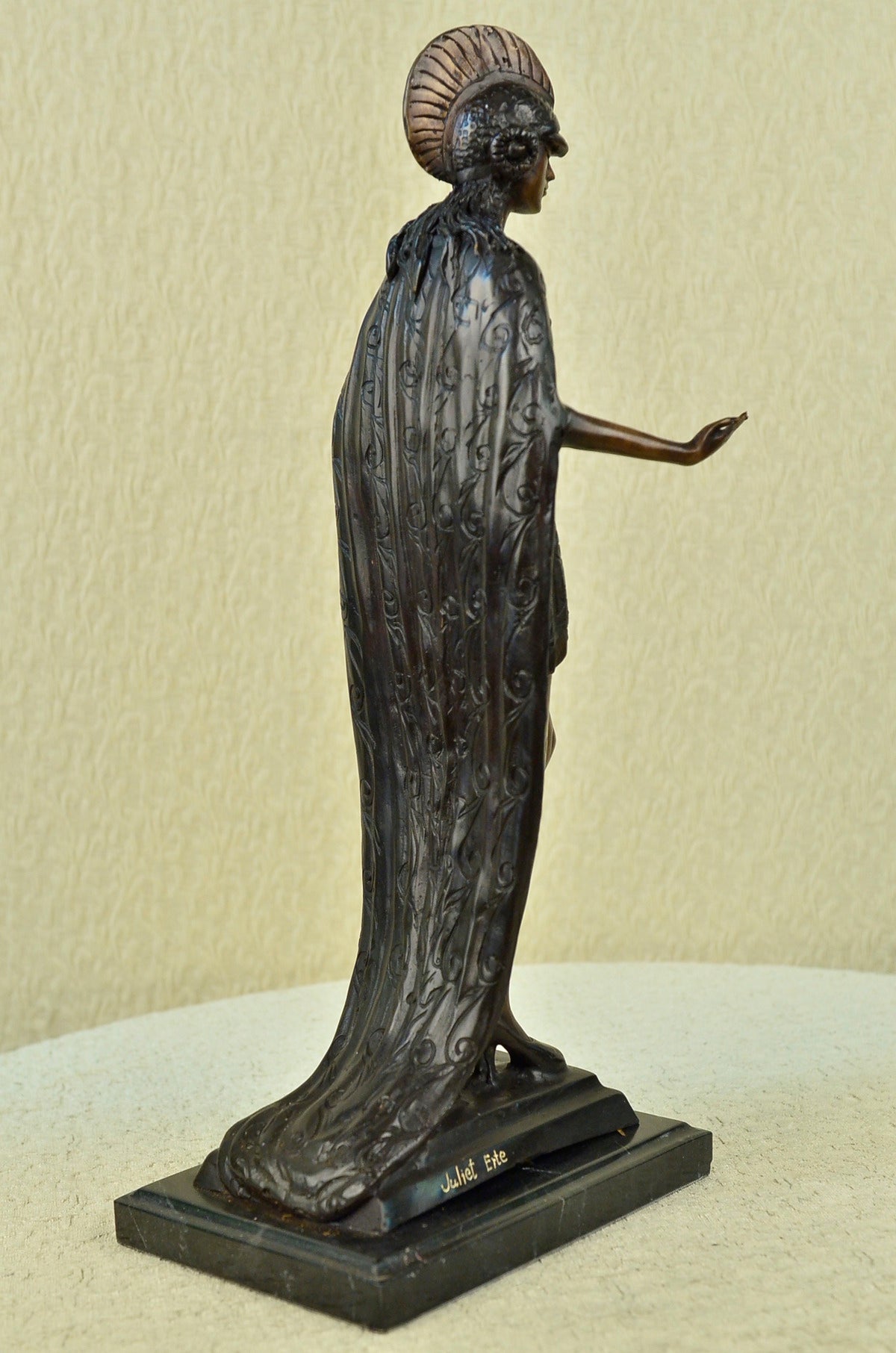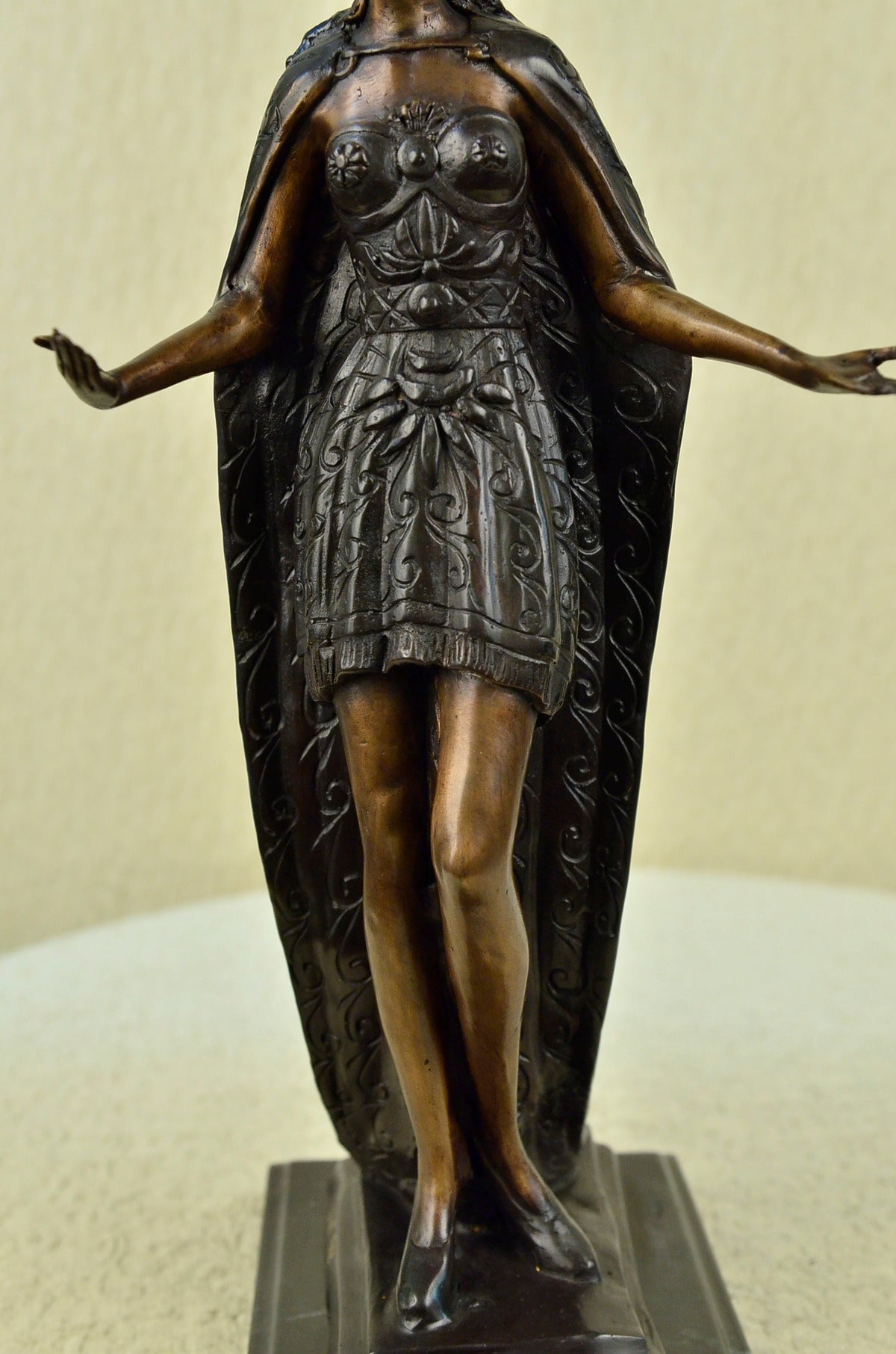 The beholder comes across a gladiatrix, which was the female counterpart to the male gladiator. Though very rare gladiatrices are attested in archaeology and literature. It was only possible for a woman to fight in a gladiatorial game if she was able to access any form of professional training. She is seen nude except for the sandals she is fastening and the bronze galea armoring her head. She seems to have a calm demeanor and grace as she poses to take on man, beast and death. The handmade bronze sculpture was molded using the ancient method of lost-wax casting and stained with a brown color Special patina finish for preservation. It is mounted upon a black marble base and is signed by artist.Bronze Dimensions with Marble Base:Height 19" x Width 9"