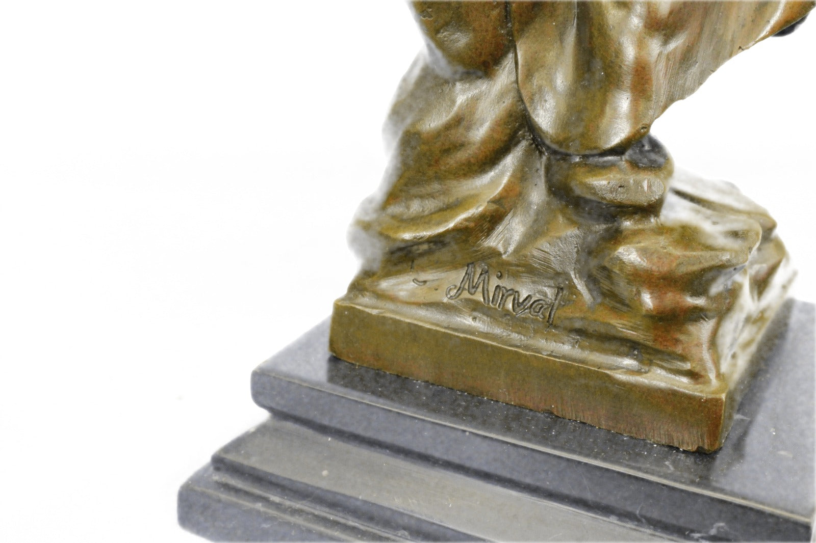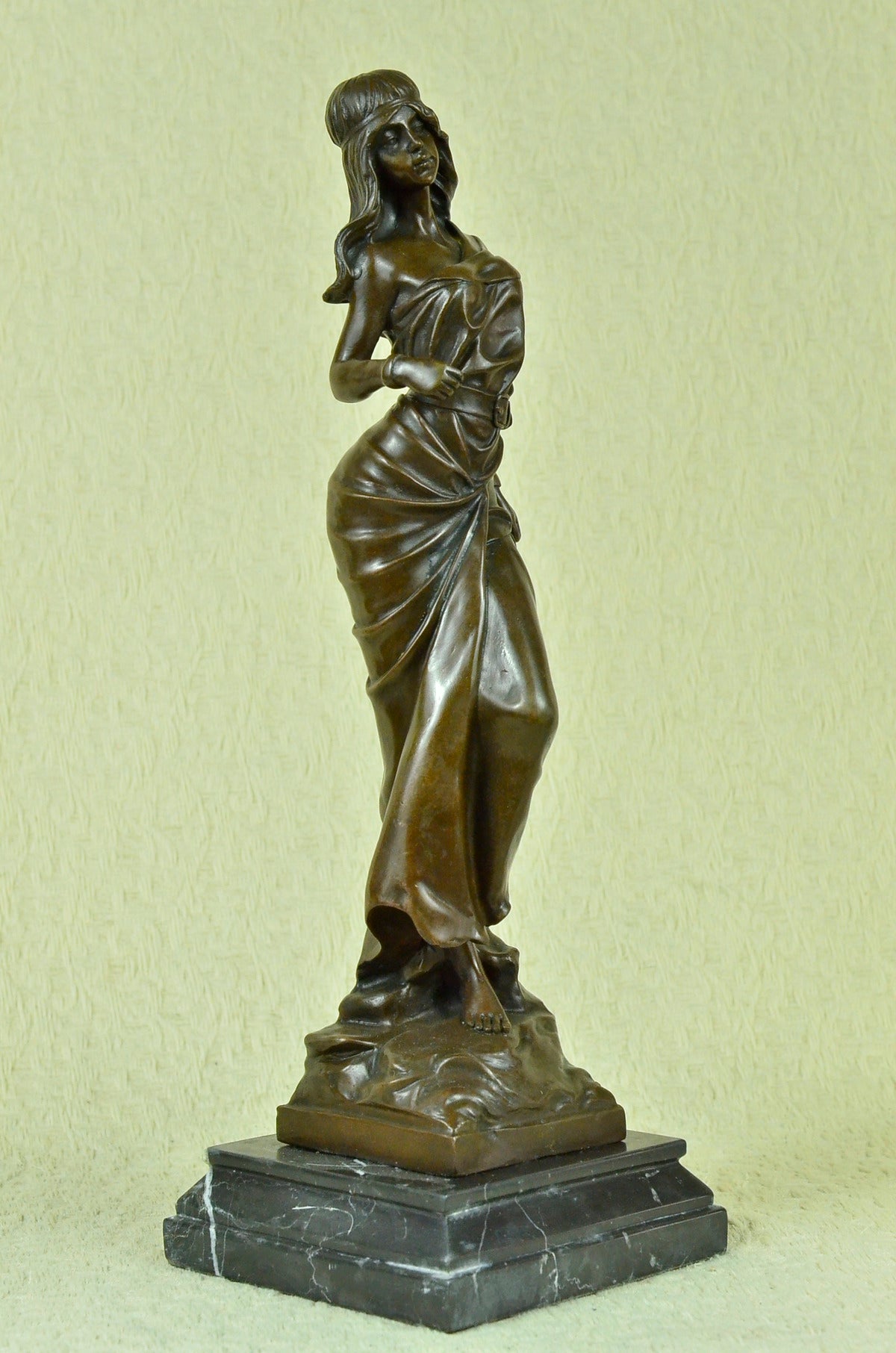 She is the most sought after girl. As she walks, all eyes follow. She is the source of all the men`s desire and the source of all the women`s envy. Her confidence radiates, as she struts unaware of the attention she is commanding. She wears a careless dress that appears to have just been thrown on without much thought but it fits her perfectly. It hangs off her shoulder and drapes over her curves. A belt rests high on her waistline. She wears a cuff around her delicate wrist. A headband crowns her head, as her feathery hair frames her face. 100% bronze and handmade, this brown patina sculpture was cast using the "Lost Wax Method" and mounted on a marble base and is signed C. Mirval.Bronze Dimensions with Marble Base:Height 17" x Width 6"