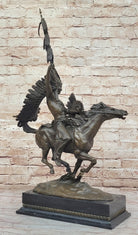 Mounted on a black marble base, this masterpiece commands attention with its commanding presence and evocative storytelling. Whether displayed in a private collection or a public space, this sculpture pays homage to the enduring legacy of the American Indian warrior spirit, a symbol of honor, tradition, and heritage.Bronze Dimensions with Marble Base: Height 28" X Width 20"
