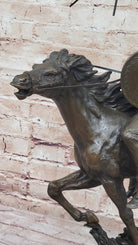 Using the ancient lost wax method, each detail of the warrior and his horse is meticulously rendered, from the flowing mane to the intricate armor adorning the rider. The rich brown patina finish lends a timeless quality to the sculpture, enhancing its depth and dimension.