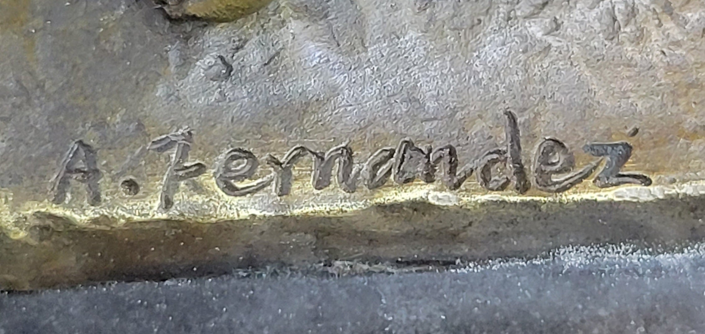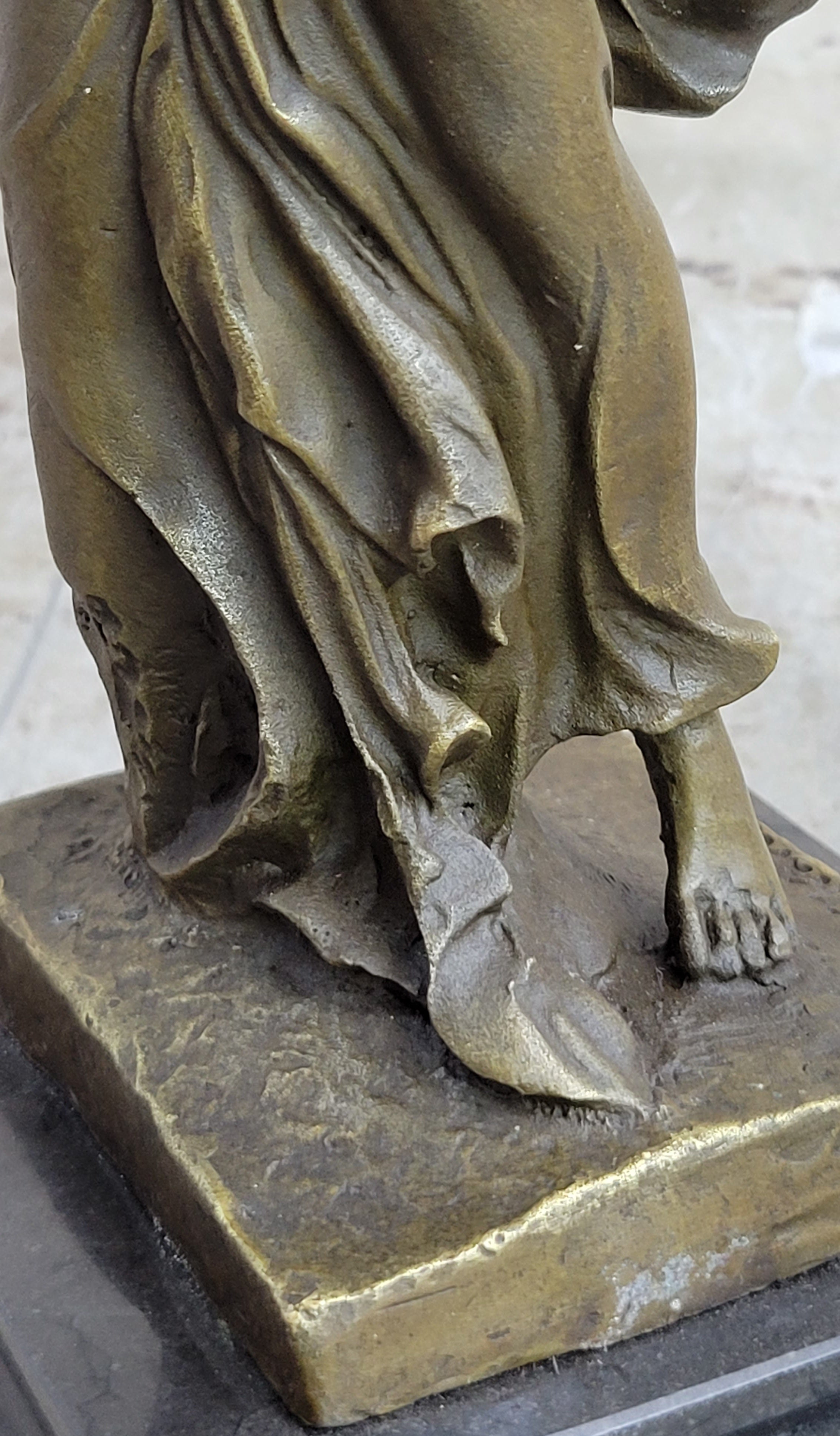 Signed by the talented artist A. Fernandez, this bronze replica is a testament to the enduring legacy of the Winged Nike of Samothrace. Whether displayed in a home, office, or gallery, it serves as a reminder of the timeless beauty and symbolism of ancient Greek art, inspiring all who encounter it with its majestic presence and historical significance.Bronze Dimensions with Marble Base: Height 11" X Width 5"