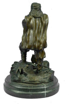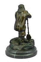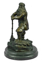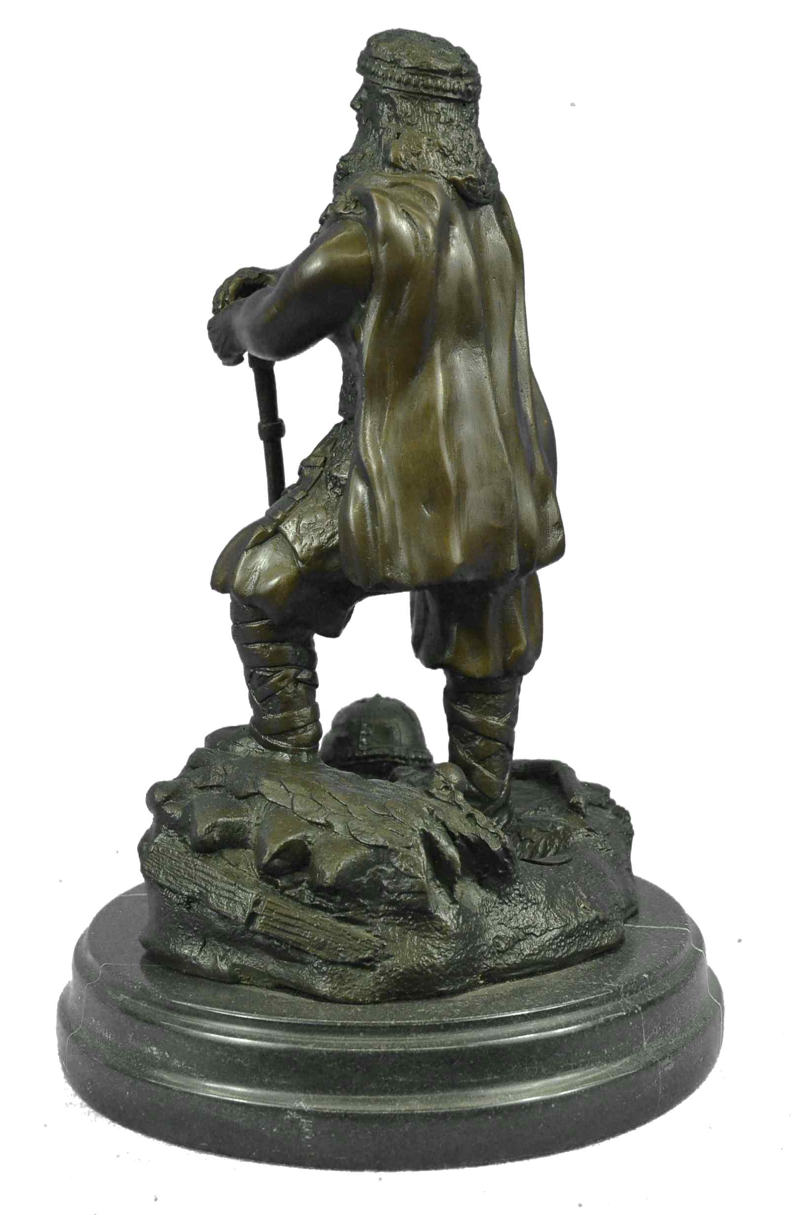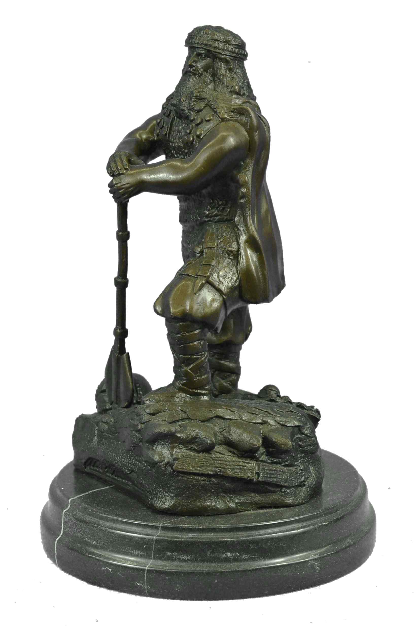 Known for their heavy armor, and powerful brute strength a Viking Huscarl gained respect among Europeans. This Norseman stands proudly digging his two-sided axe into the ground and stepping one foot a level higher in the signature pose of power and pride. Fully outfitted in armor, shoes, and a cape this warrior has all the elements of a great fighter. This 100% bronze sculpture was crafted using the lost wax method. The piece stands on a circular black marble base. It is signed Chris Miles.Bronze Dimensions with Marble Base:Height 12" x Width 8"