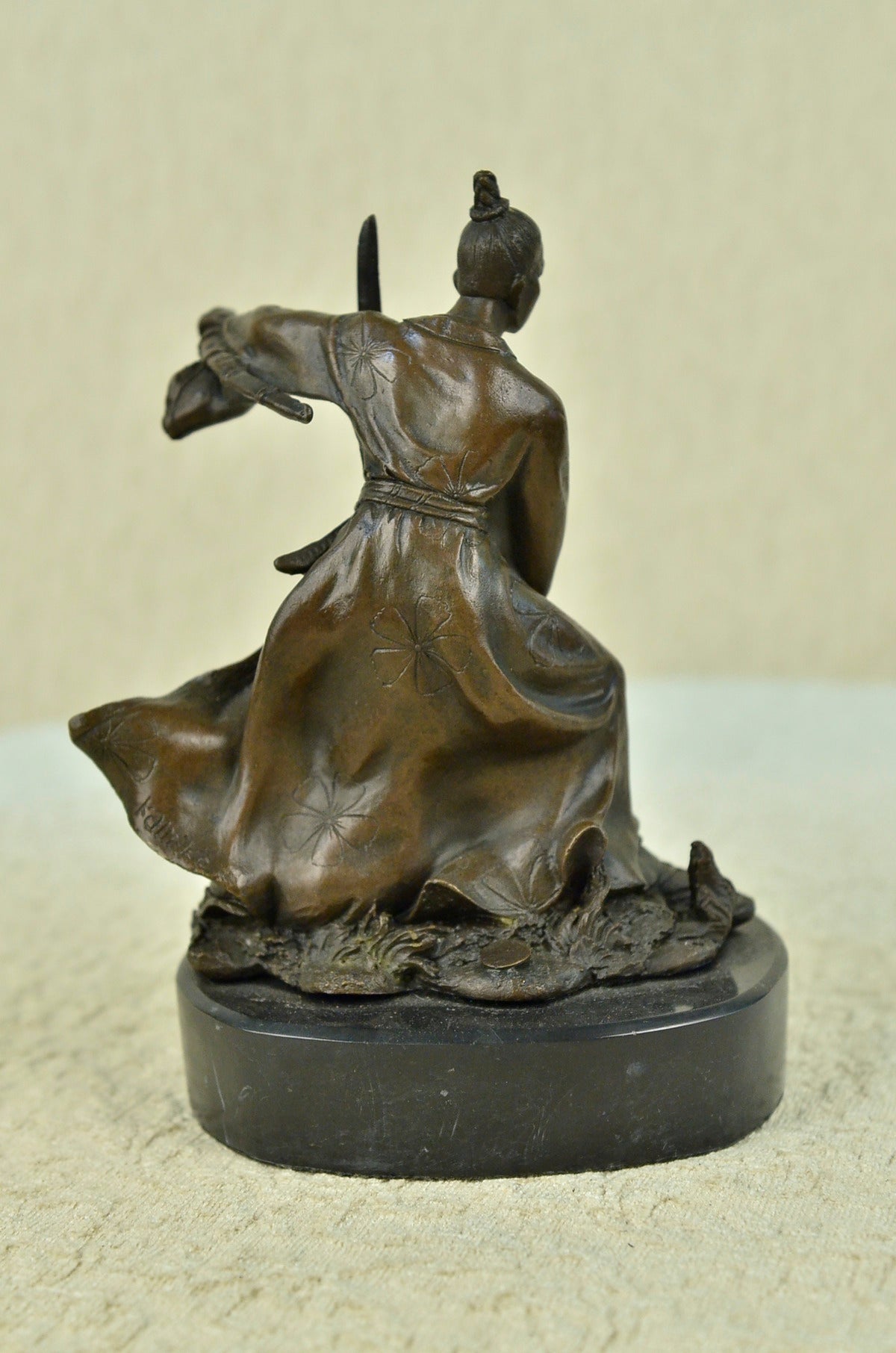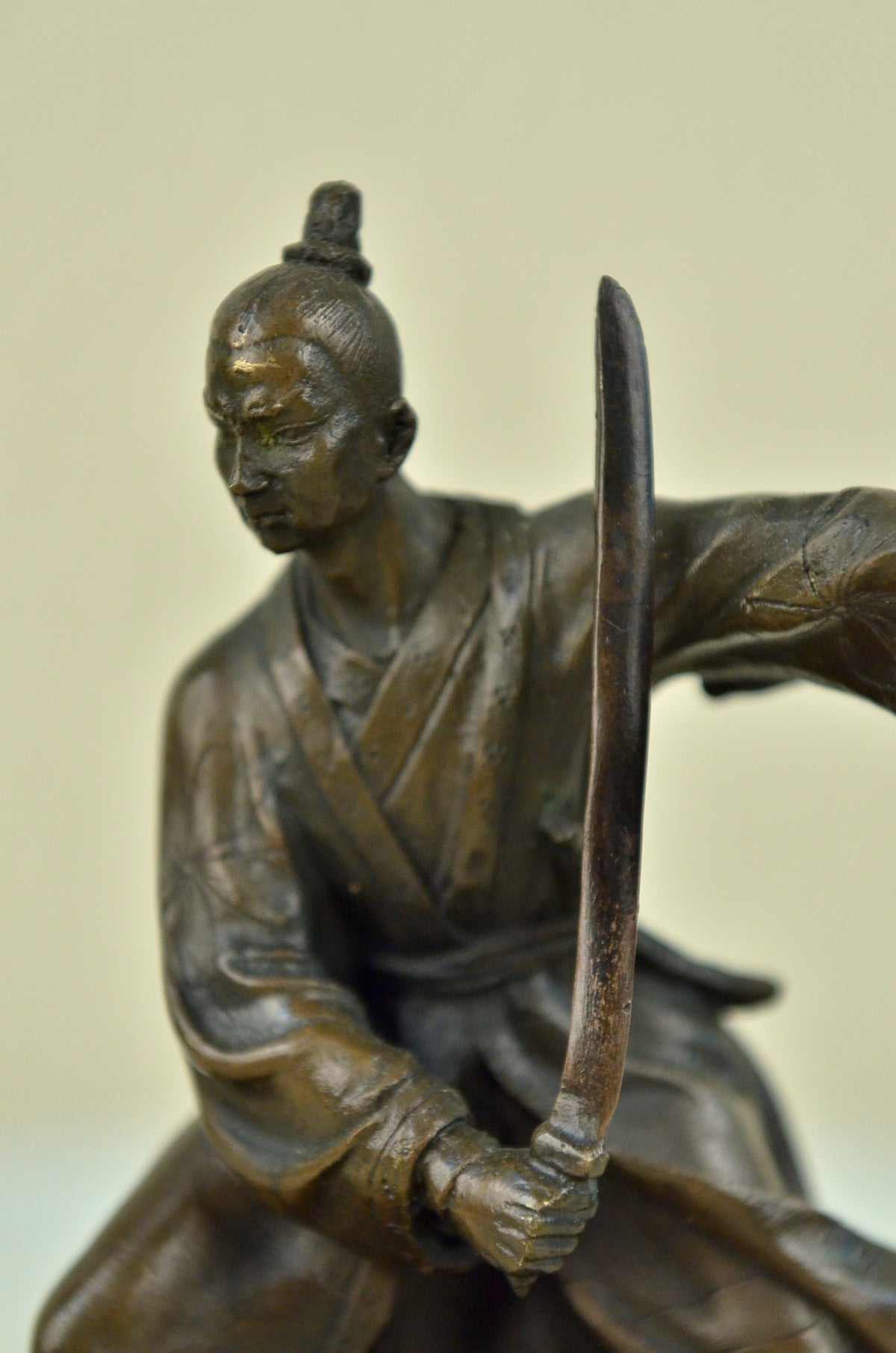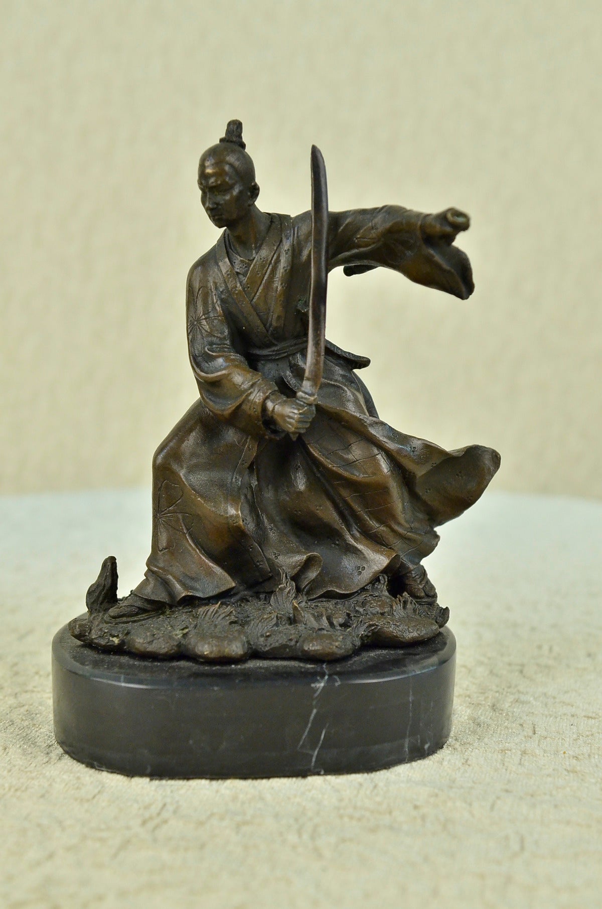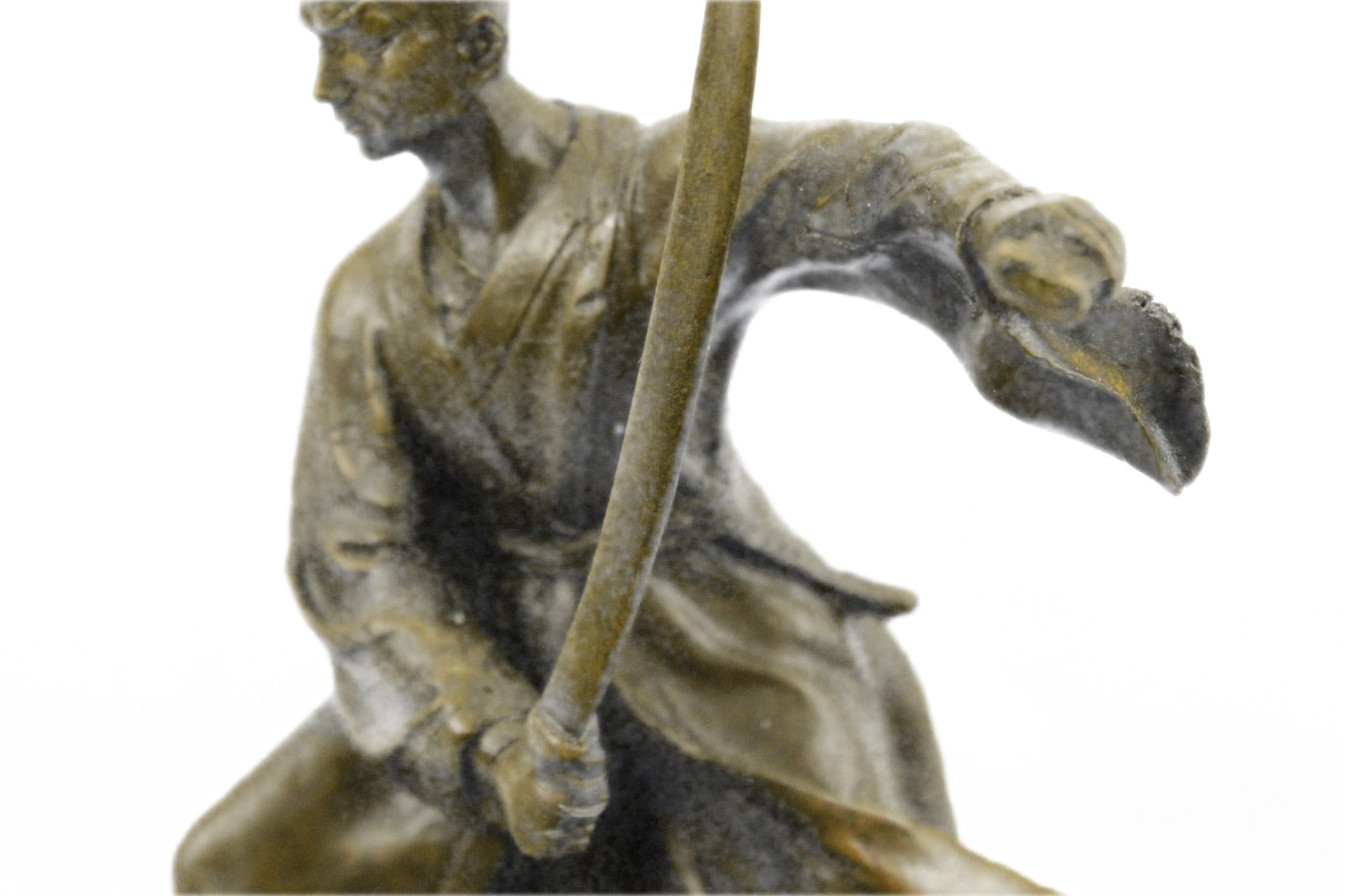 This Asian man is doing his normal routine, as he practices his Martial Arts with his sword. As steady as he can be, he takes his time making sure he does not make any mistakes. In Martial Arts its all about consistency and patience, without one or the other it is impossible to keep all the work you put into it well done. He is wearing a long robe that ties around his waist and has these beautiful flower decoration all around it. His hair is tied slick back into a high neat bun, to make sure he does not get any hair in his face while he practices. This sculpture was cast using the ancient old "Lost Wax Method" stained in brown patina finish for preservation, mounted atop a black marble base and is signed Kamiko.Bronze Dimensions with Marble Base:Height 8" x Width 5"