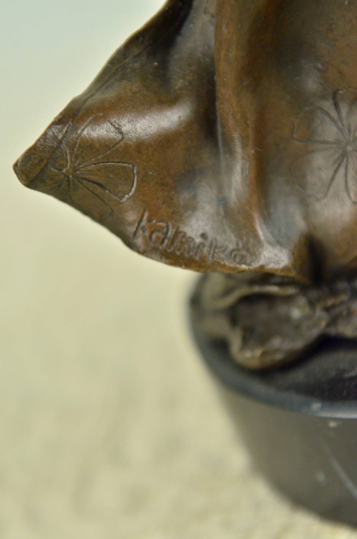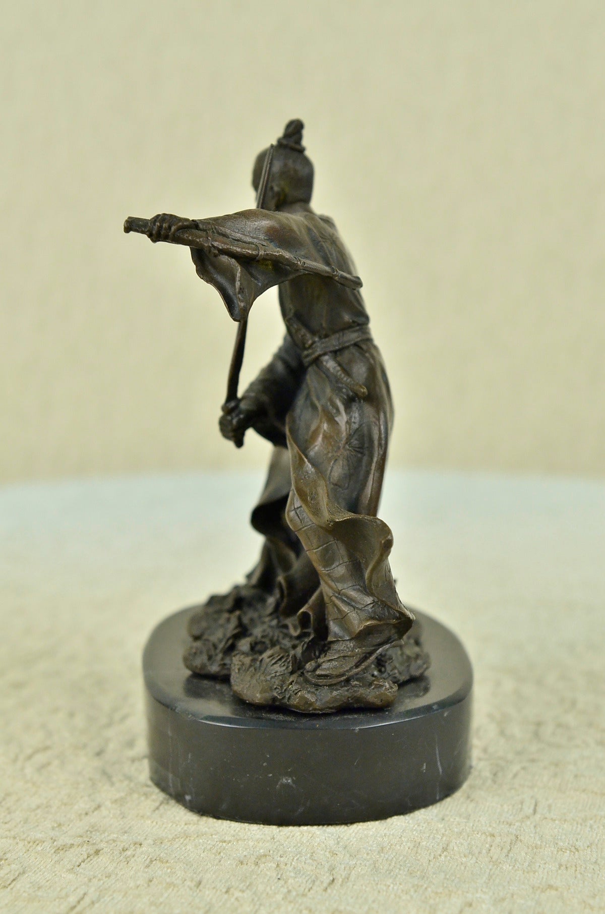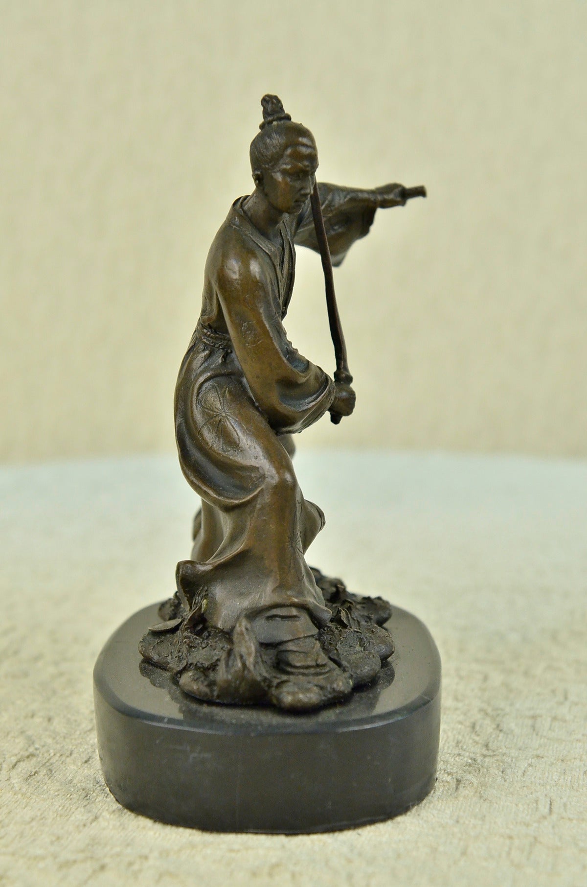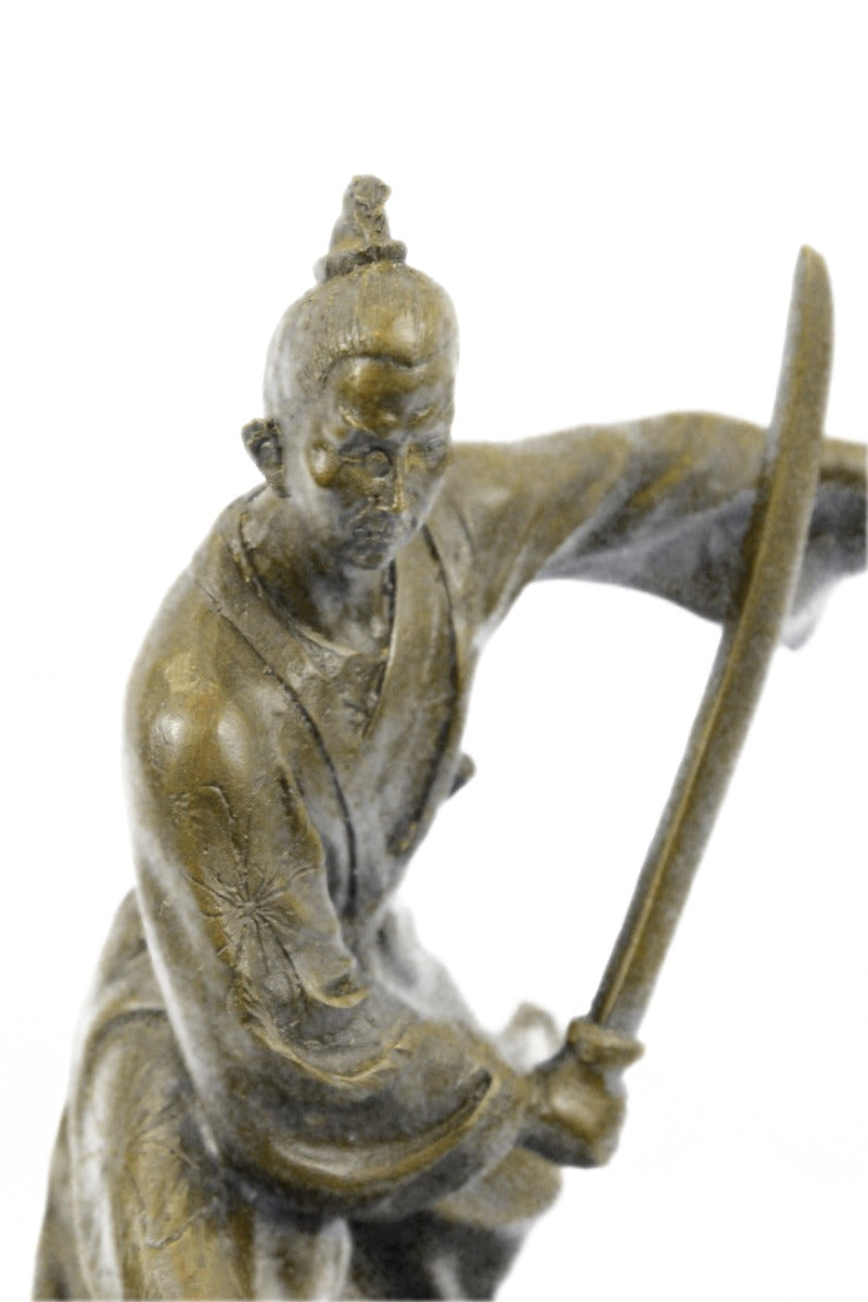 This Asian man is doing his normal routine, as he practices his Martial Arts with his sword. As steady as he can be, he takes his time making sure he does not make any mistakes. In Martial Arts its all about consistency and patience, without one or the other it is impossible to keep all the work you put into it well done. He is wearing a long robe that ties around his waist and has these beautiful flower decoration all around it. His hair is tied slick back into a high neat bun, to make sure he does not get any hair in his face while he practices. This sculpture was cast using the ancient old "Lost Wax Method" stained in brown patina finish for preservation, mounted atop a black marble base and is signed Kamiko.Bronze Dimensions with Marble Base:Height 8" x Width 5"
