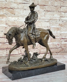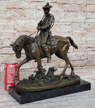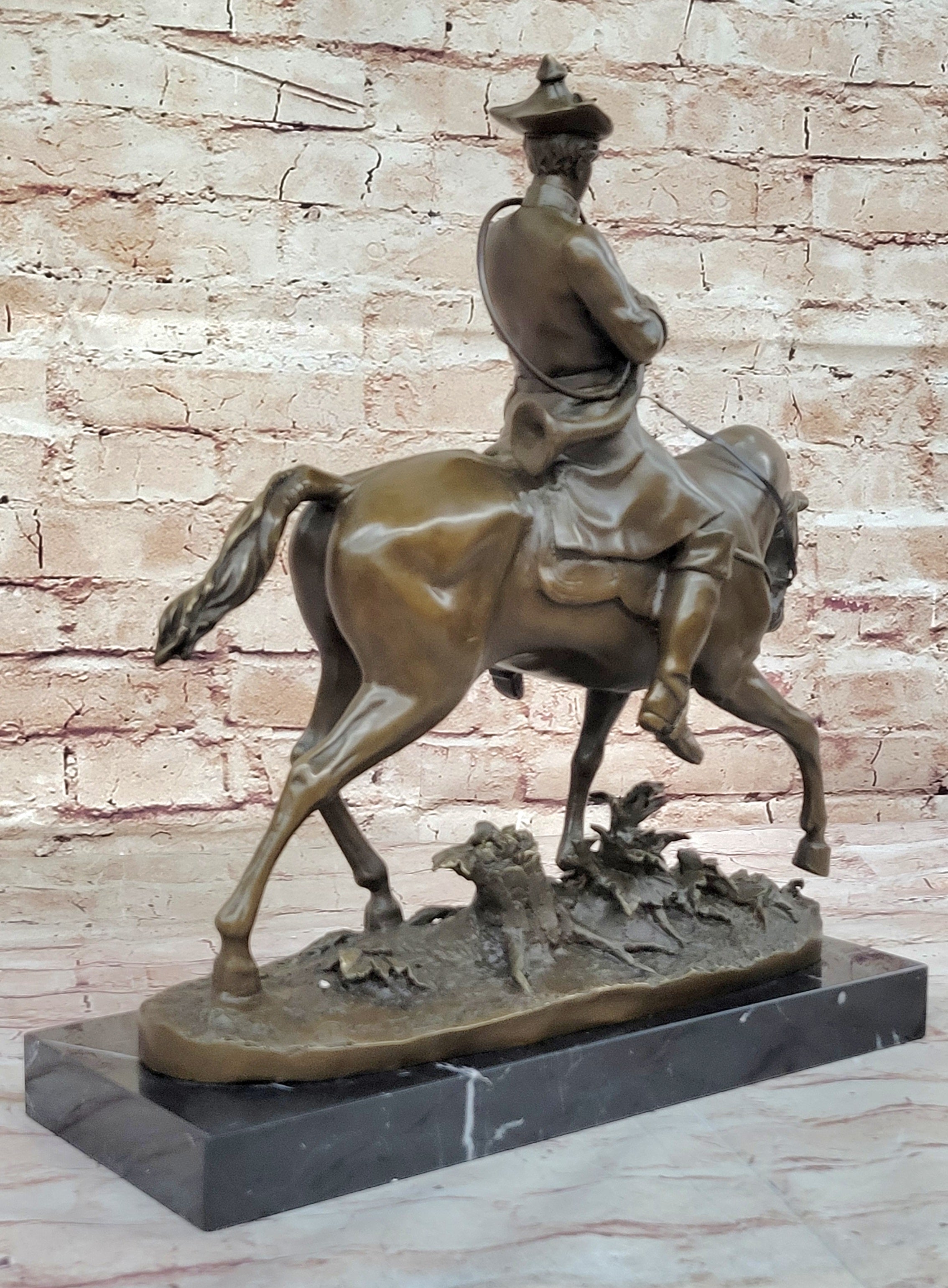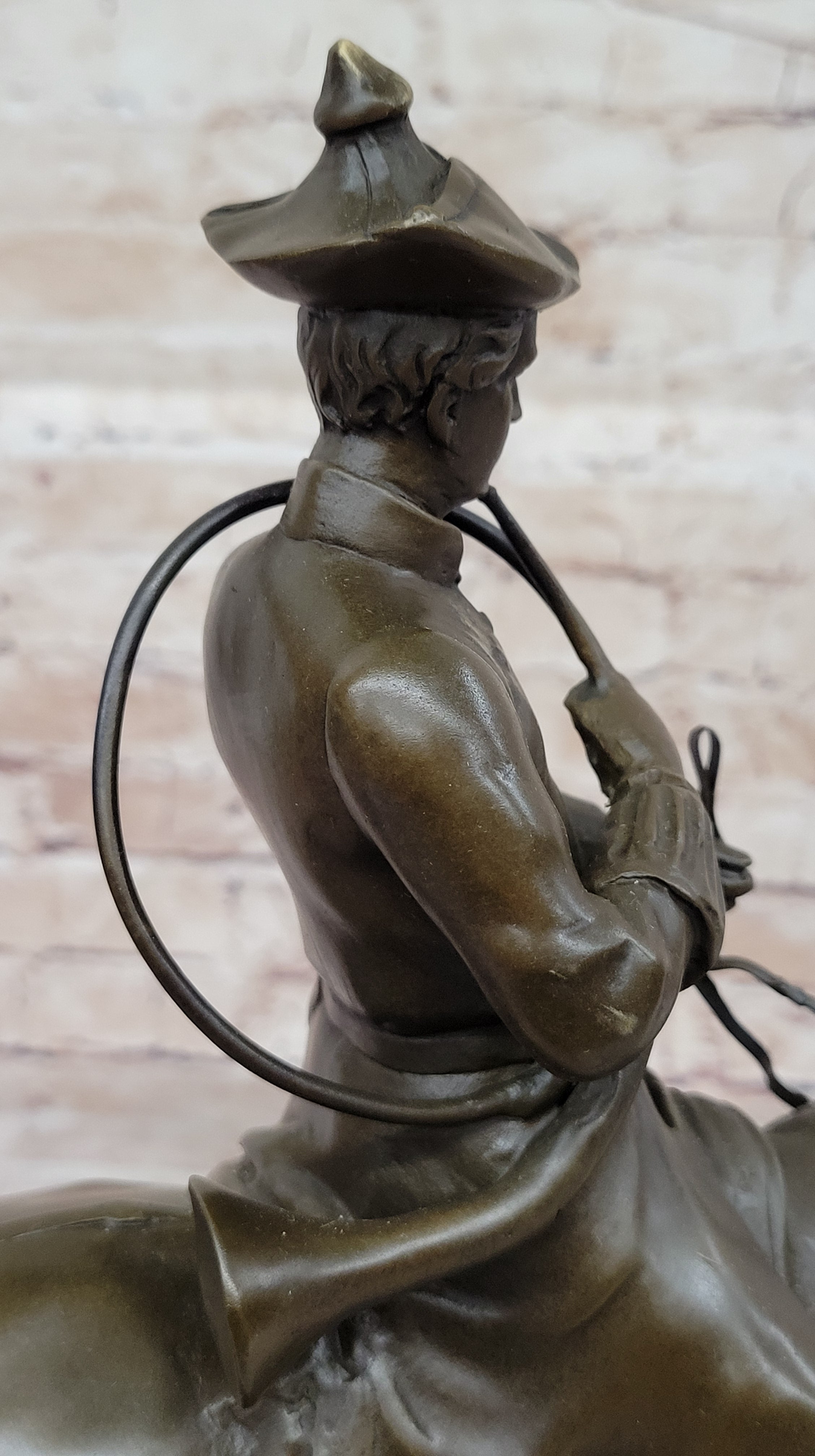 Introducing a magnificent and substantial handcrafted bronze statue, The Hunt Scene by P.J. Mene. This exceptional piece stands as one of the most coveted creations by P.J. Mene, a renowned master among 19th-century French bronze sculptors. The statue portrays a hunter mounted on horseback, capturing the essence of a dynamic hunting scene. This particular piece is a faithful reproduction crafted in the mid-20th century, paying homage to the timeless artistry of the original.