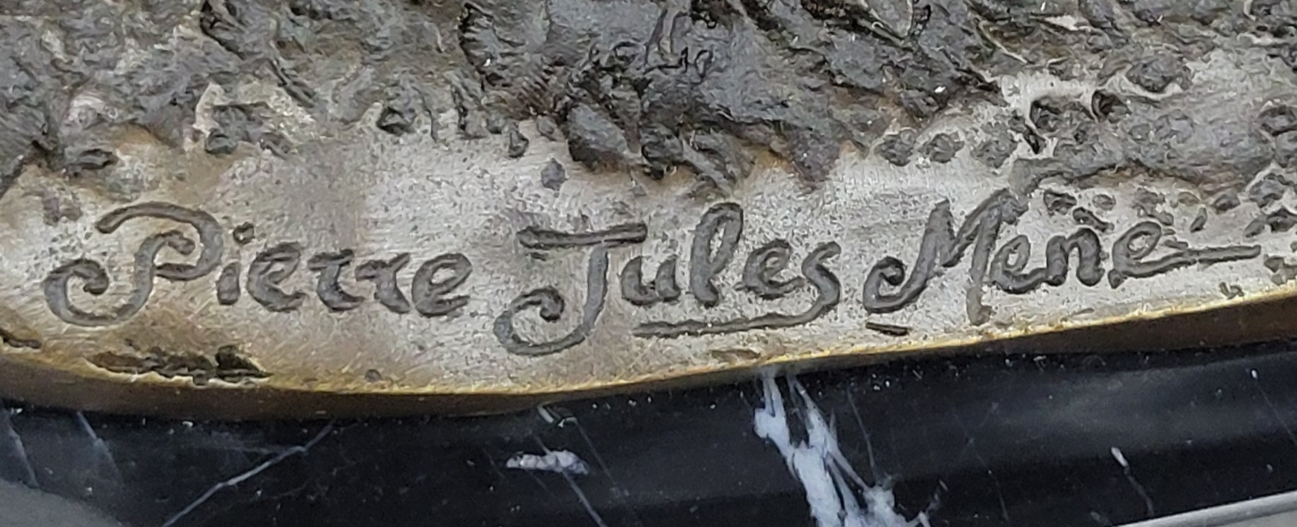 Perched upon a sleek black marble base, the statue exhibits a seamless blend of artistry and craftsmanship. The intricate details and dynamic composition showcase P.J. Mene's mastery in conveying movement and vitality through bronze. As a hallmark of quality, the sculpture bears the signature of Jules Mene, affirming its lineage to the esteemed artist.
