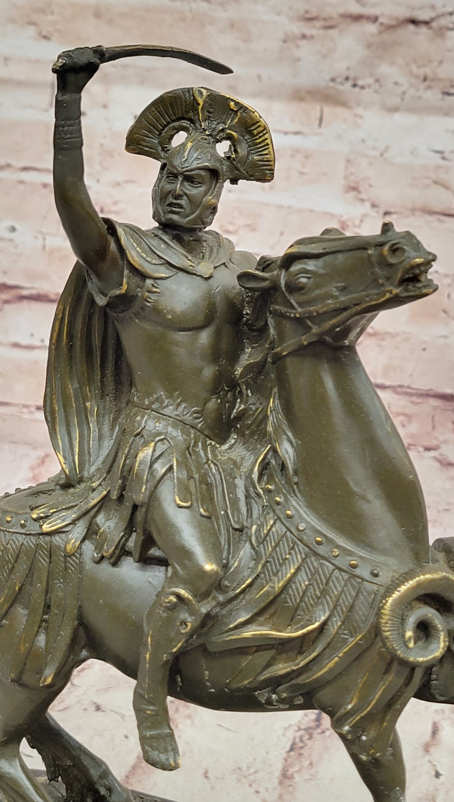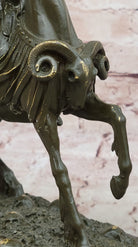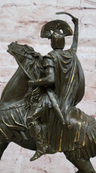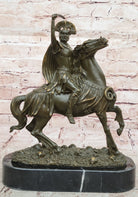 This powerful Roman Centurion Officer on Horseback bronze sculpture captures the commanding presence and disciplined might of an elite Roman warrior in full charge. Clad in traditional armor, the centurion sits proudly atop his rearing horse, gripping a sword with unwavering determination. The dynamic pose and rich historical symbolism make this an extraordinary tribute to ancient military excellence.