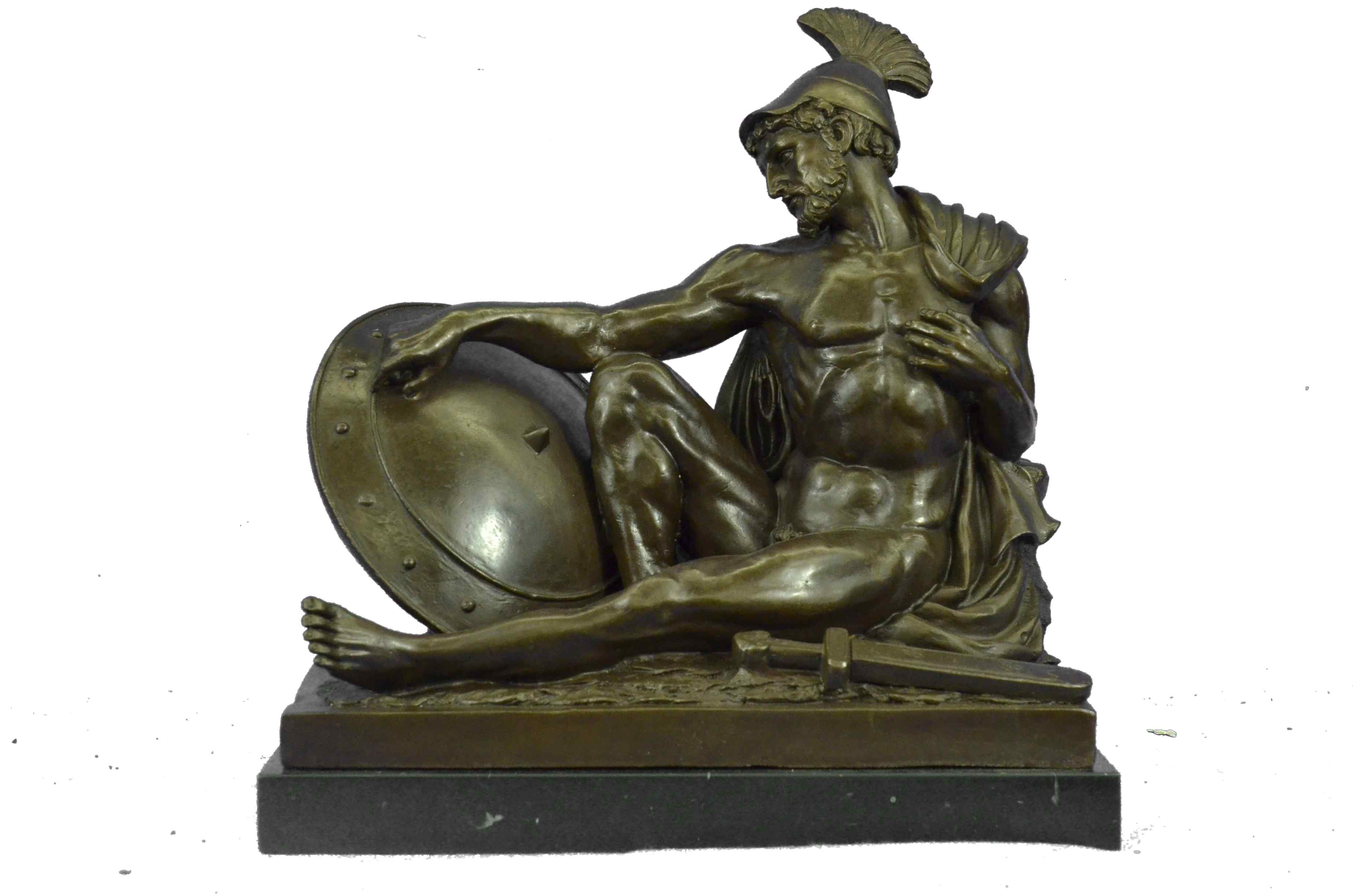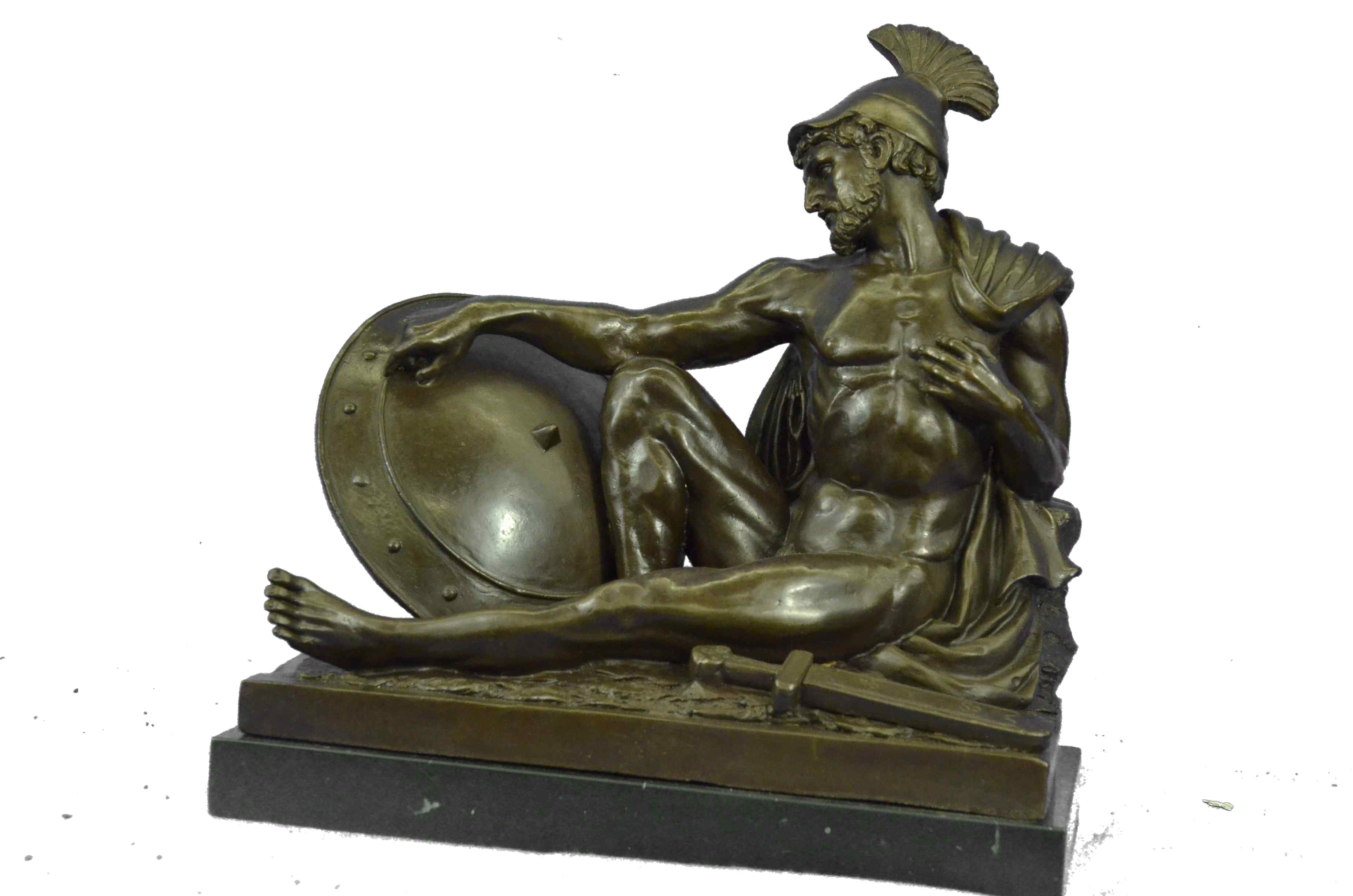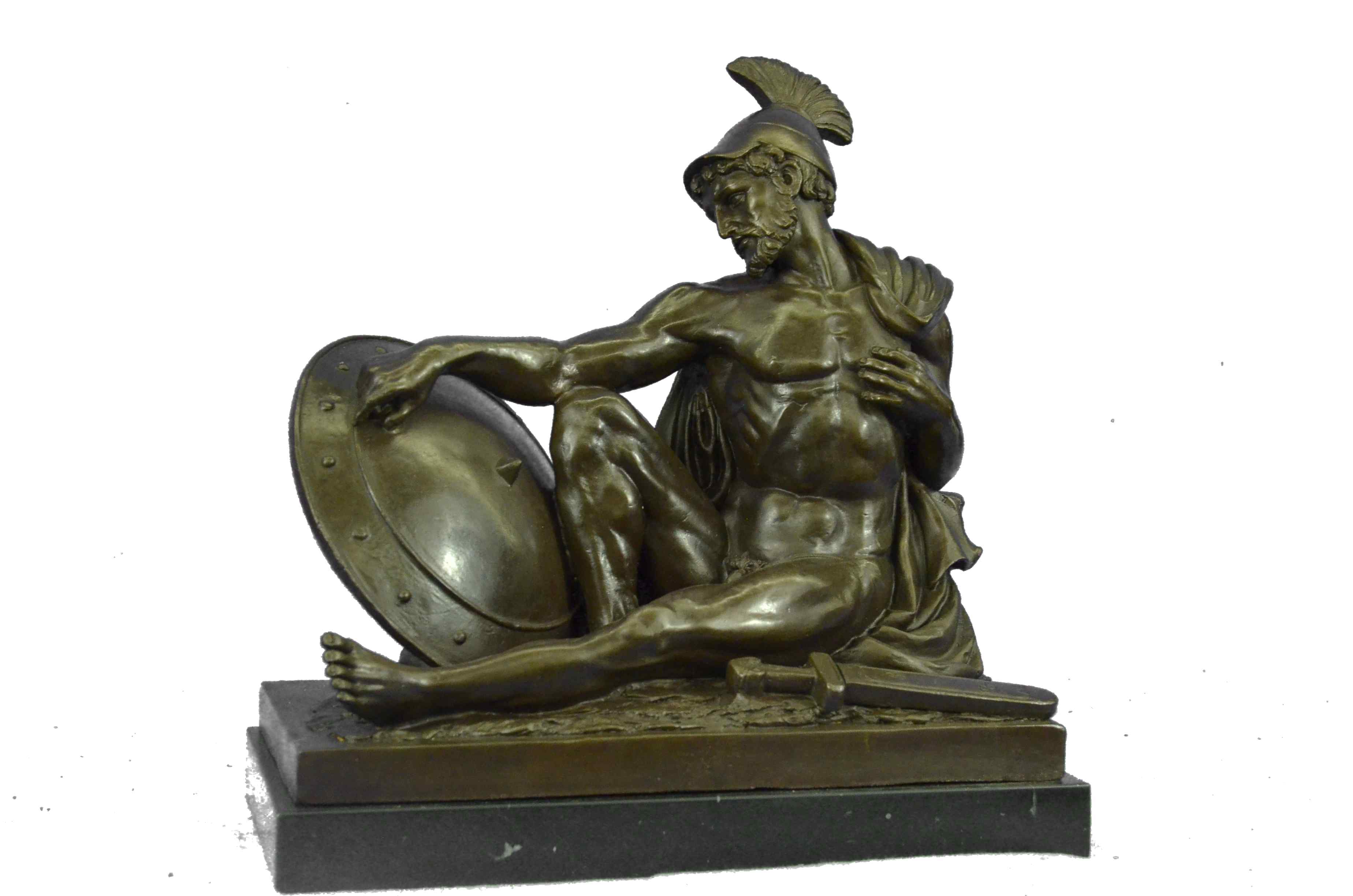 War-weary, the nude Roman legion has collapsed onto the floor. Dropping his dagger to unfasten his cloak, he begins to rest his head against a wall, letting his guard fall. Despite his fatigue, his eyes are open and transfixed, as he unblinkingly recalls the screams and horrors of the war that turn and twist inside his mind. The handmade bronze sculpture was molded using the archaic methods of lost-wax casting and stained with a brown patina finish. He stands upon a black marble base with the European Bronze Finery stamp of quality and the artist J. Debut`s signature.Original or Reproduction: Reproduction