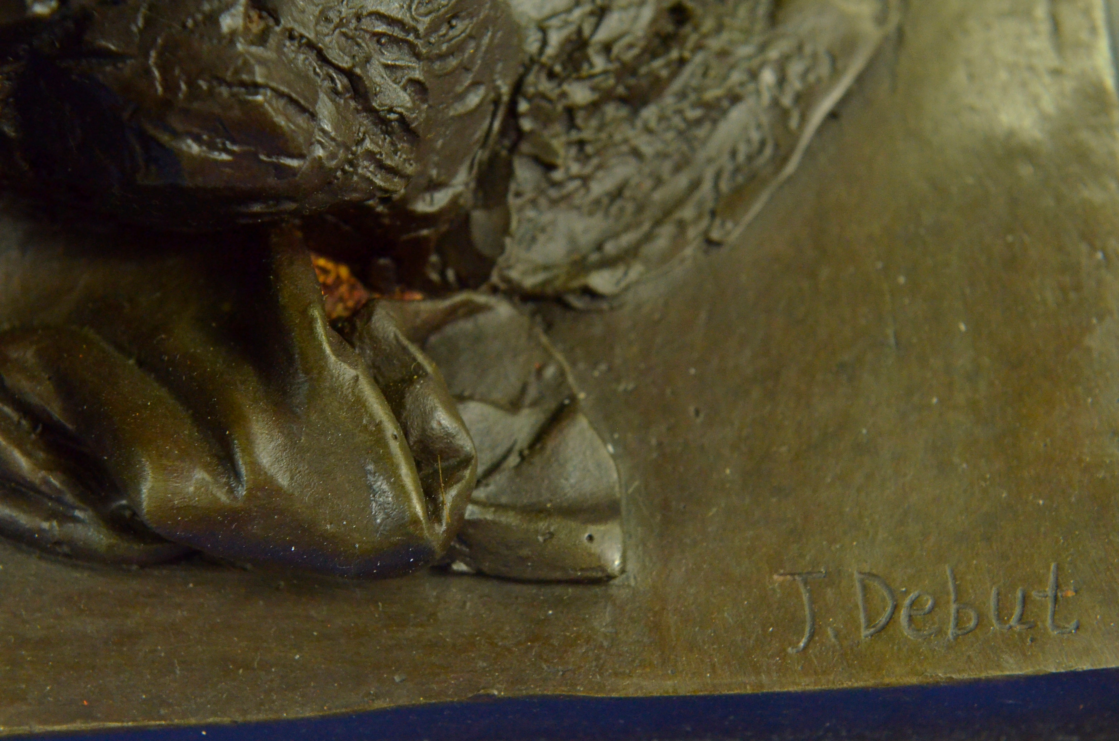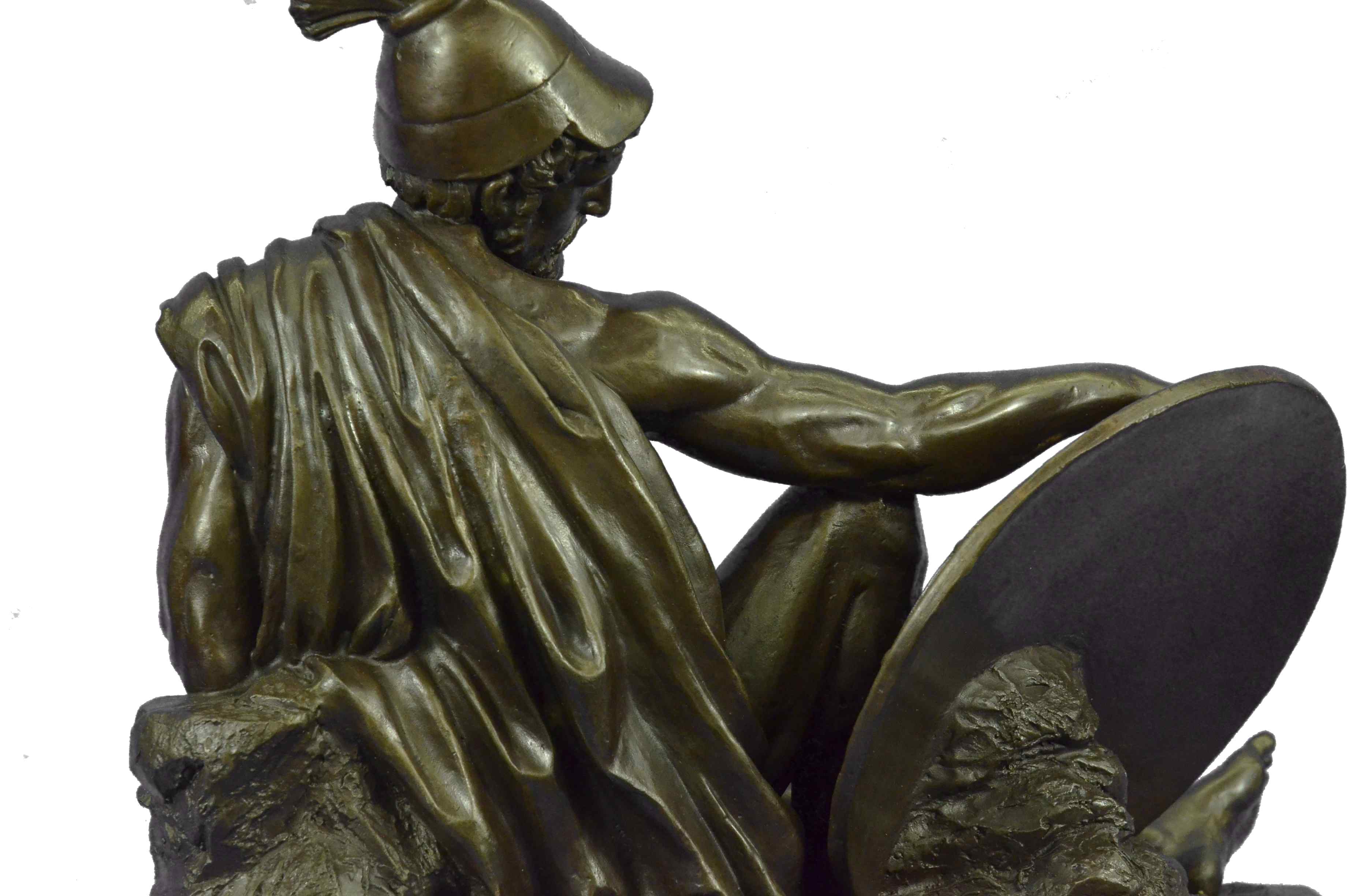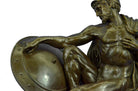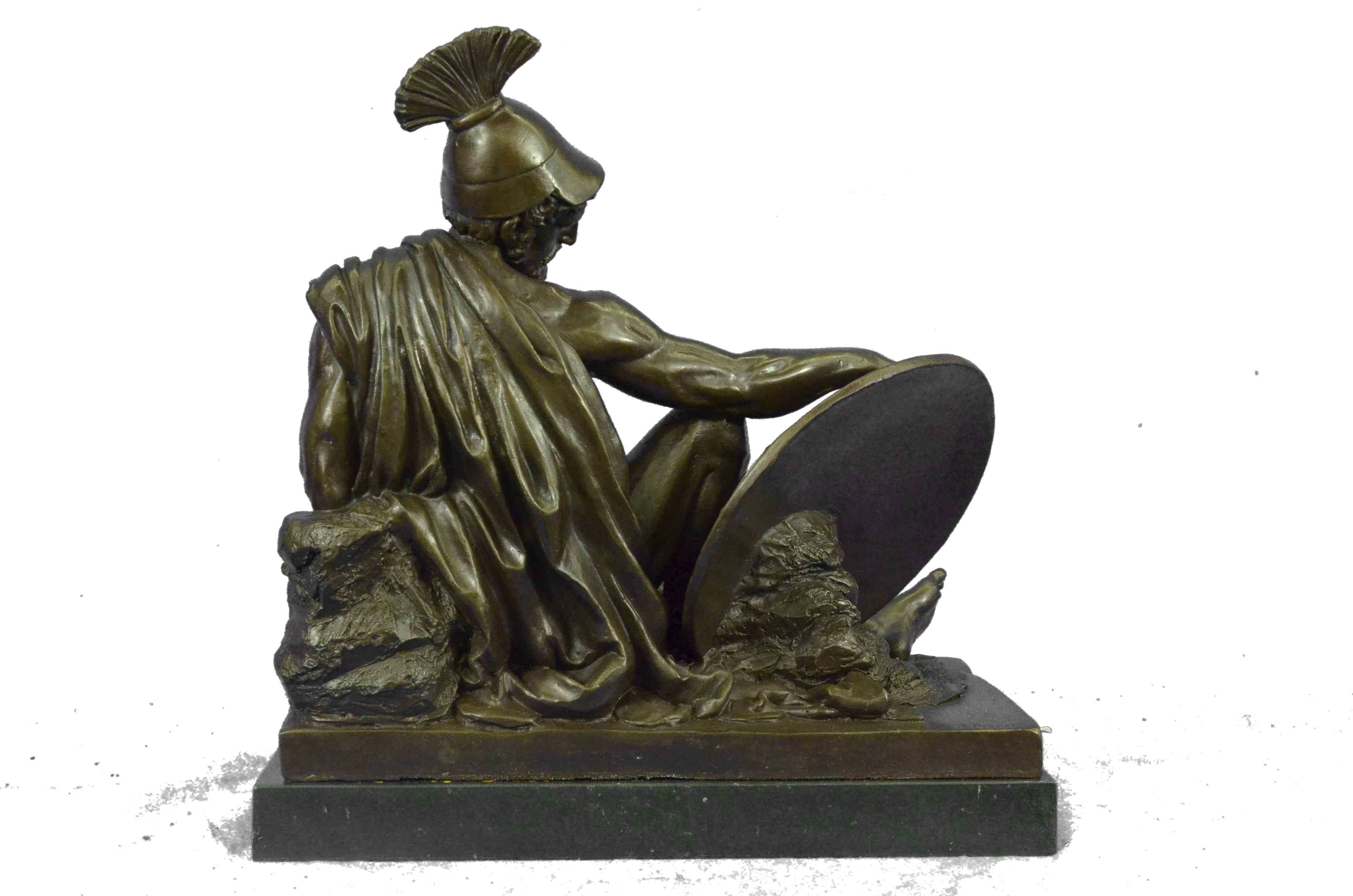 War-weary, the nude Roman legion has collapsed onto the floor. Dropping his dagger to unfasten his cloak, he begins to rest his head against a wall, letting his guard fall. Despite his fatigue, his eyes are open and transfixed, as he unblinkingly recalls the screams and horrors of the war that turn and twist inside his mind. The handmade bronze sculpture was molded using the archaic methods of lost-wax casting and stained with a brown patina finish. He stands upon a black marble base with the European Bronze Finery stamp of quality and the artist J. Debut`s signature.Original or Reproduction: Reproduction