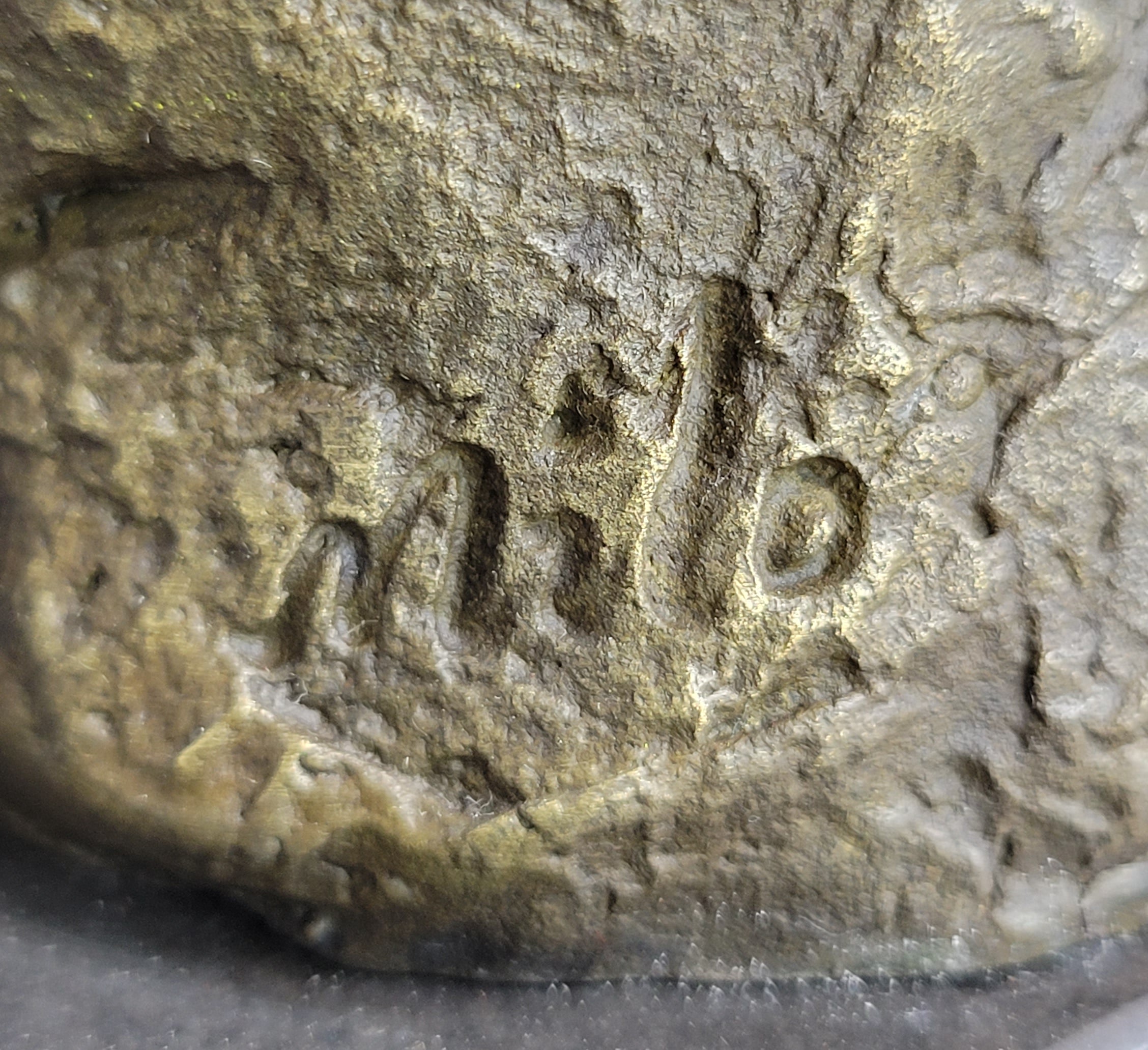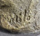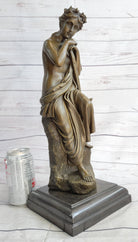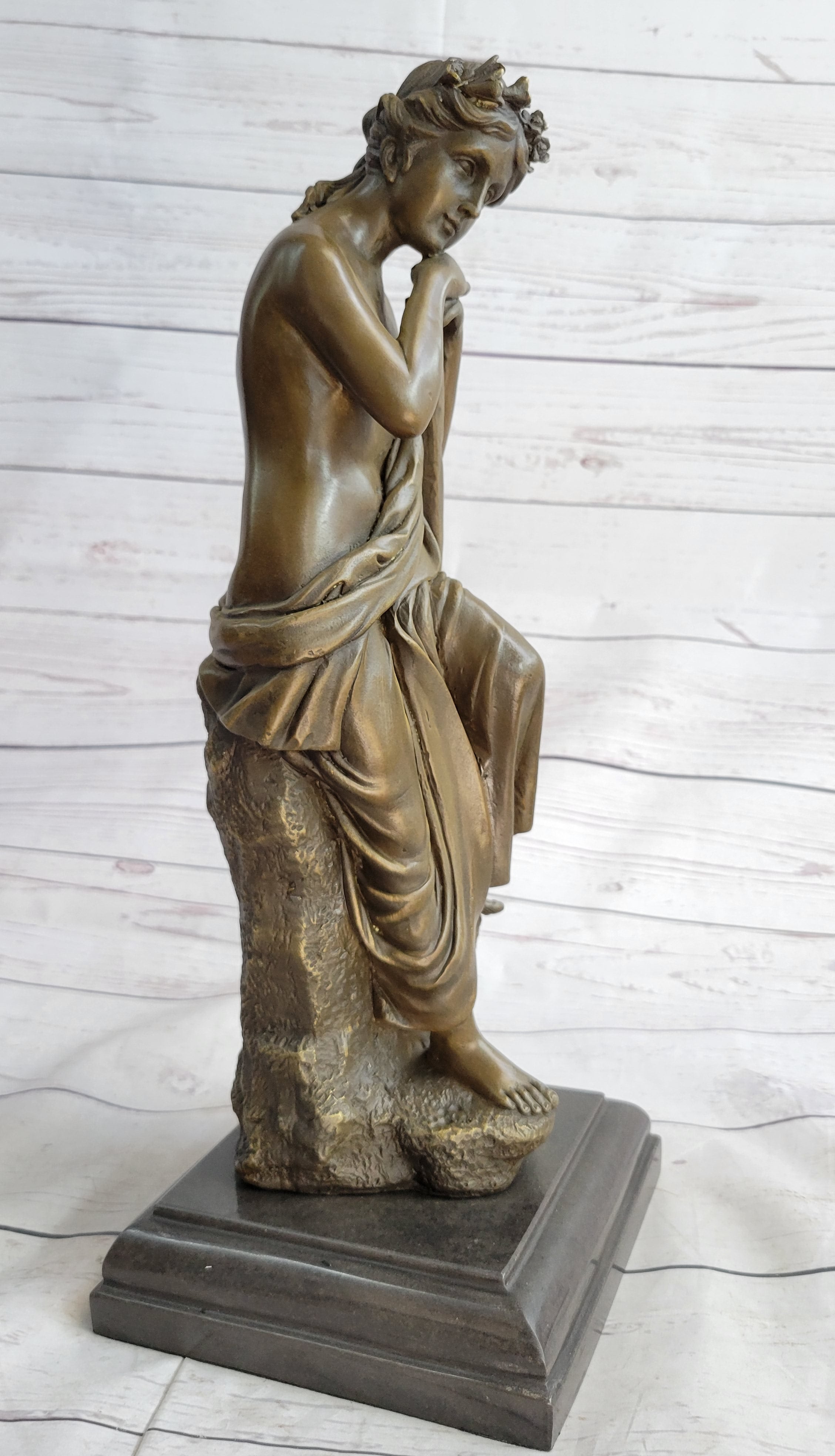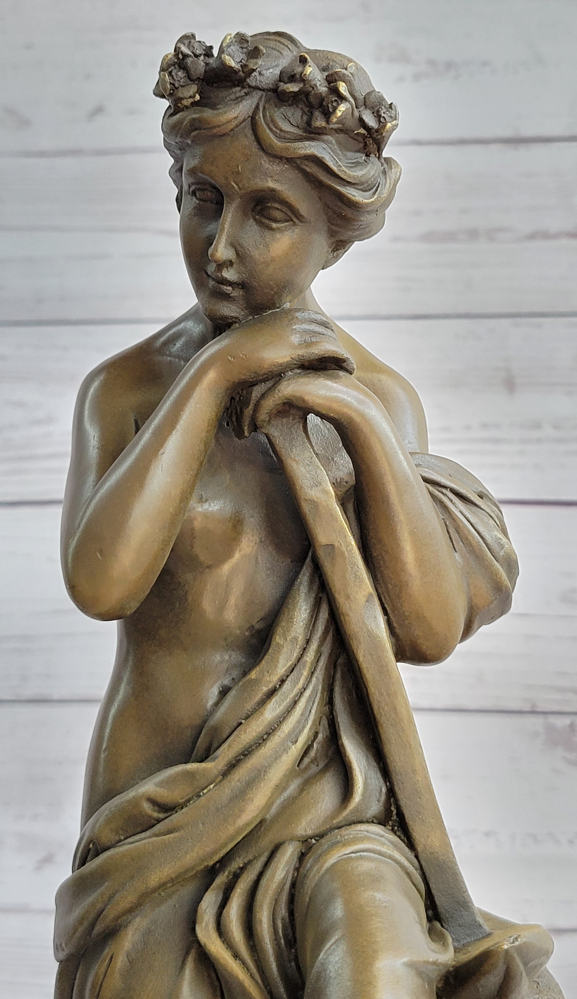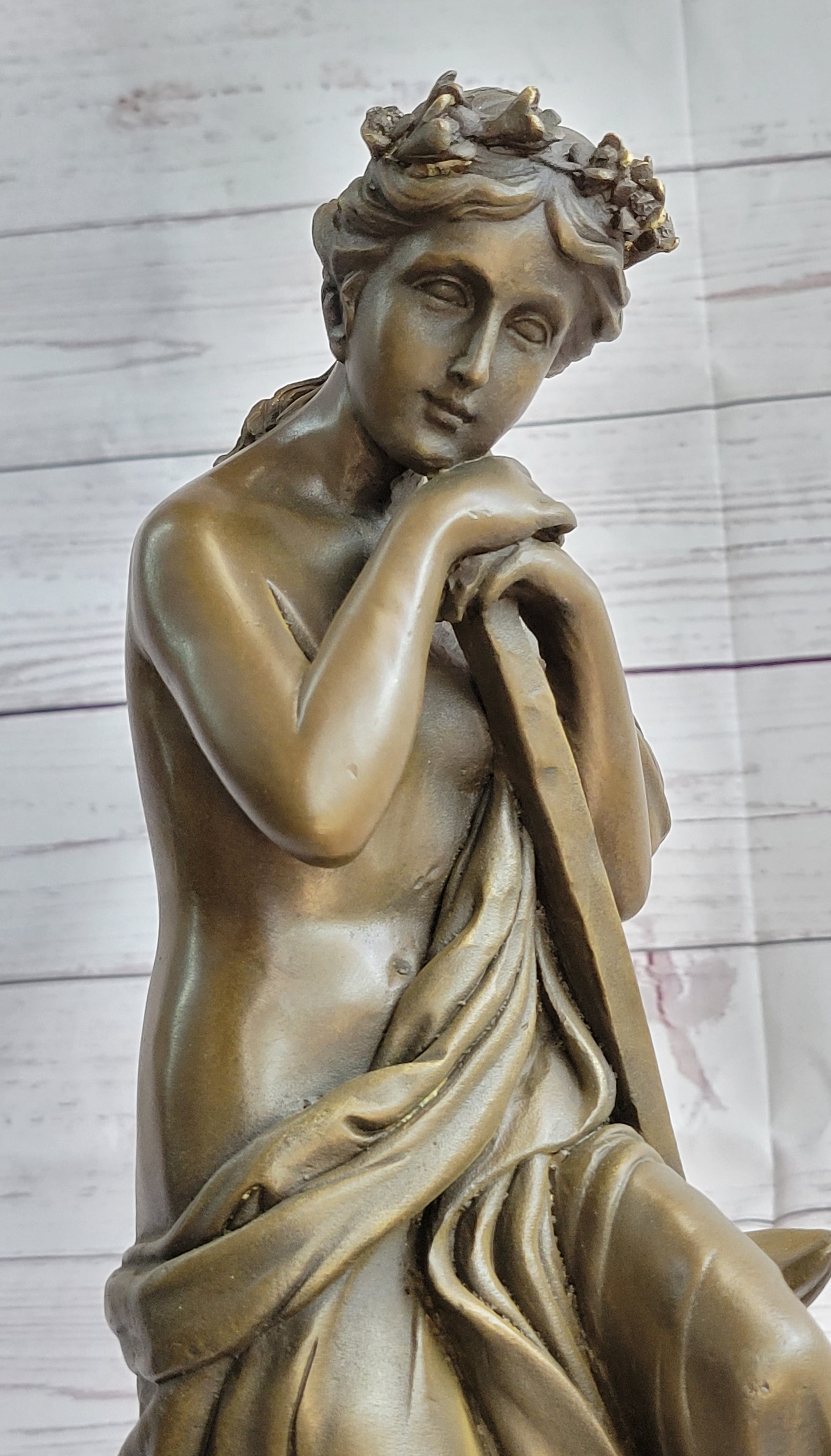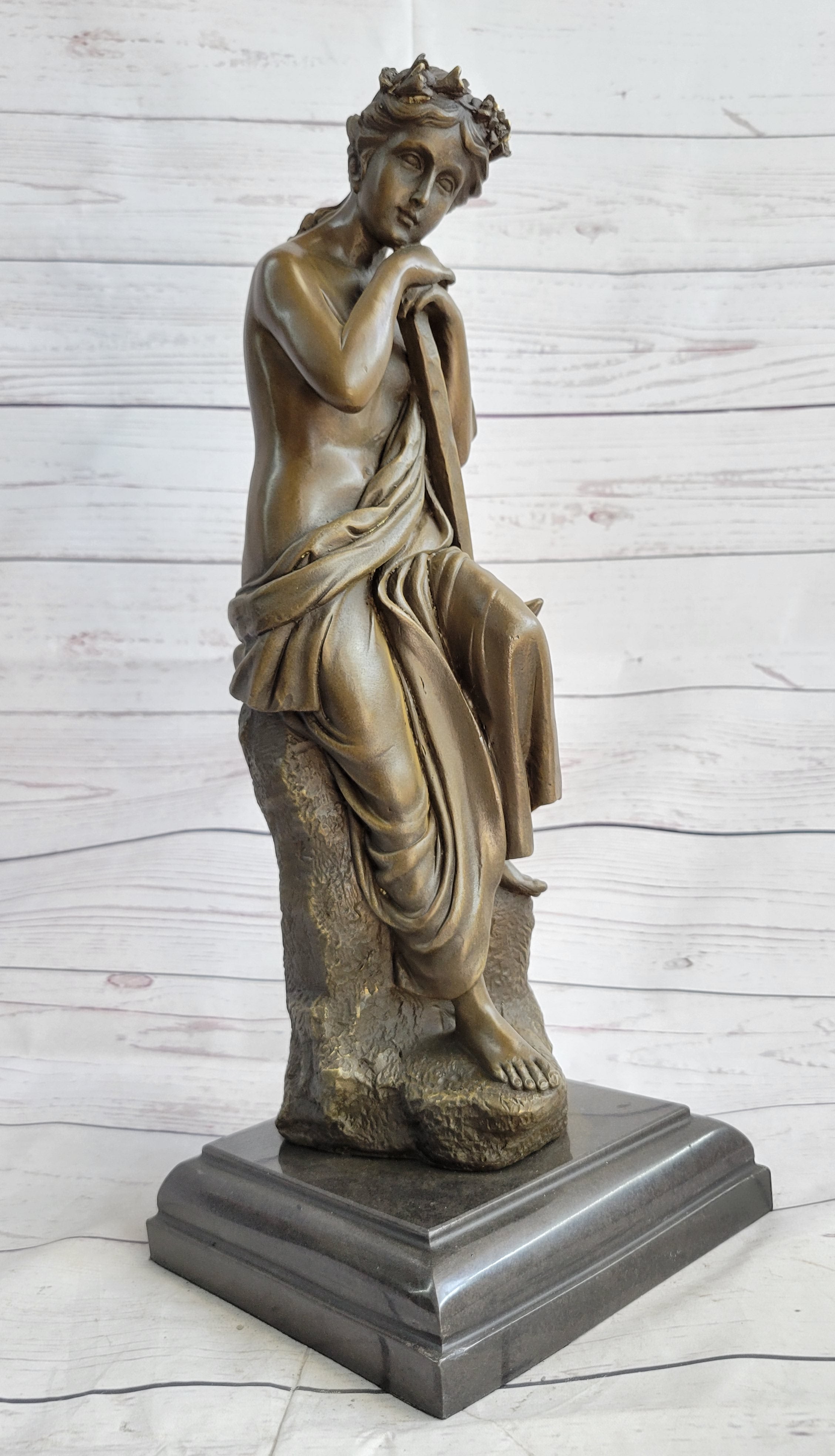 The young woman sits pensively on a high rock. Her head rests on her hands as her gaze focuses downwards. She is dressed in the semi- nude. A garment hangs from her arm and falls to her lap leaving her chest and abdomen bare. A headband of roses adorns her hair that has been styled back. This sculpture was crafted using the lost wax method. It rests on a black marble base.Bronze Dimensions with Marble Base: Height 16" x Width 5"