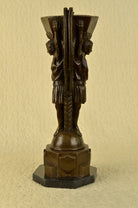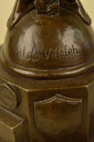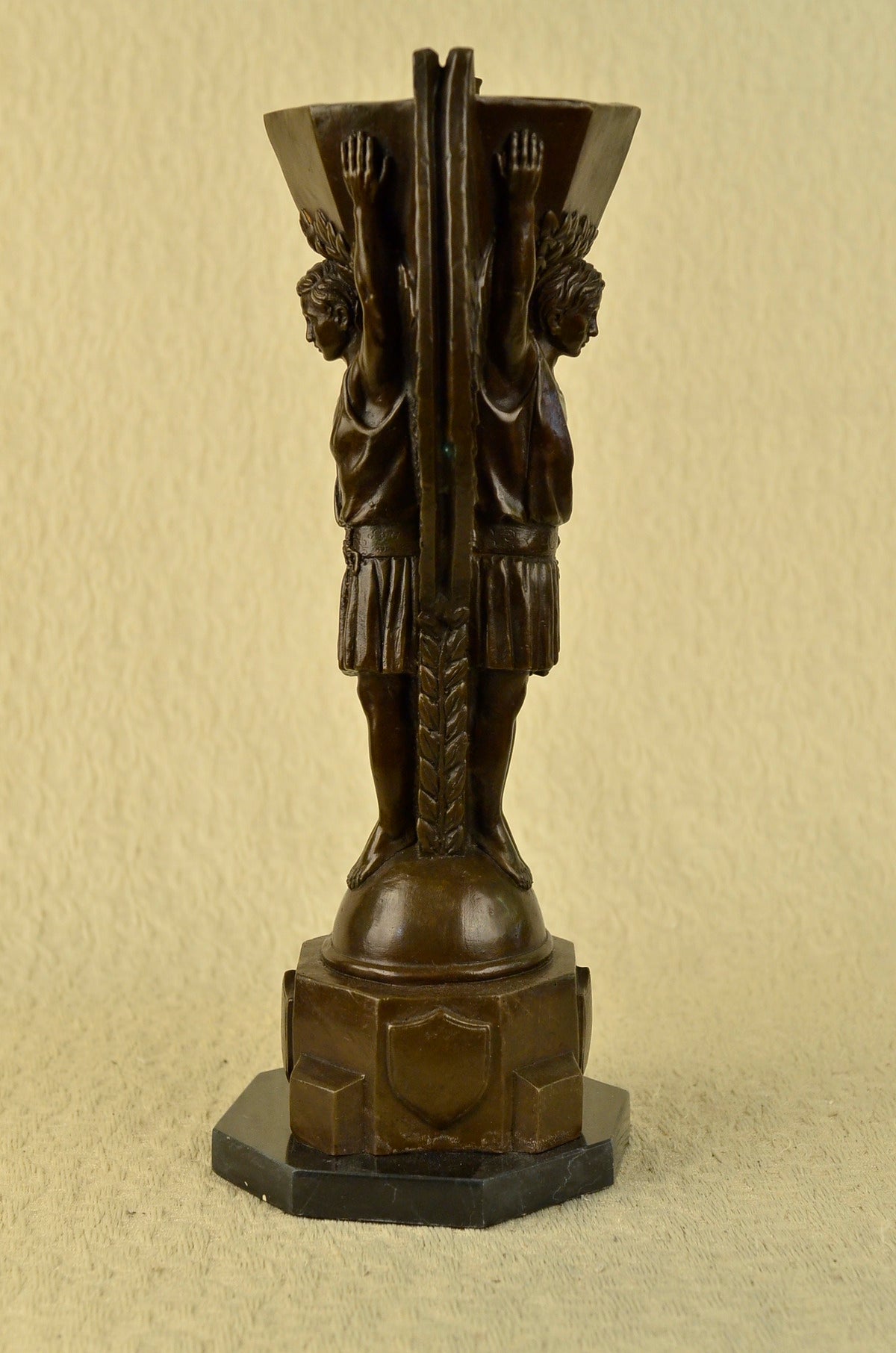 An exquisite vase that would be the center of attention in any room. This beautiful sculpture is breathtaking and an archaeologists` prized possession. Rome`s early history is shrouded in legend. The story of the origins of the legendary city claims that brothers Romulus and Remus, decided to build a city. After an argument, Romulus killed his brother Remus, thus becoming the founder of Rome. The ancient city has roots in mythology and history. Tales of Gods and Goddesses. Kings and rulers. War lost and won. And the fall of a great empire. Rome also has an extensive amount of ancient catacombs, or underground burial places under or near the city. This vase features the a Roman soldier that molds the shape of the vase. Some hold torches to light their way. The incredible details will draw you in and make your eyes follow the path they walk on. 100% bronze and handmade, this two-toned brown patina sculpture was cast using the "Lost Wax Method". It features the signature Aldo Vitaleh.Original or Reproduction: Reproduction