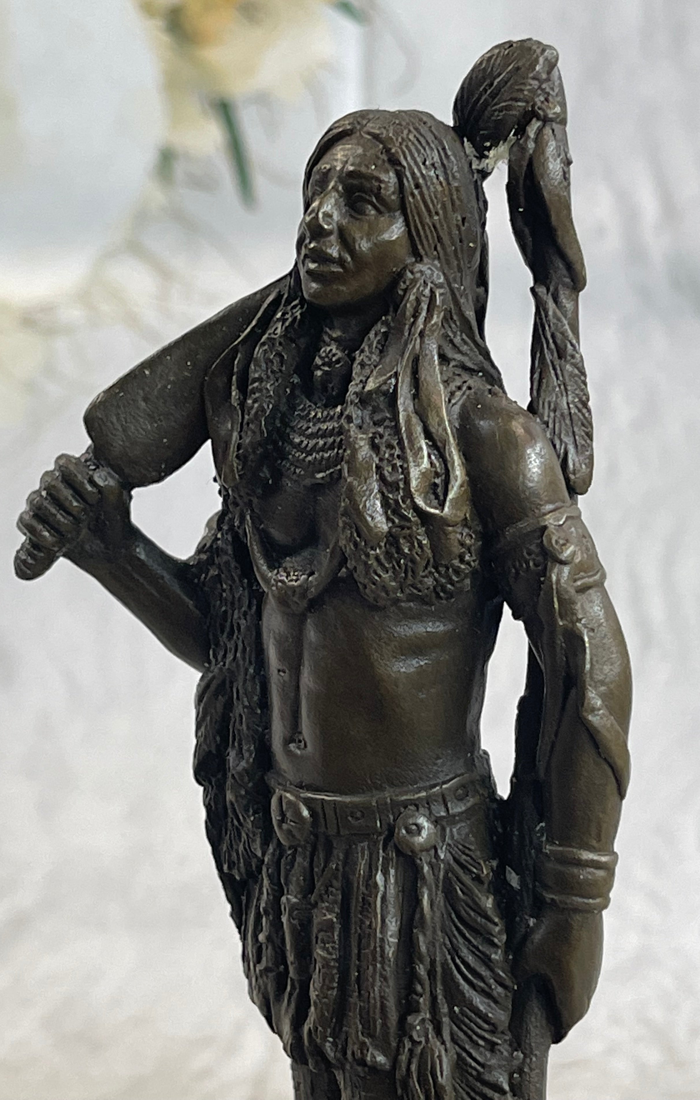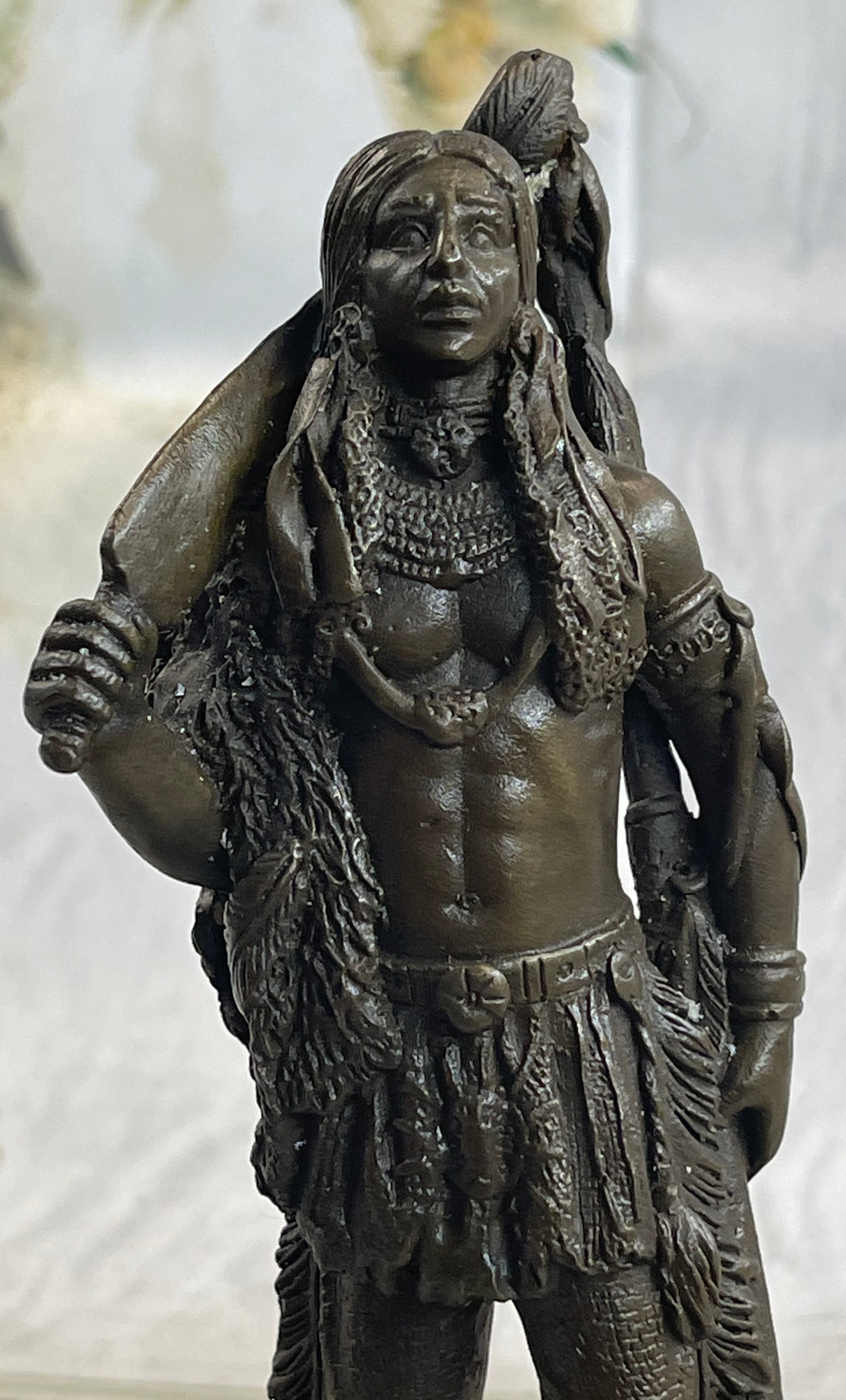 This Impressionistic Sculpture Of The Indian Chief Instills A Since Of Pride, Respect, And Honor. He Holds His Knife Tightly Next To Him Ready To Defend His People At Moment. He Has A Traditional Necklace. His Cloak Drapes Down His Shoulder And Bunches By His Elbow. His Hair Is Braided And Falls Onto His Back, In His Mohawk He Wears Feathers That Stick Out And Blow In The Wind. His Face Is Old And Worn, He Is A Man Of Many Places And Time, And He Can Tell You Stories Of A Thousand Years. This Is A Very Spiritual And Tranquil Piece. This Sculpture Was Casted Using The “Lost Wax Method” And Has A Brown Patina. It Is Handmade And Sits On A Brown Marble Base. This Sculpture Is Signed By The Artist Coypel. This Piece, Crafted By French Sculptor Is A Must-Have That Will Surely Be A Treasure For Years To Come.Bronze Dimensions with Marble Base: Height 9" x Width 4"