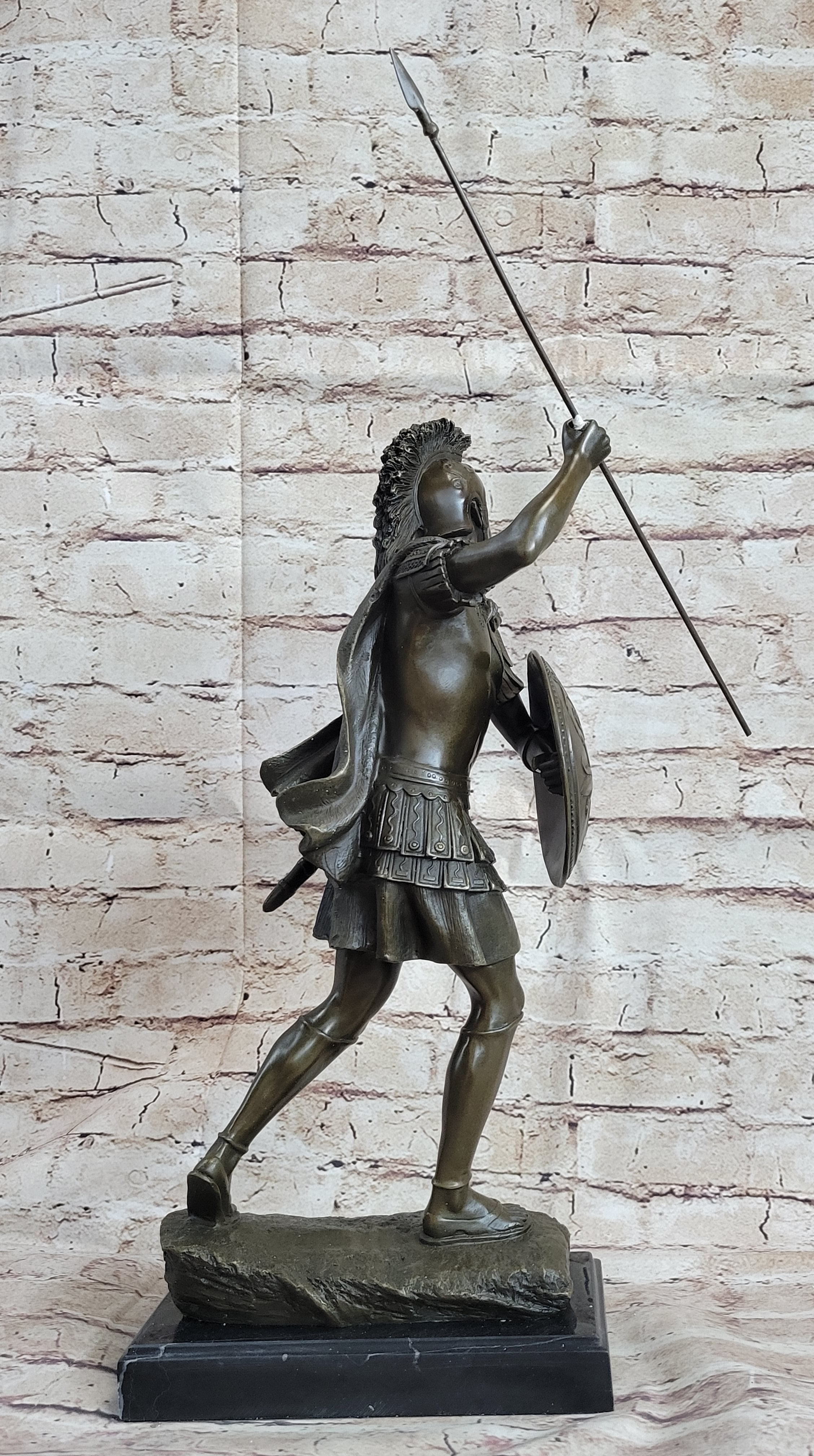 This bronze sculpture of a Roman Legion Soldier captures the strength and nobility of an ancient warrior, paying homage to the legacy of the Roman Empire. Clad in traditional legionnaire regalia, the soldier stands poised, with his gaze cast into the distance, evoking a sense of vigilance and resilience. His helmet, or galea, crafted from bronze, rests on his head, embodying the strength and protection essential for battle.