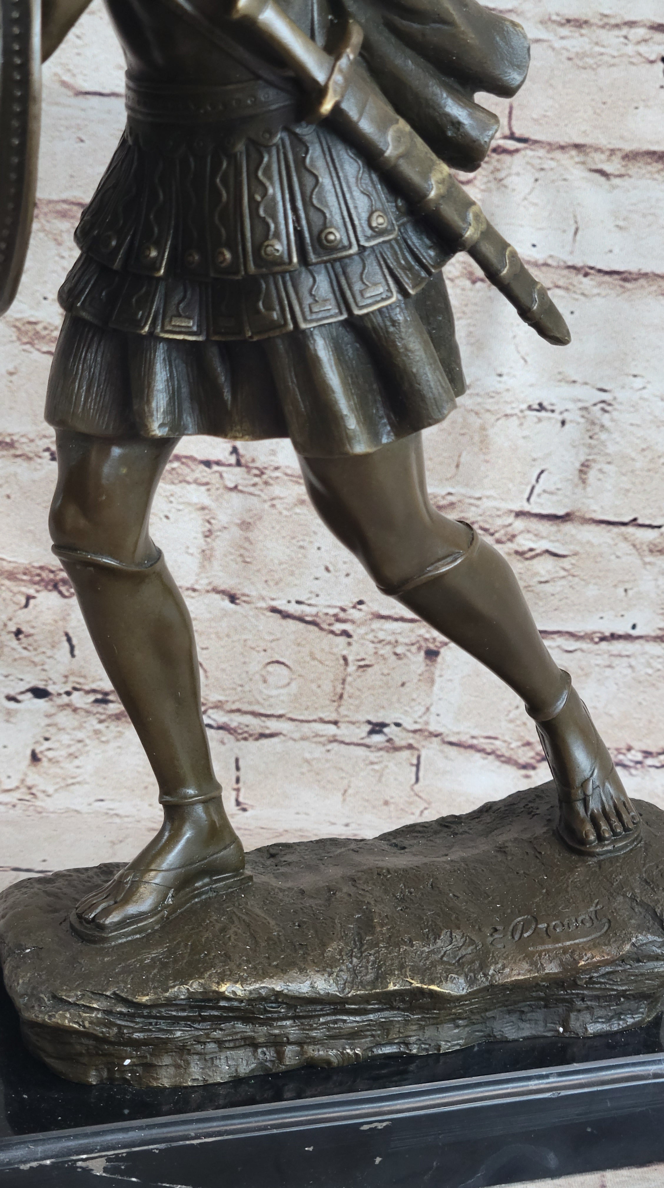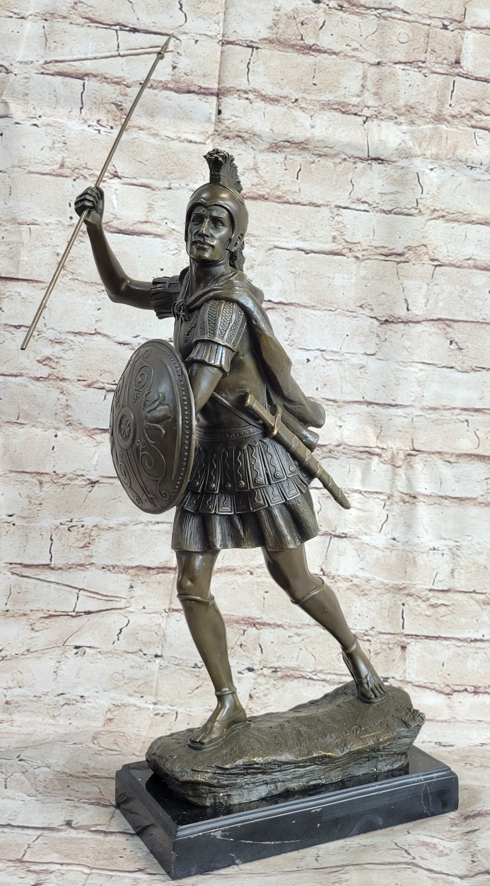 Created using the lost-wax casting method, this handmade bronze sculpture is completed with a unique brown patina finish, lending an authentic, timeworn look to the piece. It is mounted on a polished black marble base with subtle variegation, enhancing the statue’s elegance and stability. Signed by the artist E. Drouot, this masterpiece is an impressive tribute to the valor of Roman soldiers and an exceptional addition to any collection.Bronze Dimensions with Marble Base: Height 17" X Width 11"