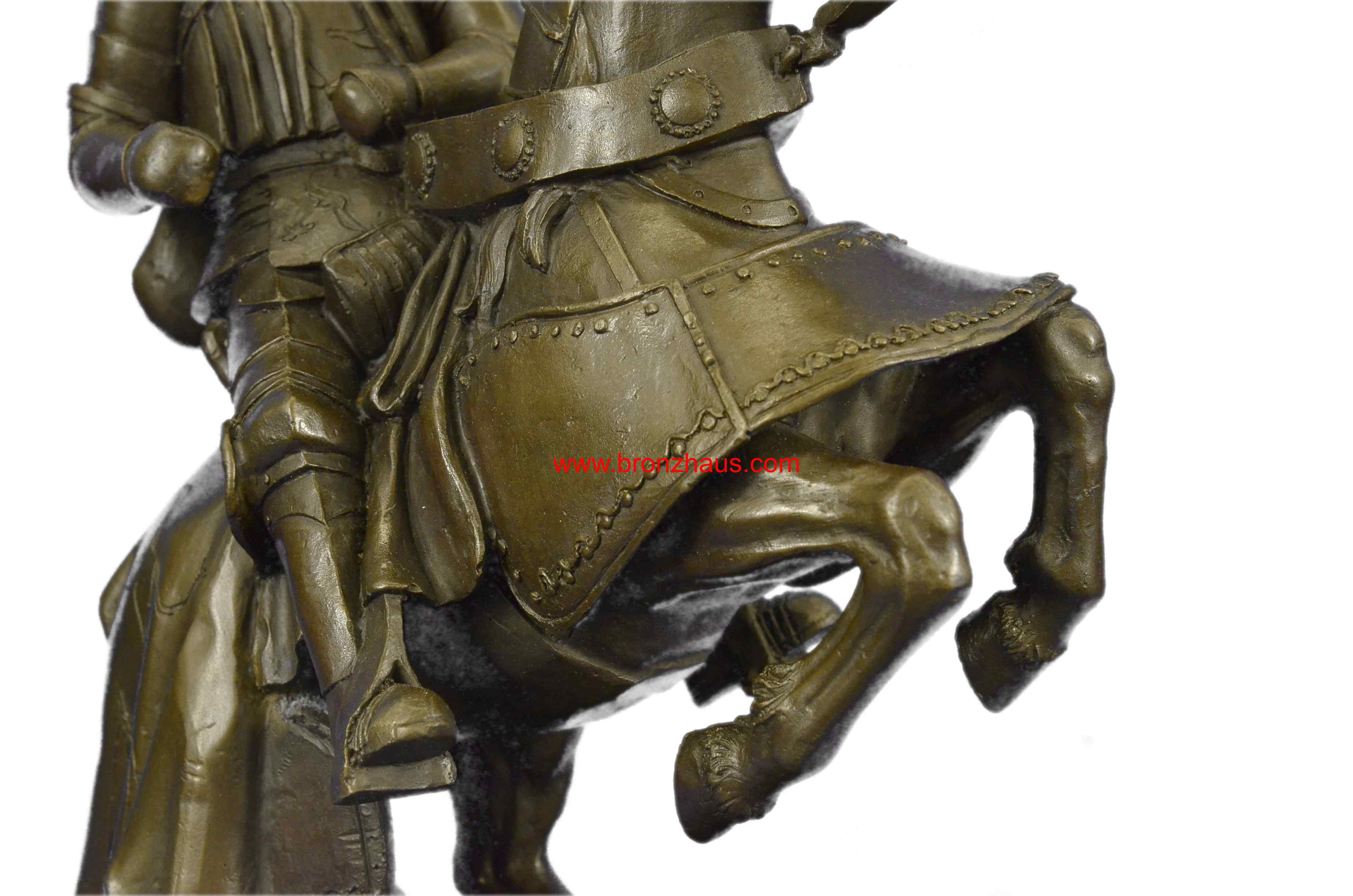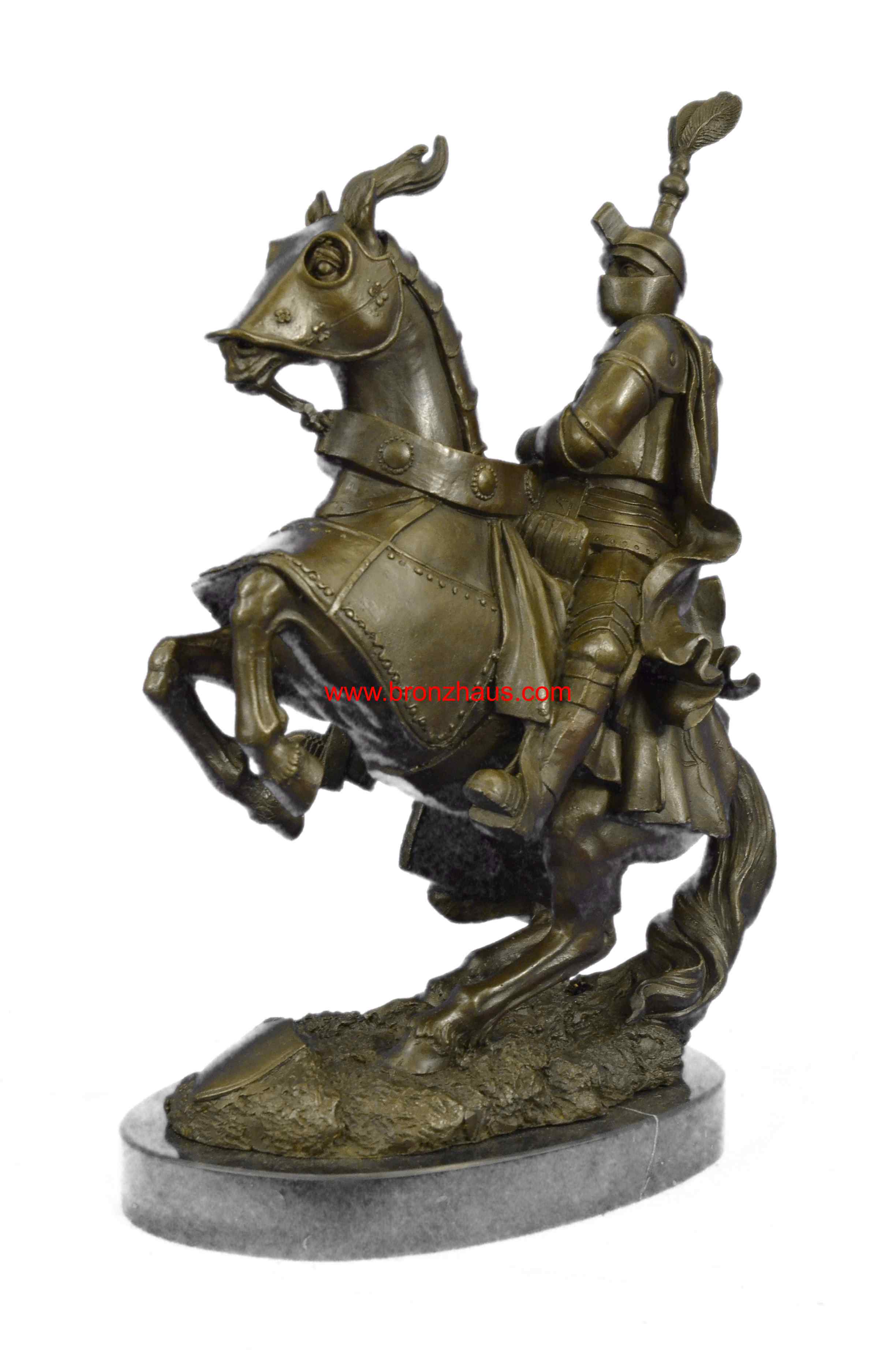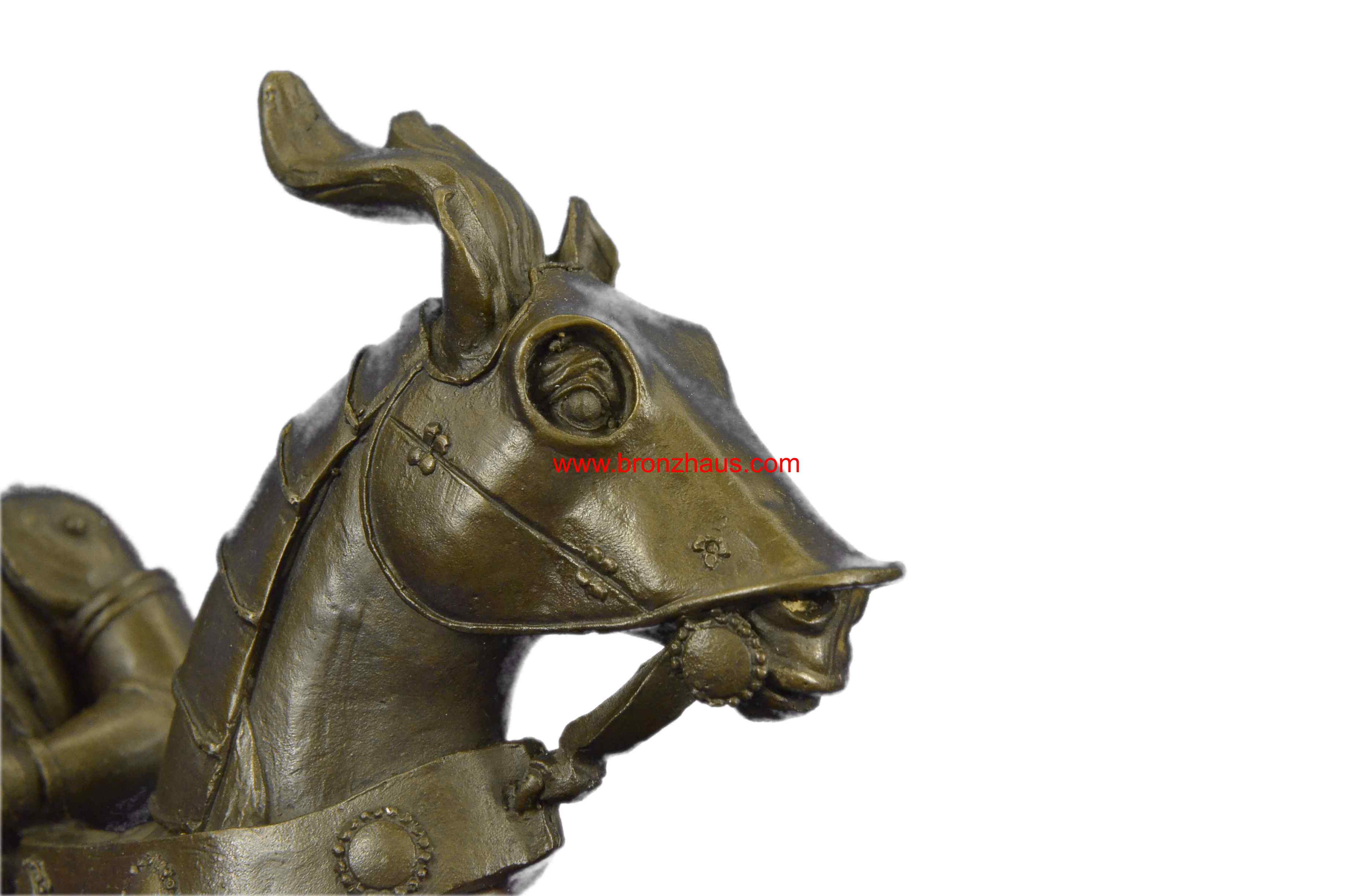 The bold knight, in full plated armor, bolts forward, as he holds onto his valiant stead as it bucks up onto its hind legs. His horse, in full armor as well, takes the rider through field of a battle. They were captured using the age-old method of lost-wax casting and stained with a brown patina finish for perpetuation. The 100% handmade bronze sculpture is mounted upon a black marble base with the artist Kamiko signature.Original or Reproduction: Original
