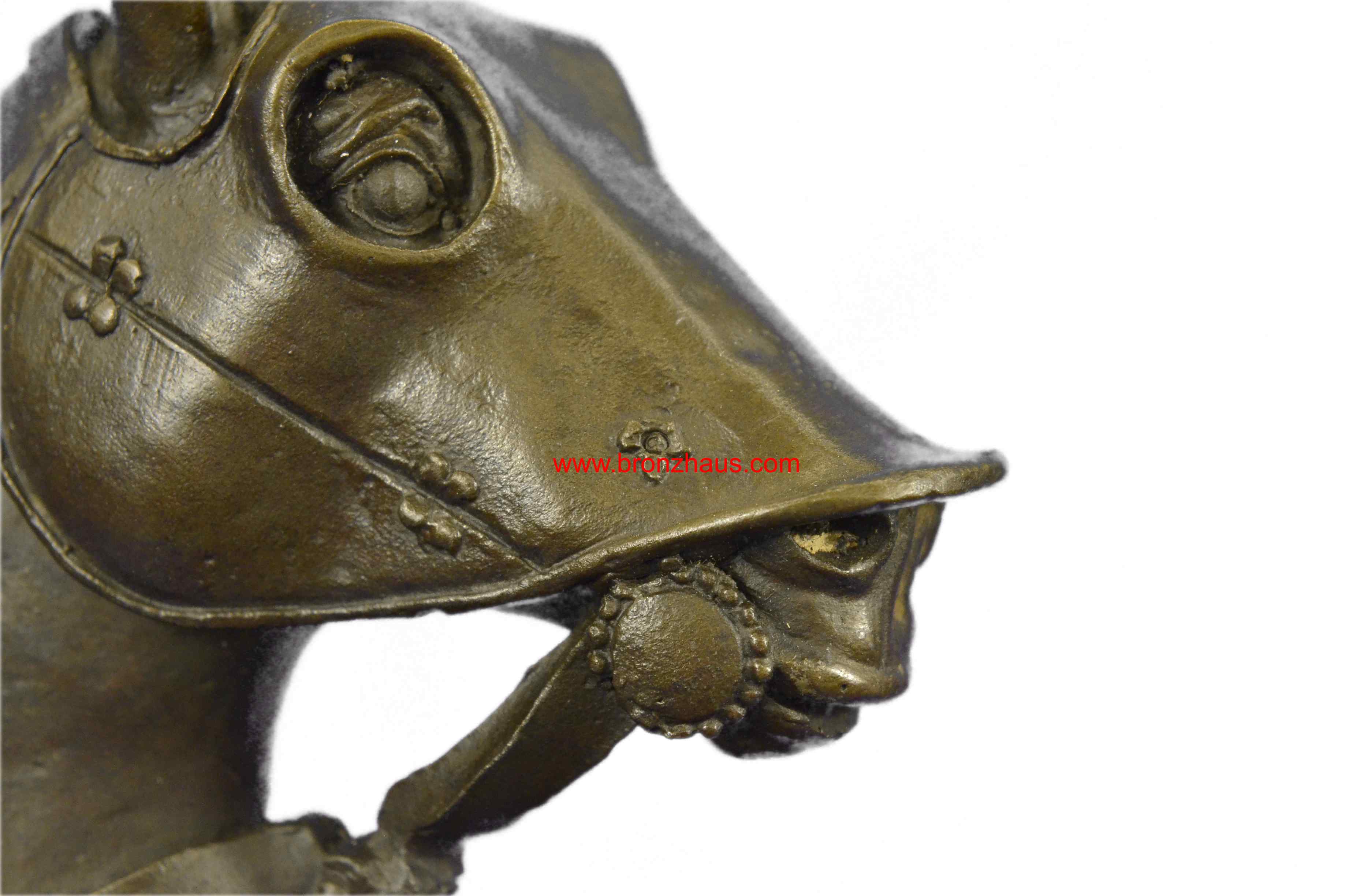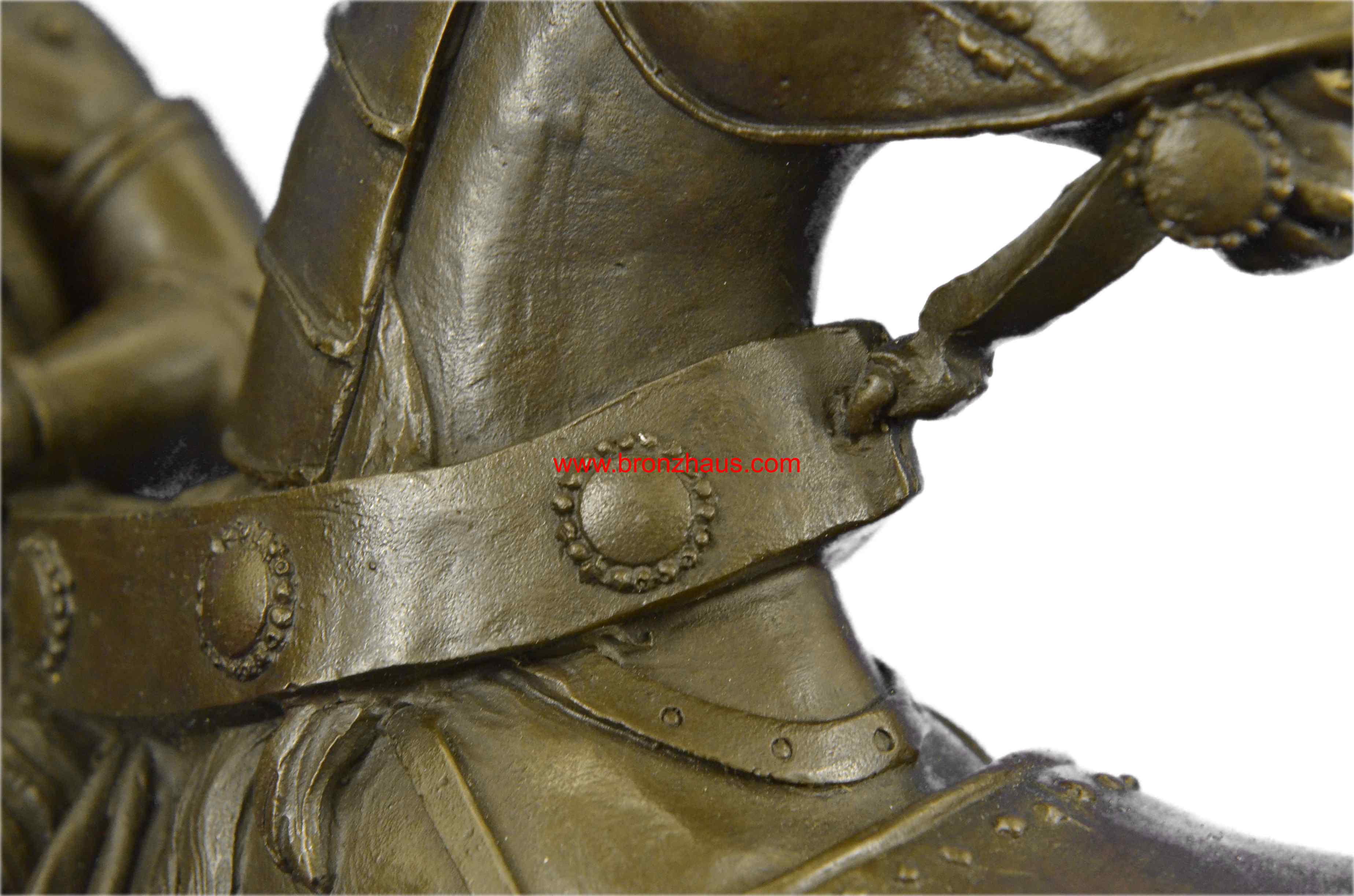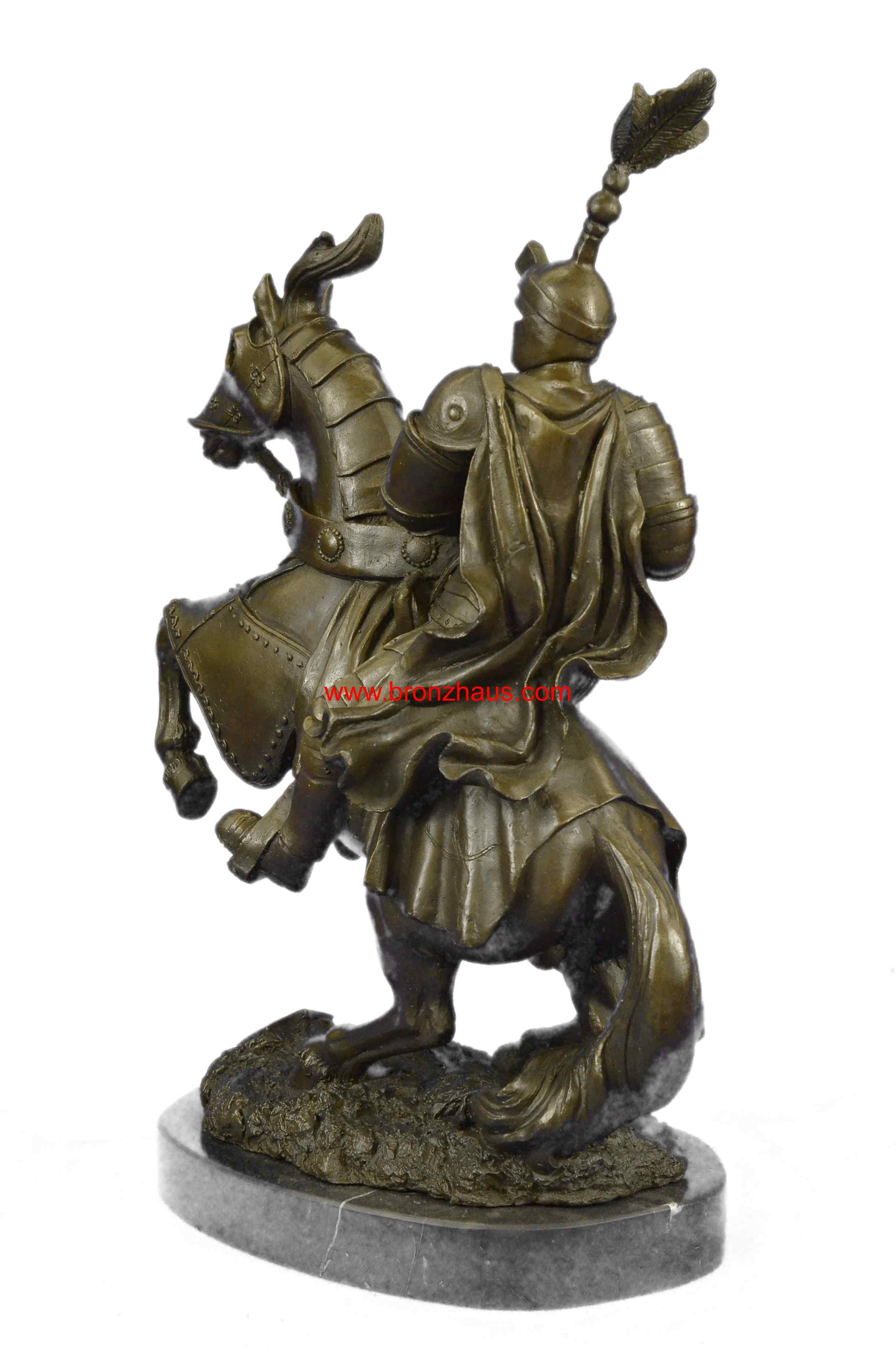The bold knight, in full plated armor, bolts forward, as he holds onto his valiant stead as it bucks up onto its hind legs. His horse, in full armor as well, takes the rider through field of a battle. They were captured using the age-old method of lost-wax casting and stained with a brown patina finish for perpetuation. The 100% handmade bronze sculpture is mounted upon a black marble base with the artist Kamiko signature.Original or Reproduction: Original