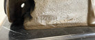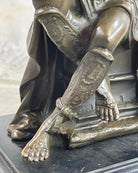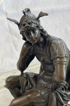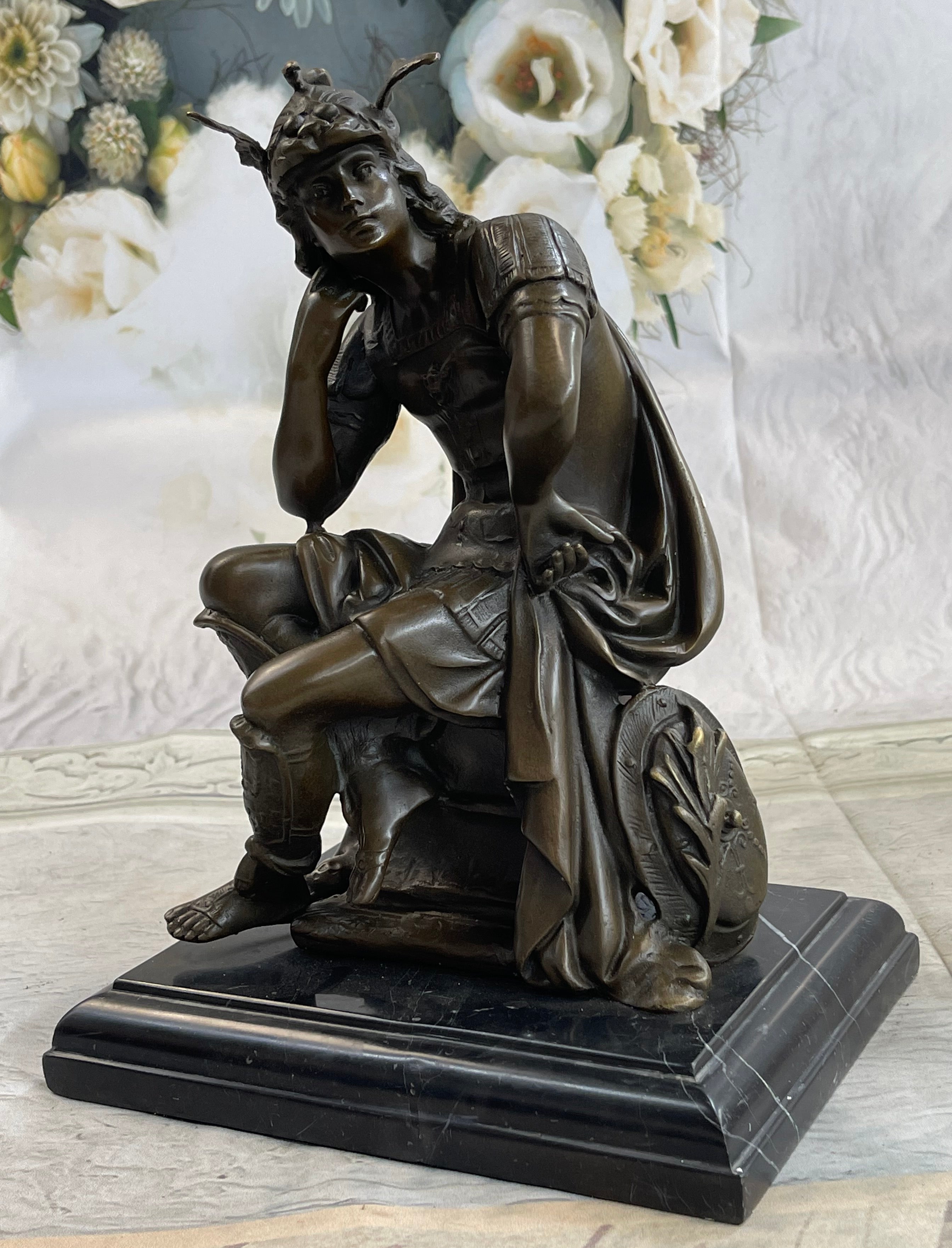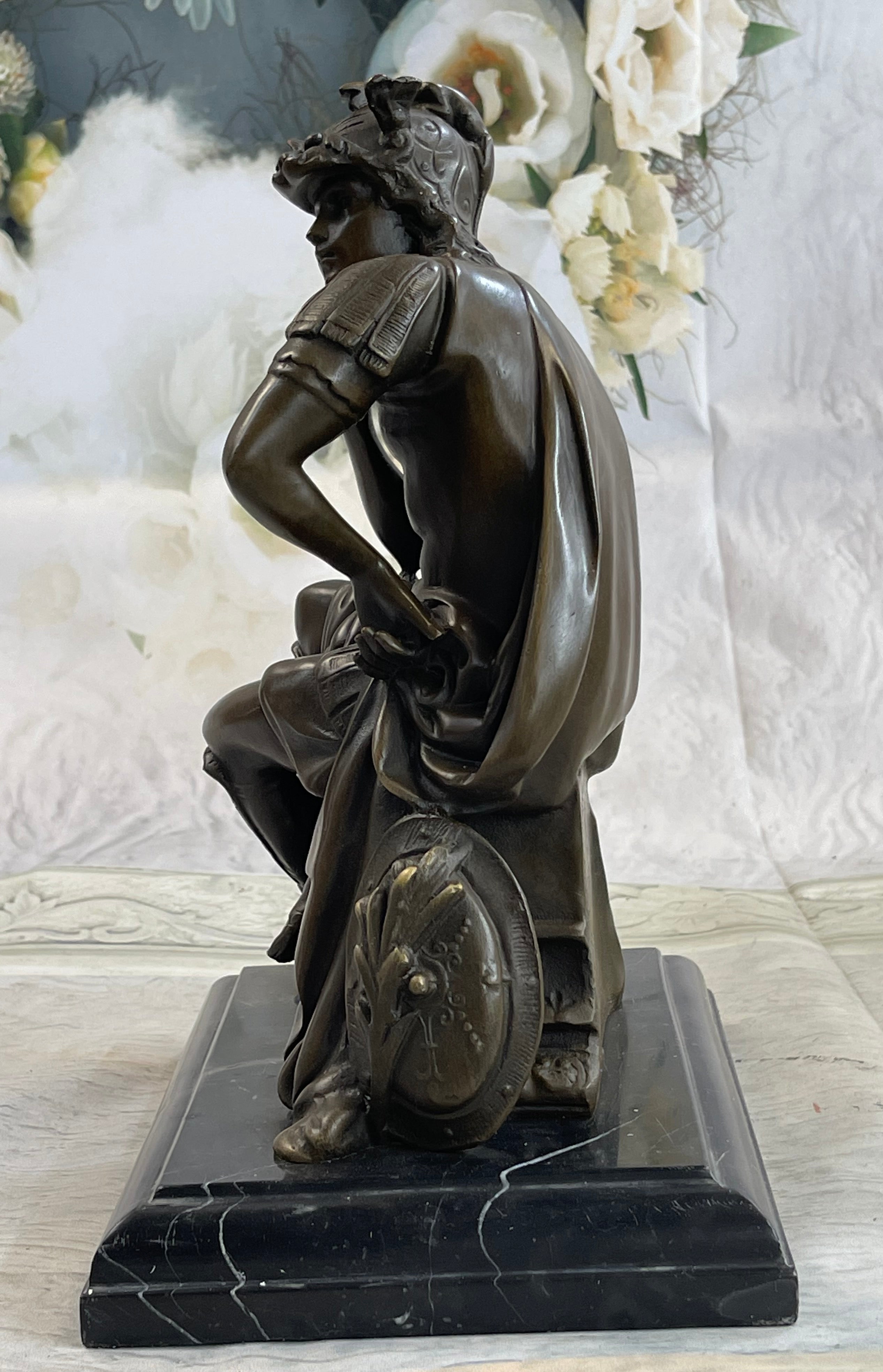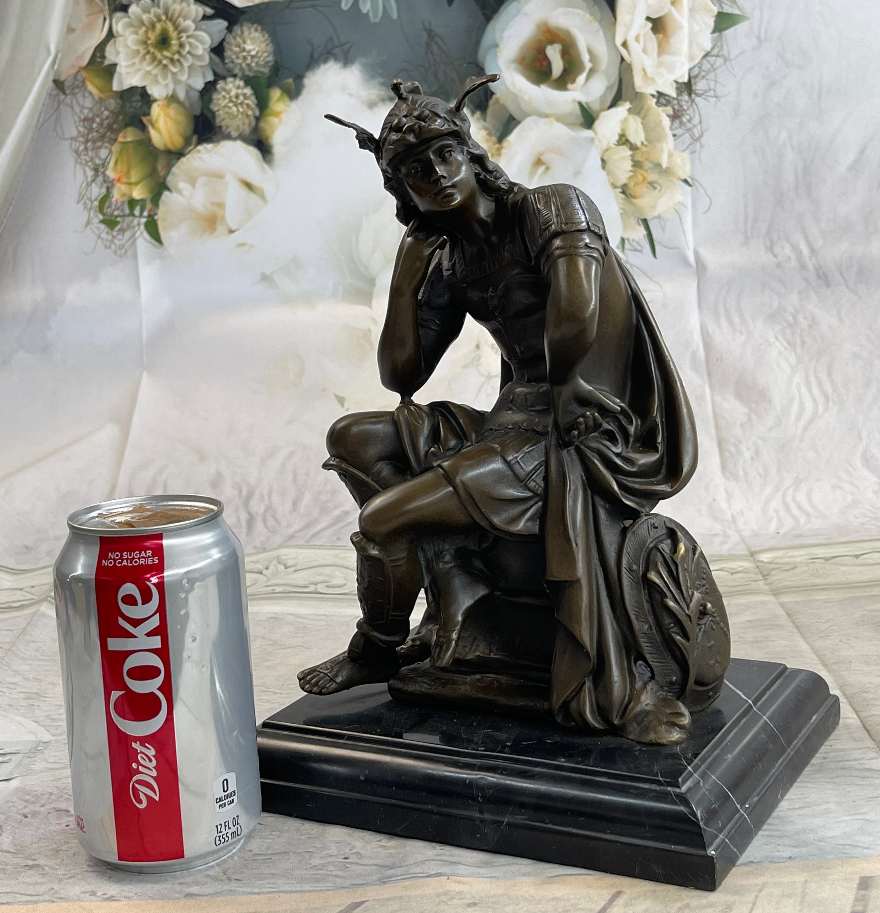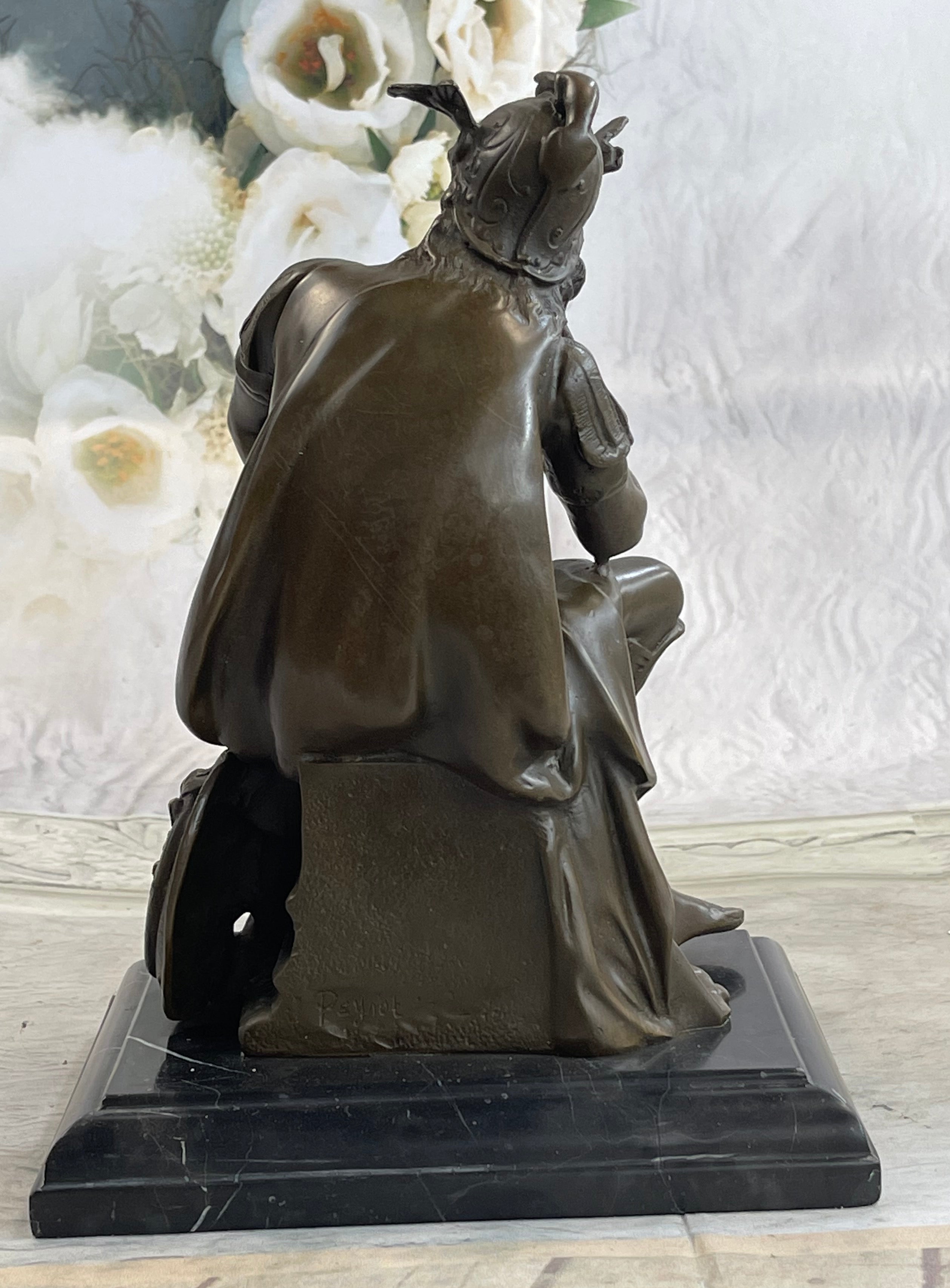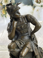 Sitting, contemplating, the Roman Emperor in full armor is waiting for the right time to strike. He wears his helmet which has a serpent on the top and the mouth of a lion trimming the helmet. His armor is covered by his royal cape and his shield rests anxiously against the pedestal he sits on. He has a serious look on his face as he debates on whether to go to war or not. His armor has exquisite detail which lets us know that he comes from royalty. A branch grows out from the base of the pedestal and hides the shield. This sculpture is sure to bring a touch of class to any room. This sculpture was cast using the Lost Wax Method” and has a brown patina. It is mounted on a beveled marble base and is signed by the artist Peynut.Bronze Dimensions with Marble Base:Height 12" x Width 8"