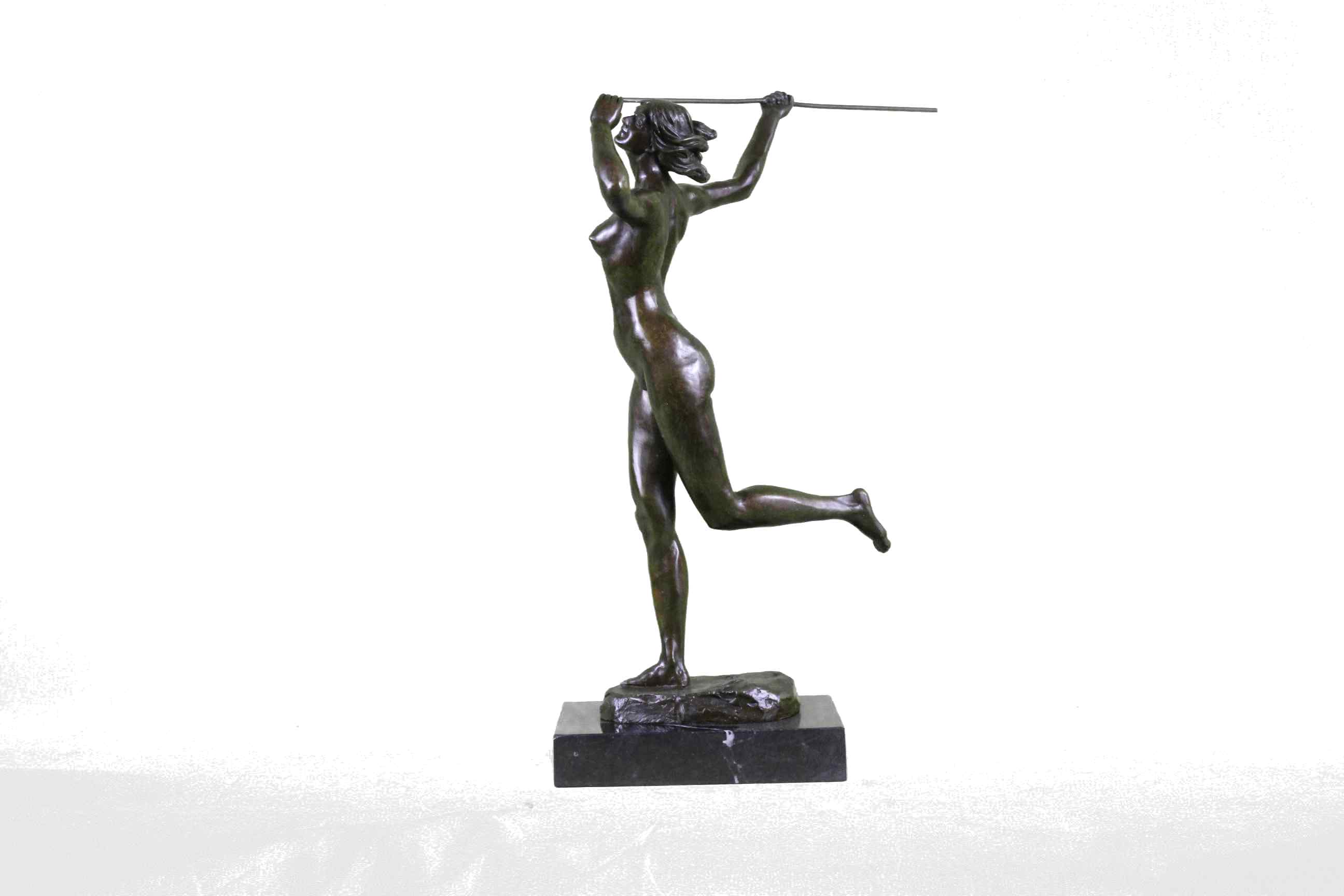 A Sexy And Tough Amazon Warrior Stands Proudly Holding Her Spears. Her Other Arm Is Tense, Highlighting Her Sculpted Arms. Her Large Breasts Are Exposed And She Is Fully Nude. She Is A Fighter In The Wild. She Is Resting On One Feet. . The Sculpture Was Created Using The Lost Wax Method. It Rests On A Black Marble Base. It Is Signed By Italian Artist Aldo Vitaleh.Bronze Dimensions with Marble Base:Height 16" x Width 12"