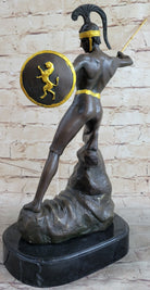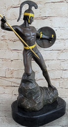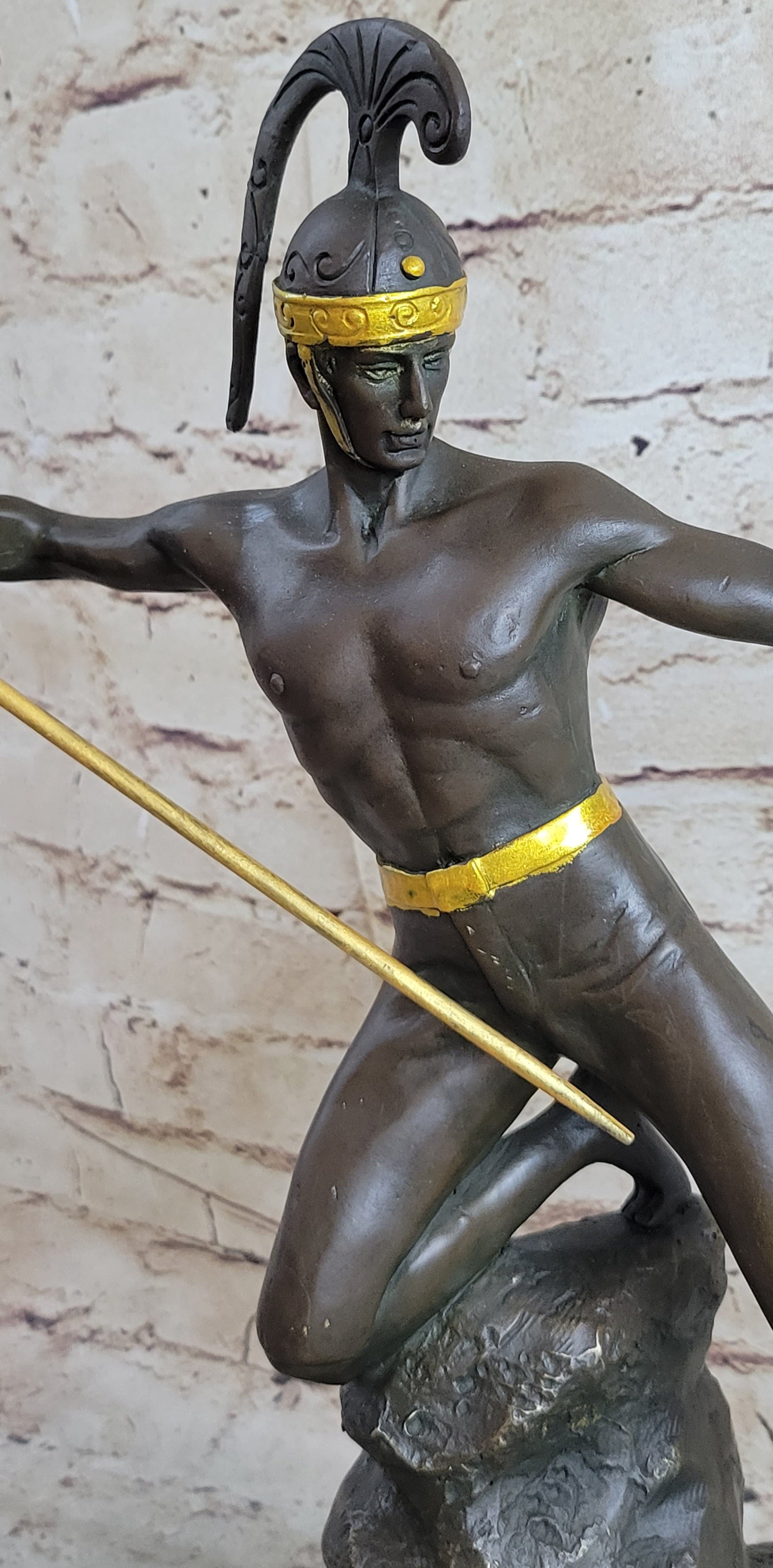 Meticulously cast using the "Lost Wax Method," this sculpture ensures precise and intricate details. Every aspect of the warrior's features, from the armor to the expression, is rendered with exceptional skill and craftsmanship. The bronze is enhanced with a rich brown patina and gold accents, highlighting the fine details and adding a touch of elegance.