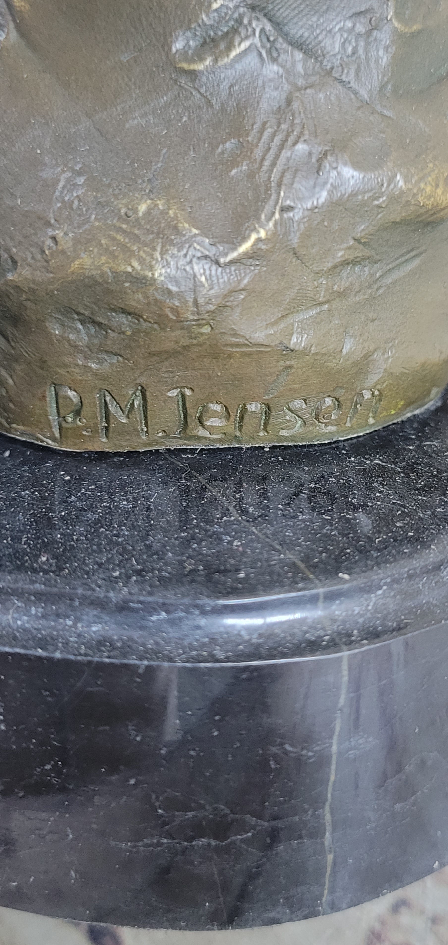 The Roman Warrior Bust is 100% bronze and 100% handmade, signed by the artist D.M. Jensen. This signature adds to its quality and value, marking it as a unique work of art. Whether given as a gift or added to a personal collection, this sculpture stands as a testament to the enduring appeal of classical artistry and superior craftsmanship.Bronze Dimensions with Marble Base: Height 16" X Width 10"