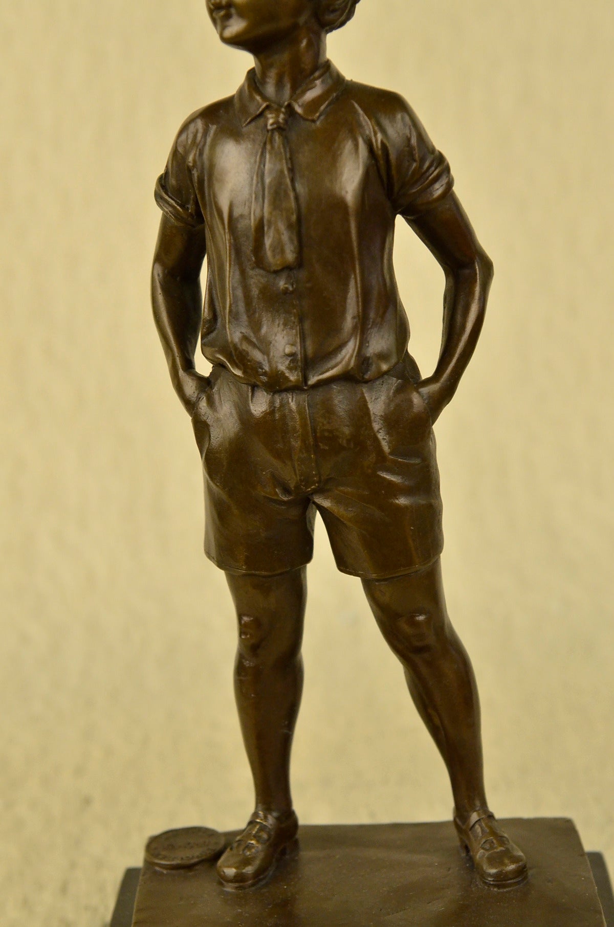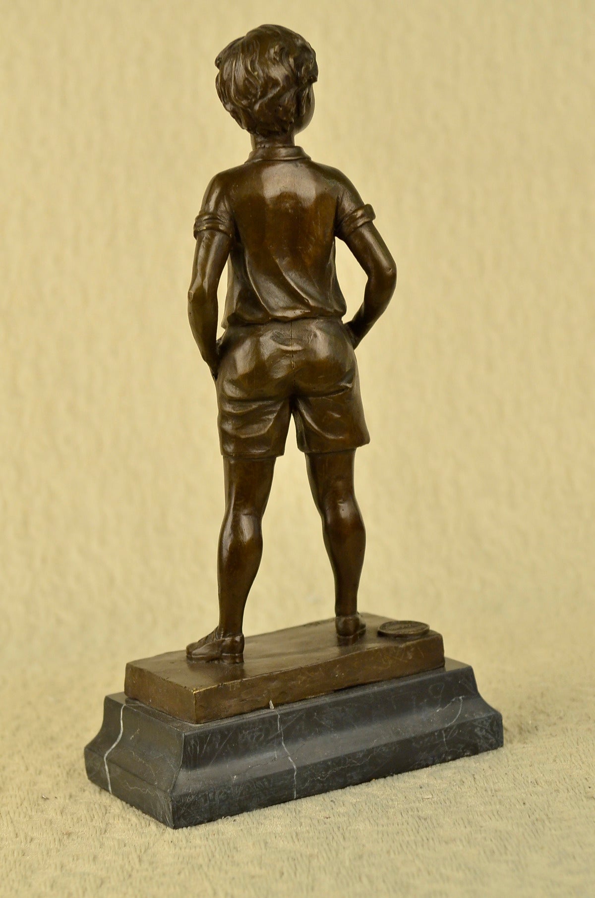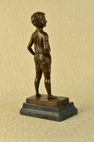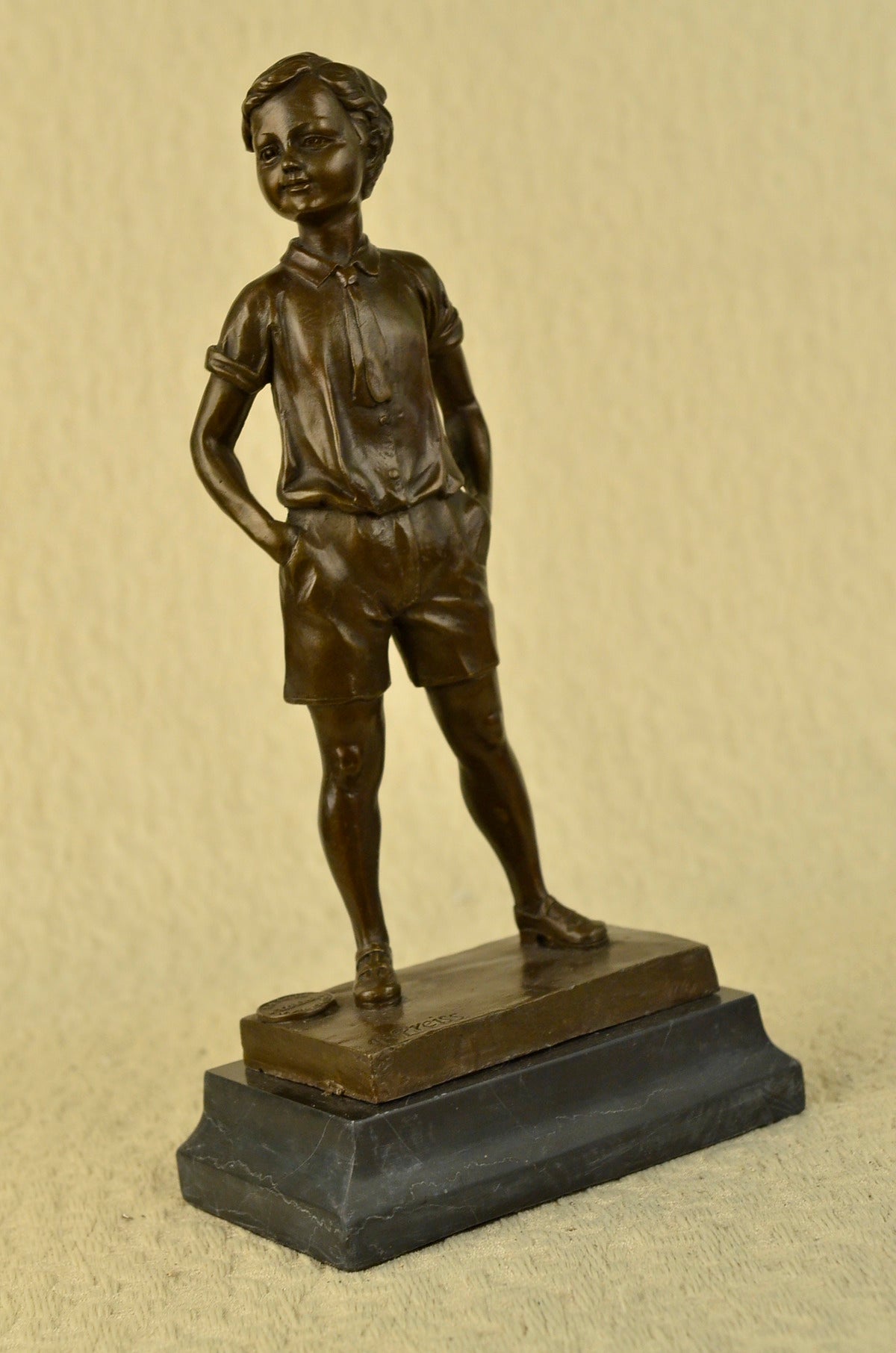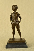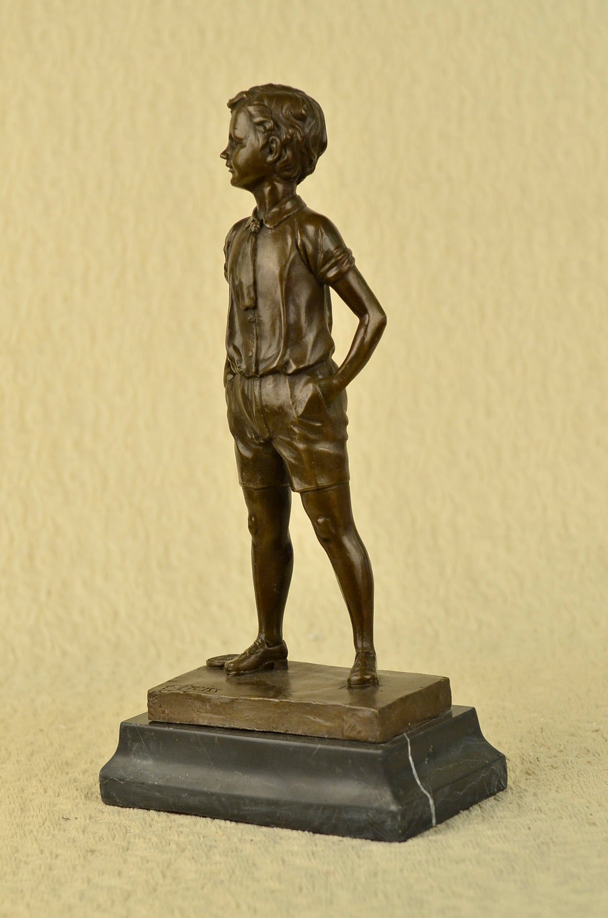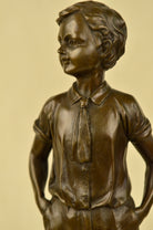 This lovely bronze sculpture features a young boy poised in a youthful stance. He smiles while dressed in an adorable bow tie and jacket. The artist has truly captured the innocence and youth that children bring to the world. One can not help but to smile at this beautiful work of art.The handmade bronze sculpture was cast using the archaic method of lost-wax casting and stained with a brown patina finish for perpetuation. He is mounted upon a black marble base with the artist Preiss signature.Bronze Dimensions with Marble Base:Height 14" x Width 7"