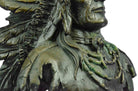 This is an exquisite bronze bust of a Native American warrior chief. He stares at the beholder, wild and bold, with an air of spiritual resilience. His hair is adorned with braids that are wrapped with strips of deer hide coated with a turquoise patina. A long feather lost in the back of his hair stretches towards gravity also finished in a turquoise patina. He wears a bone breastplate which was a popular chest ornament or armor. Since the hair-pipe bones were difficult and expensive to obtain, the number of bones in the plate often indicated the wealth of a warrior. Such breastplates were worn on occasion in battle, but could be penetrated easily by an arrow or a bullet, so they were mainly a decorative or medicine item. The sculpture was molded using the archaic method of lost-wax casting with skin tones finished in a brown patina stain for perpetuation. The chief is mounted upon a black marble and is signed C.M Russell